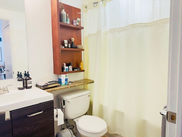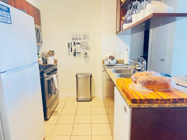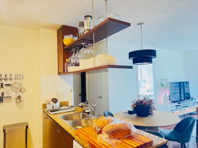 Waterfront living - prime location! Step out your door and enjoy walking access to the rogers centre, cn tower, the lakefront, and more. This open and spacious unit offers approximately 702 sq ft of well-designed living space, featuring stunning unobstructed west-facing lake views from your private walk-out balcony. Enjoy floor-to-ceiling windows that flood the space with natural light, along with sleek laminate flooring throughout. The extra-large den is versatile and can easily function as a second bedroom or a comfortable home office. The bedroom is generously sized and includes double closets for ample storage. The modern kitchen is equipped with granite countertops, a double stainless steel sink, stainless steel gas stove, fridge, built-in microwave, and dishwasher. Additional features include ensuite washer and dryer, one parking space, and all utilities included (gas, water, electricity, and heat).
