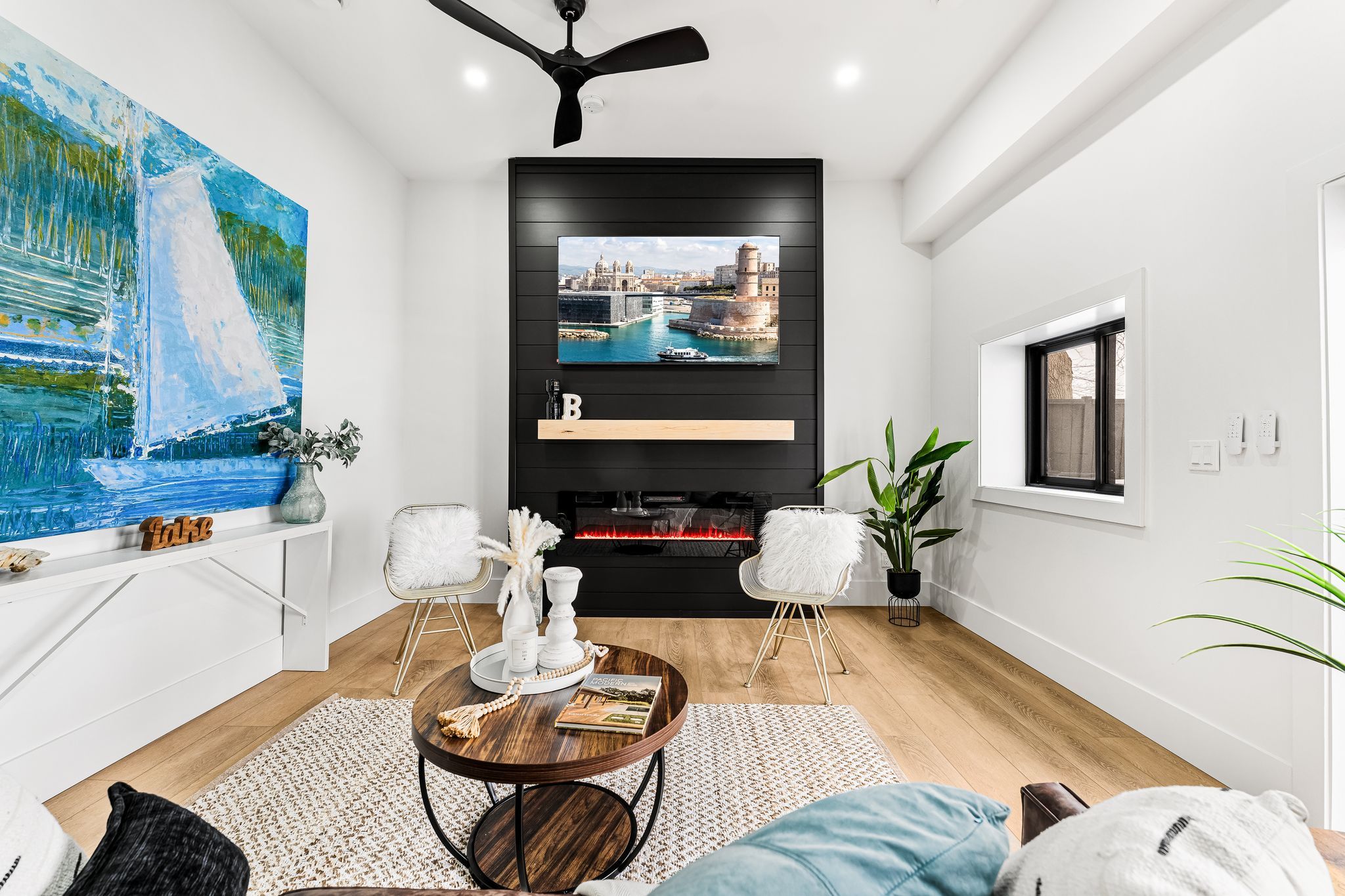 • Sunken living room with a fireplace and seamless indoor-outdoor flow.