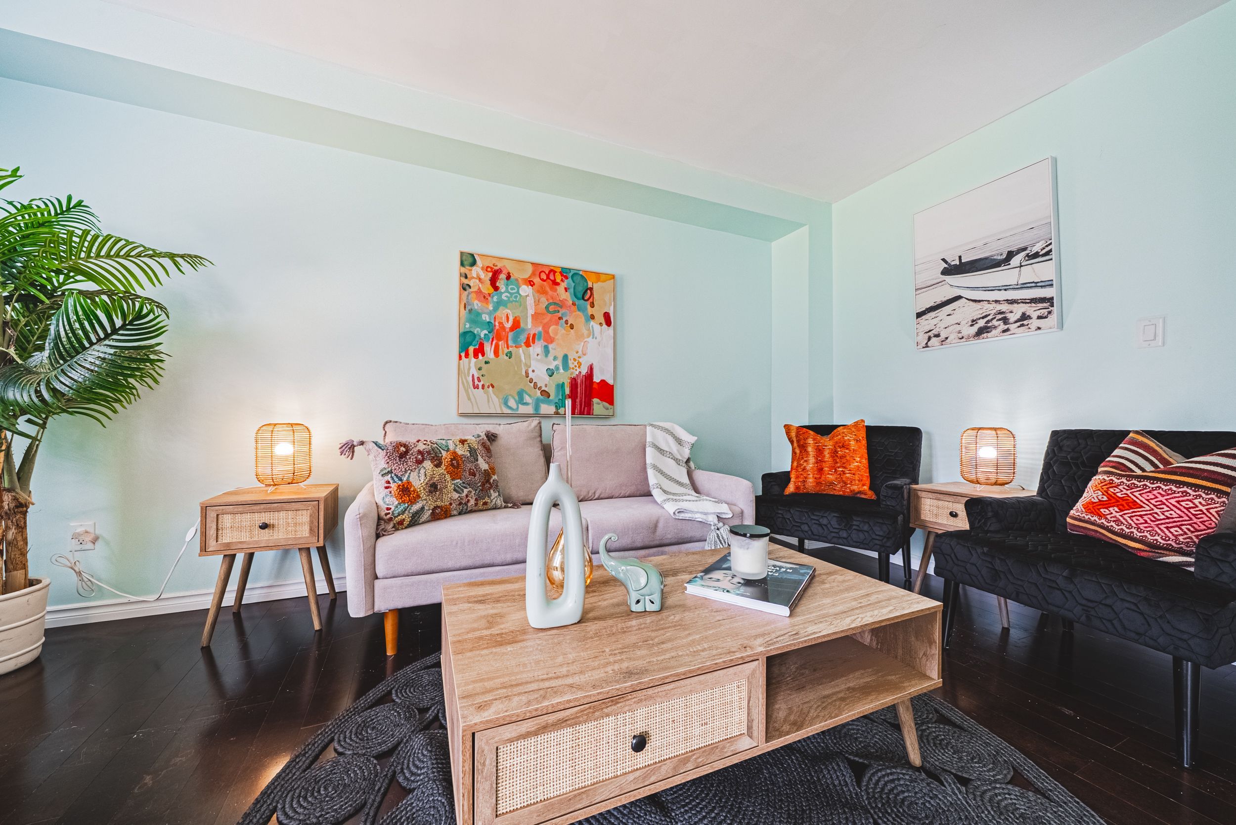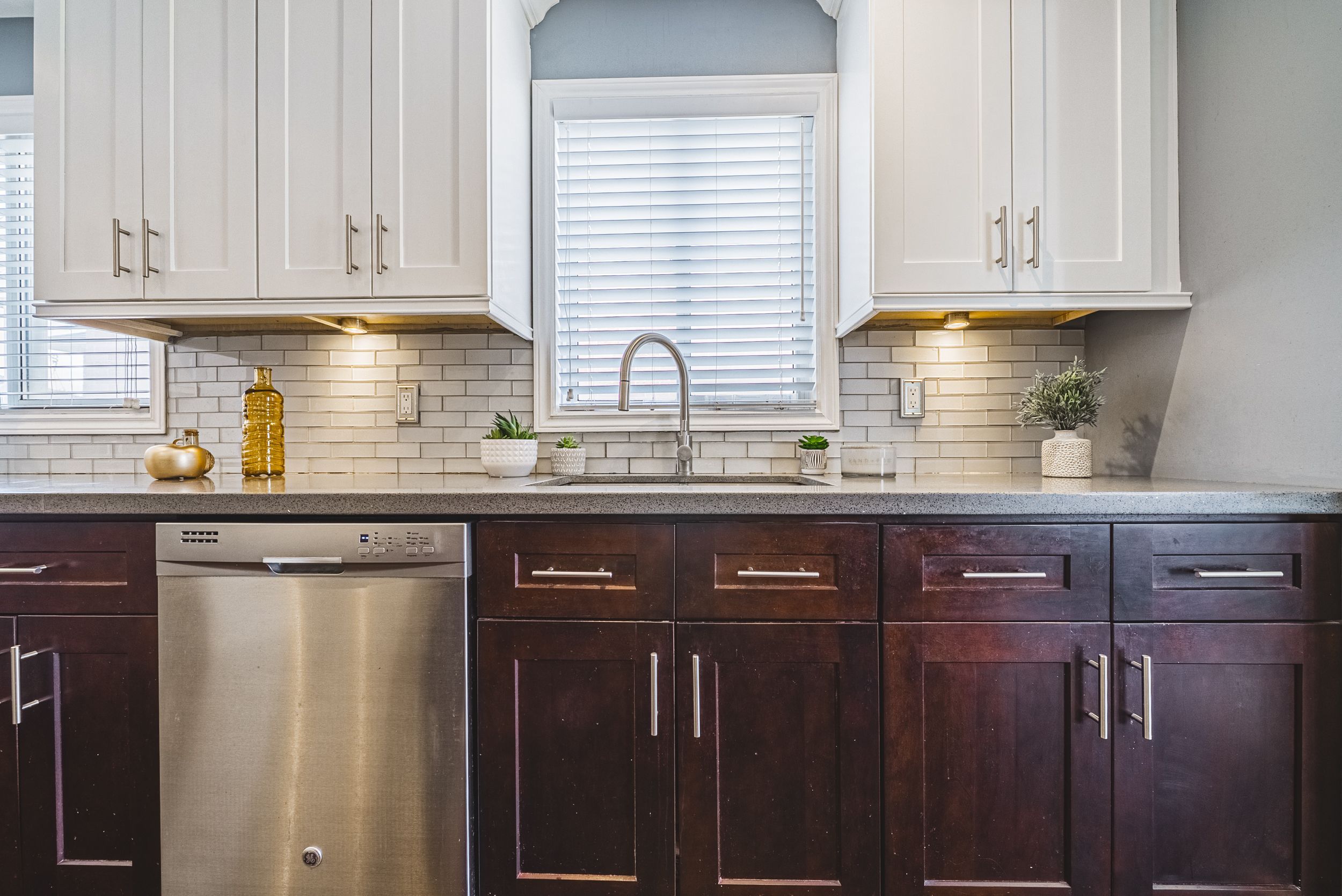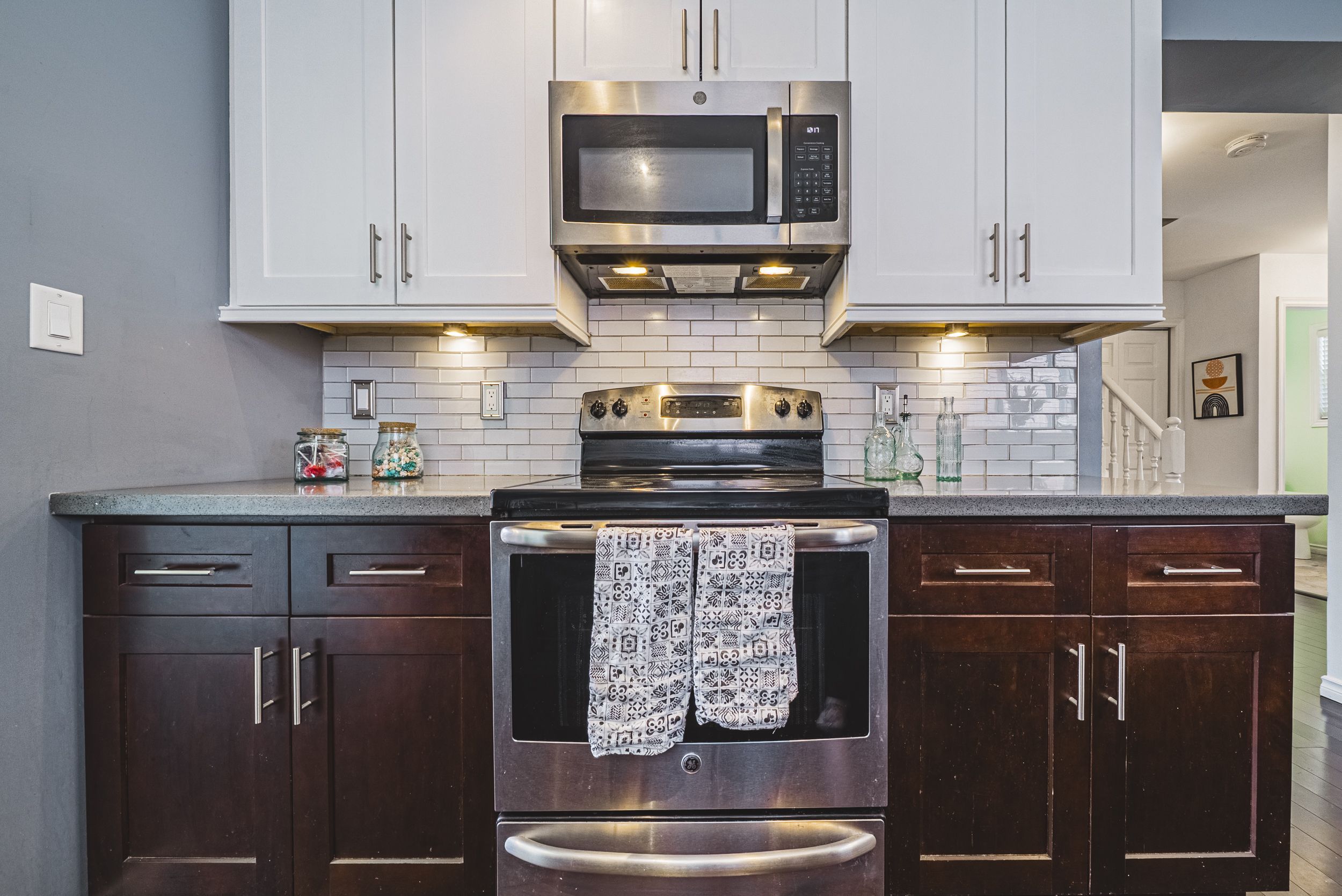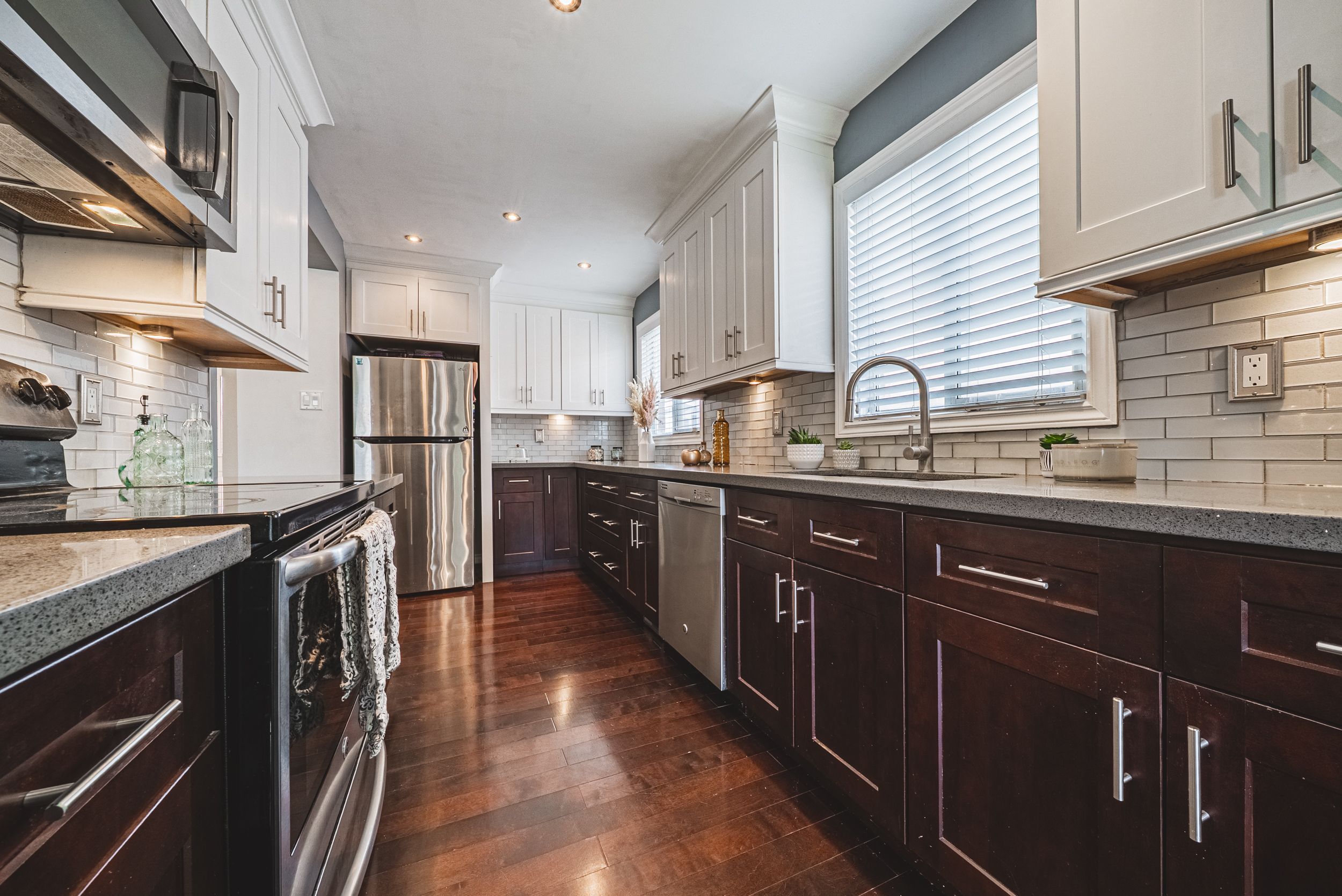 • Stylish two-tone kitchen with quartz countertops and stainless steel appliances.
