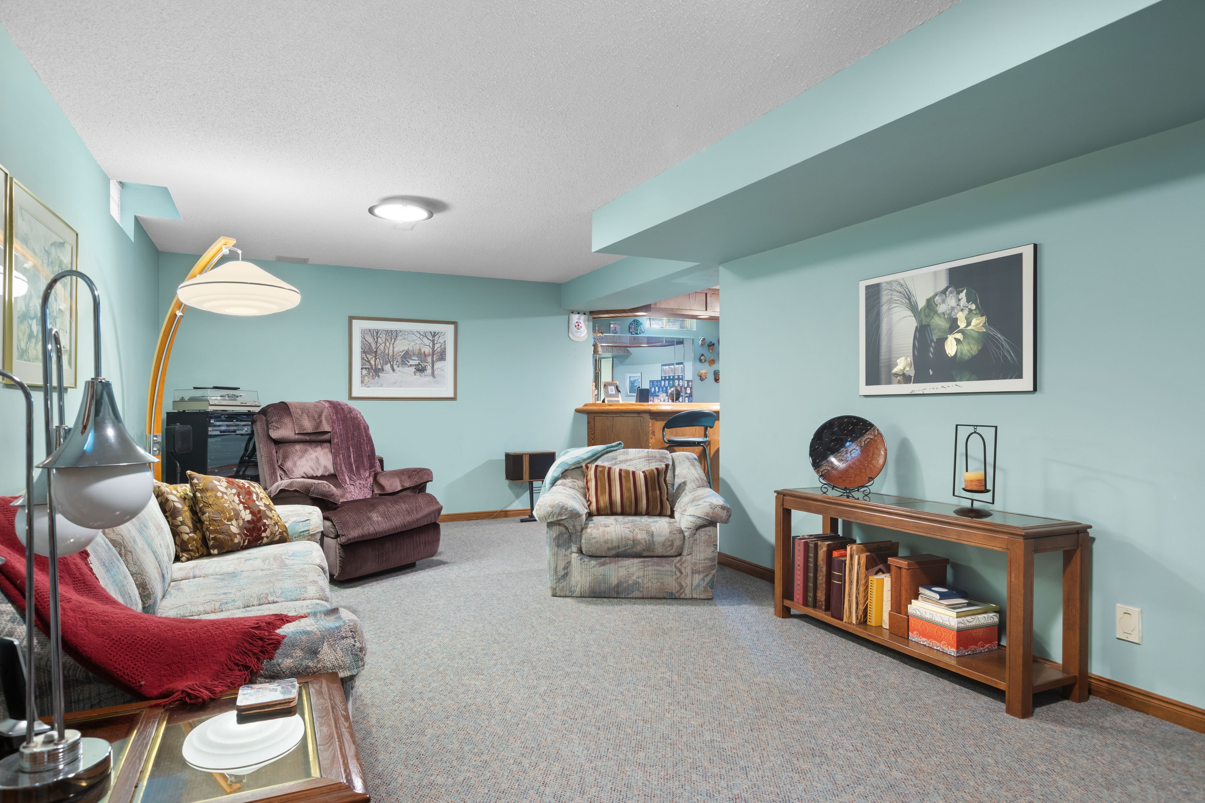 • Fully finished basement with a large rec room and built-in bar.