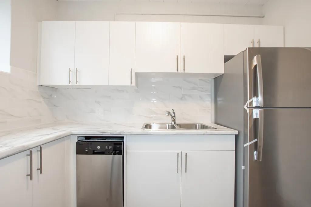 • Modern kitchen with stainless steel appliances including a dishwasher.