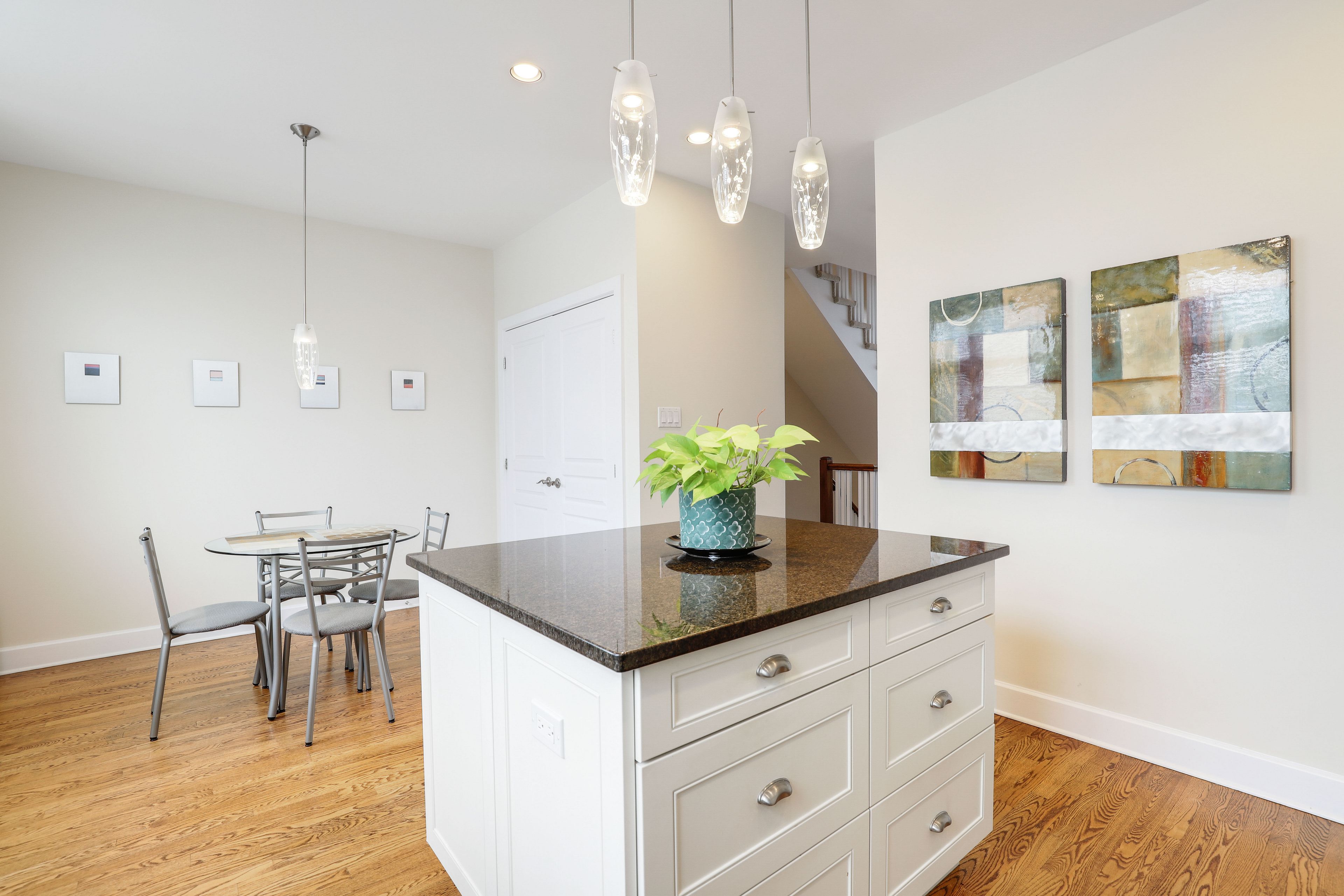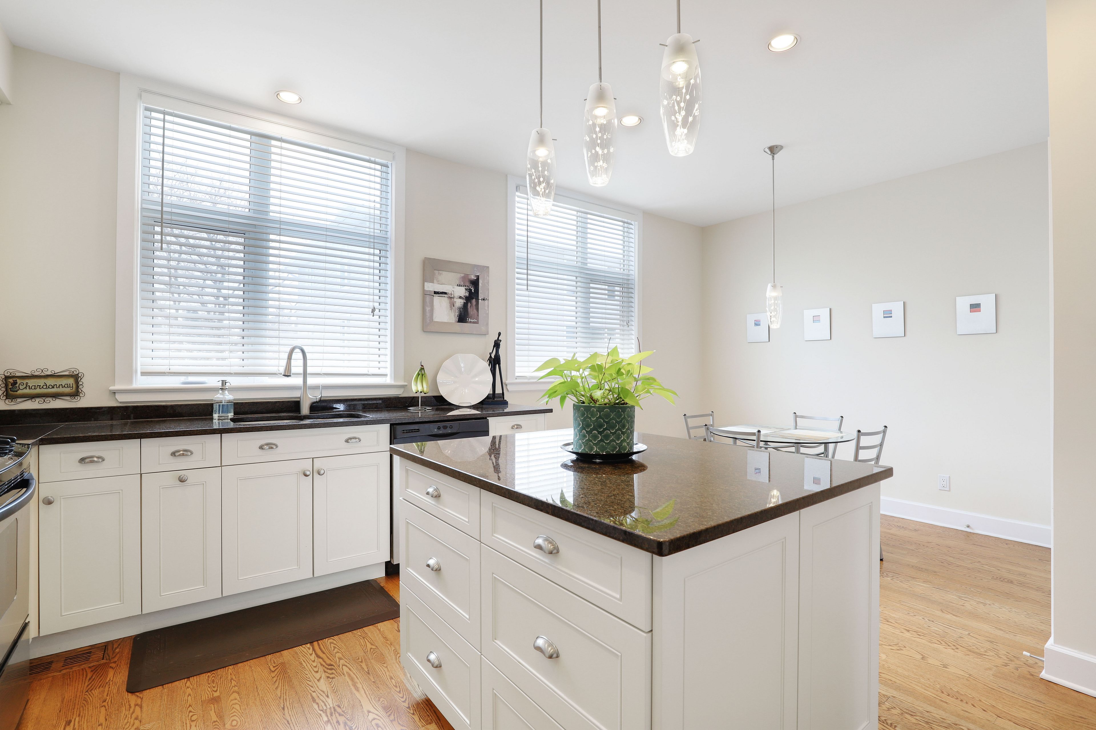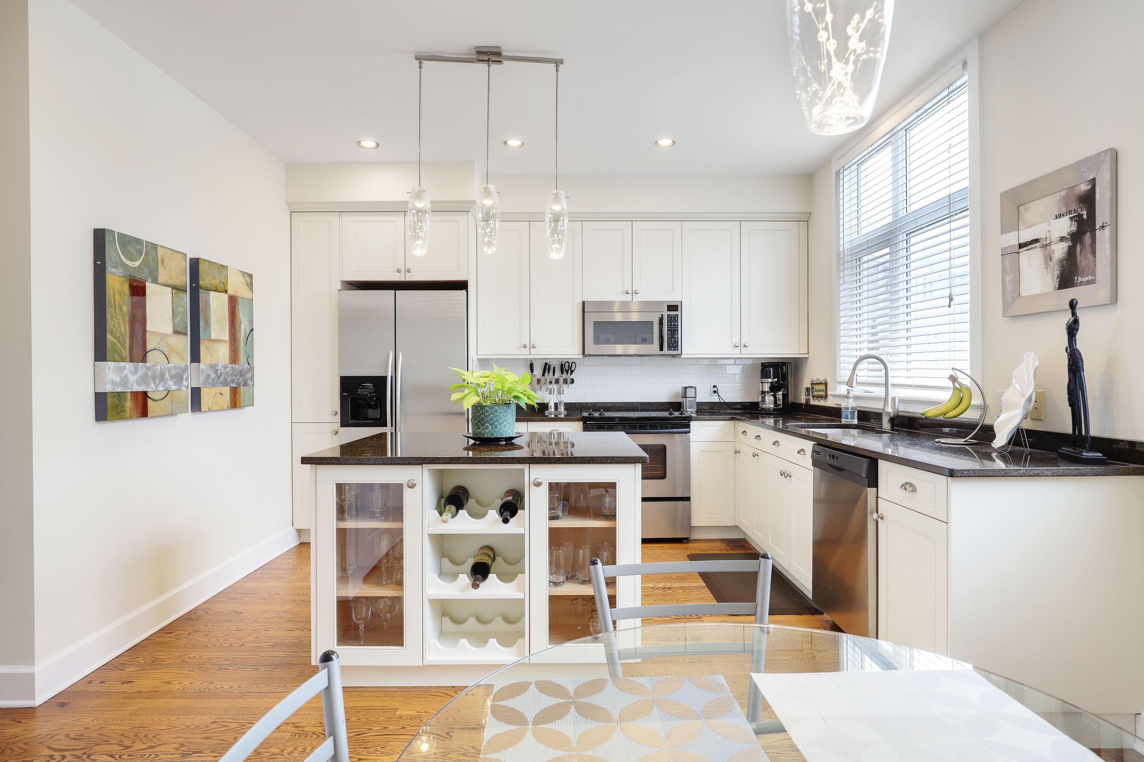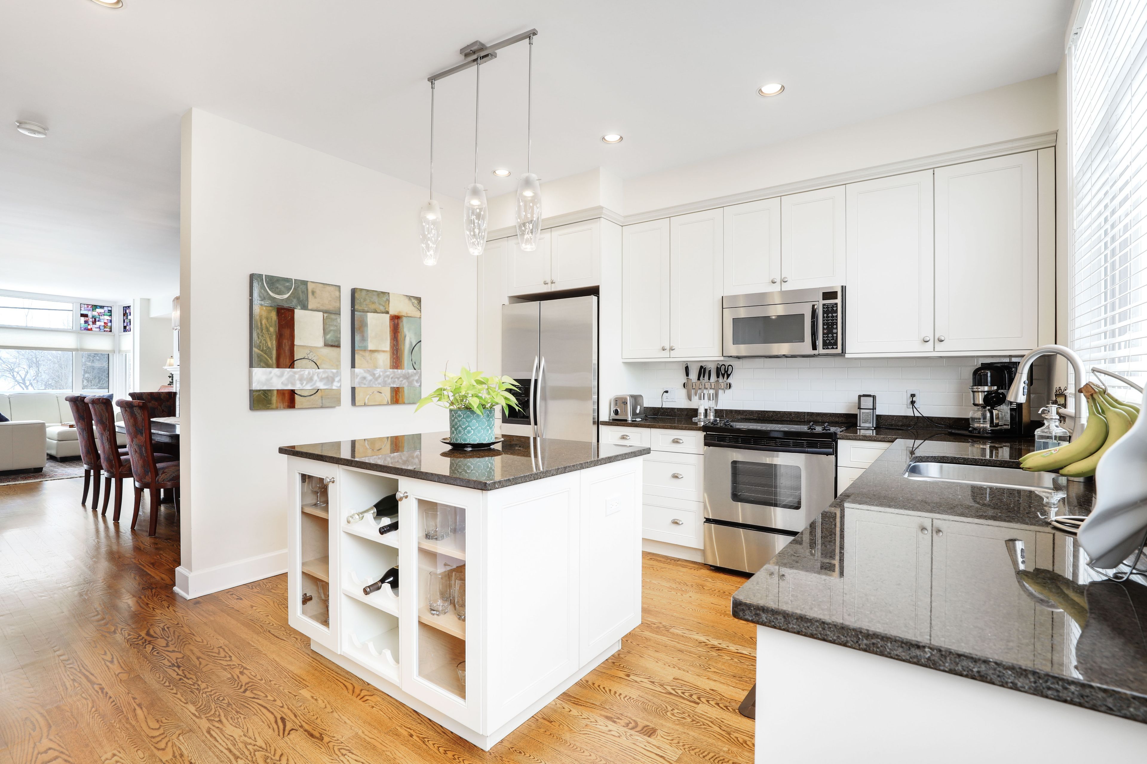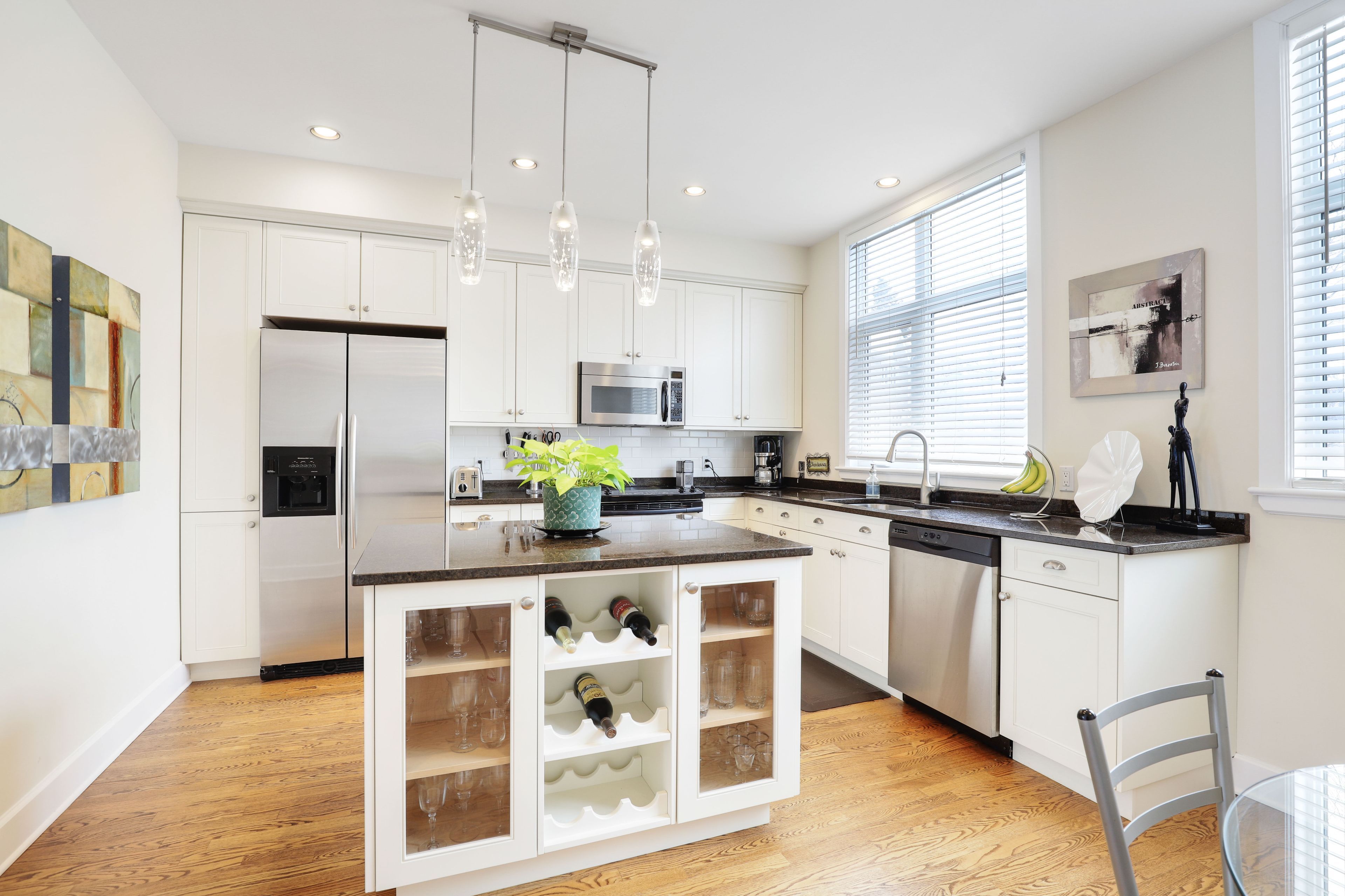 • Kitchen features granite island, stainless steel appliances, and pantry.