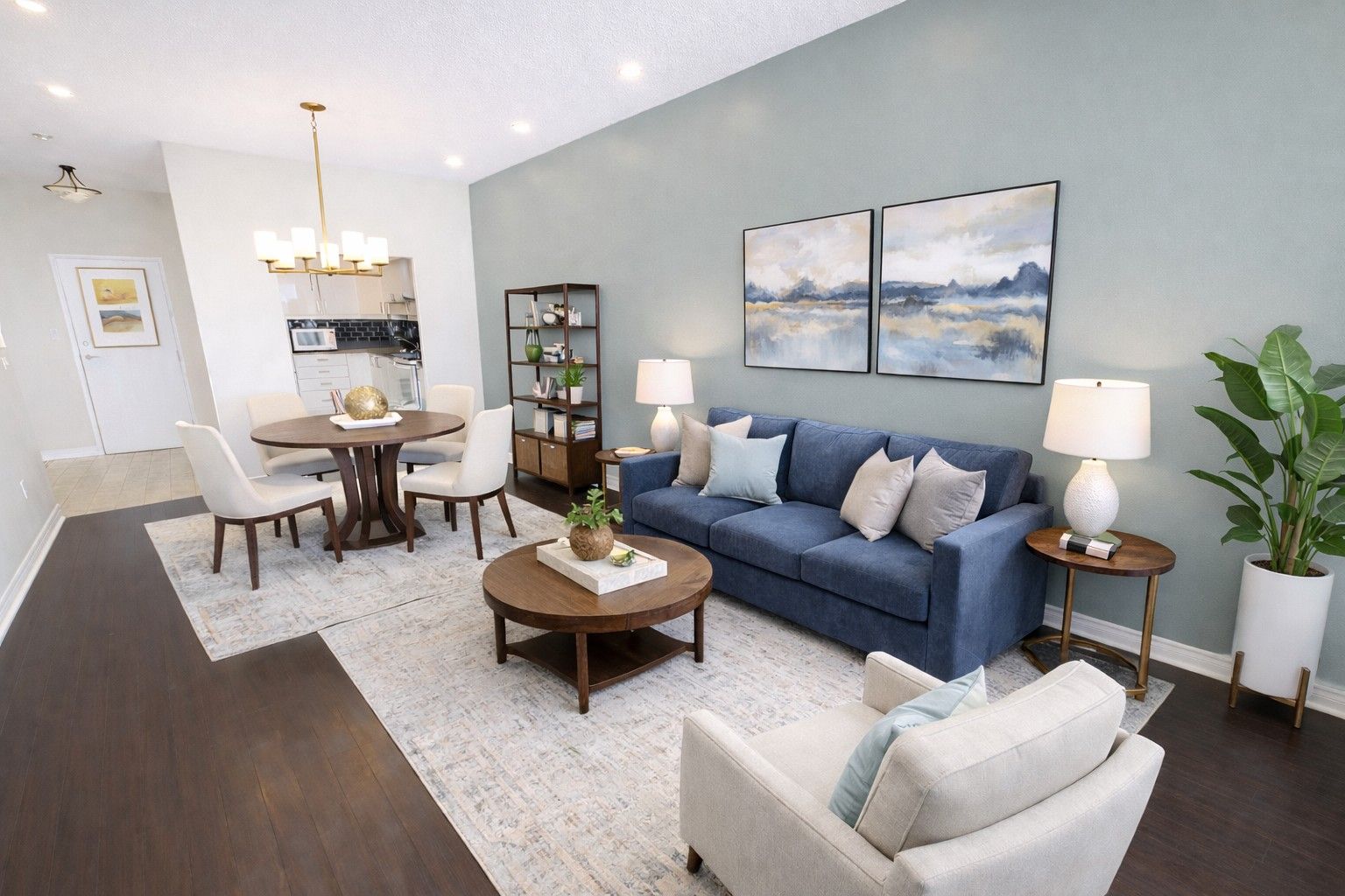 • Bright open-concept living area with high ceilings and natural light.