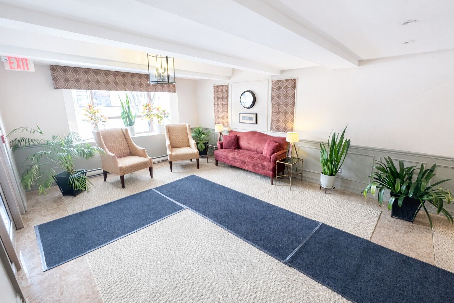 • Building amenities include exercise room and community space.