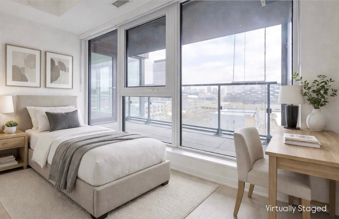 • Bright 6th-floor unit with floor-to-ceiling windows and urban views.
