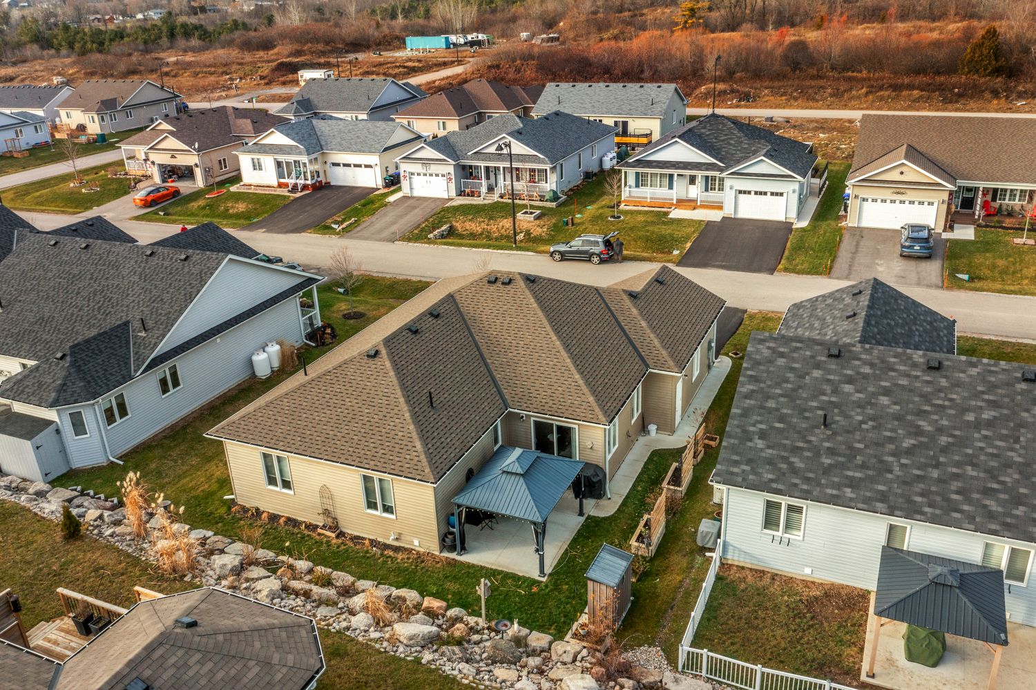 Welcome to lake point village, a vibrant adult community offering an array of activities including game nights, book clubs, sewing groups, and more! Ideally situated near beaches, provincial parks, schools, and only 15 minutes from orillia and casino rama, this location has it all. This beautifully upgraded bungalow features an inviting enclosed front porch with storm windows, perfect for enjoying your morning coffee. This bungalow showcases upgraded flooring, modern lighting, stylish window coverings, and a custom fireplace. The open-concept layout seamlessly connects the living room, kitchen, and dining area. The spacious living room features a custom fireplace and large windows that fill the space with natural light and a beautiful sunroom that features a walkout to the backyard. The expansive kitchen is equipped with stainless steel appliances, a double sink, and a breakfast bar. The primary bedroom includes a 4-piece ensuite and a generous walk-in closet. A second bedroom and additional 4- piece bathroom, and a generous-sized laundry room complete this home. Outside, a cozy patio offers an ideal place to unwind on warm summer days. The garage provides ample storage and parking, with direct access to the home, plus space for two additional vehicles in the driveway. A full oversized crawl space adds even more storage potential.