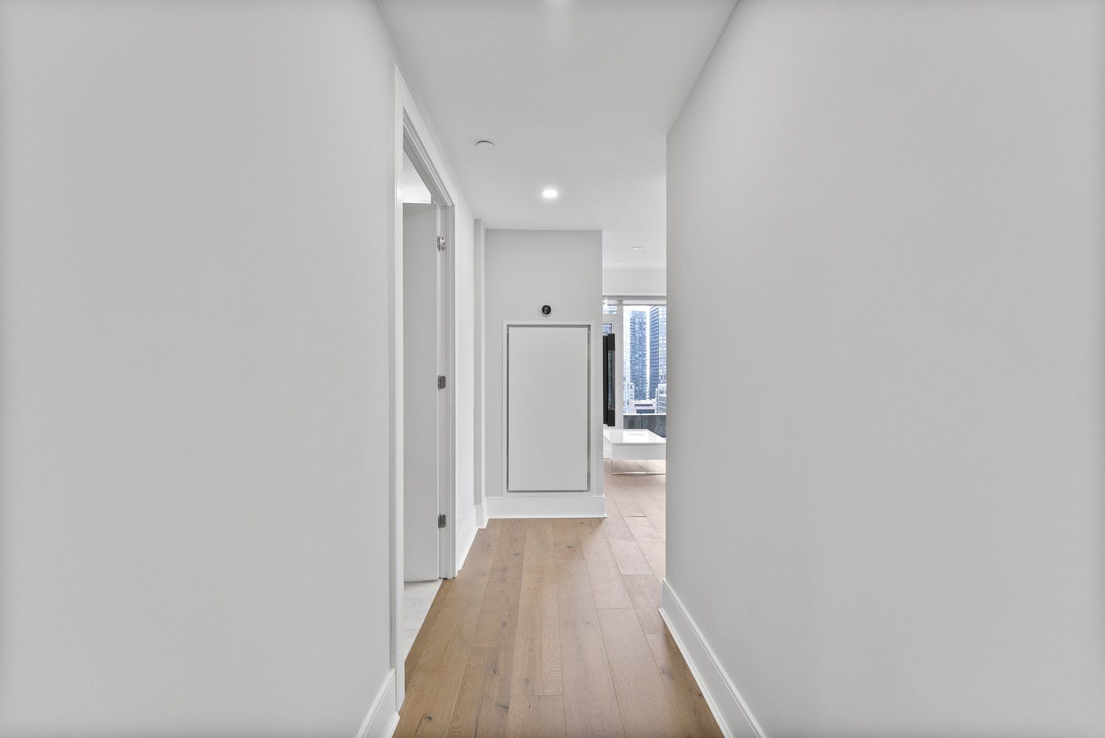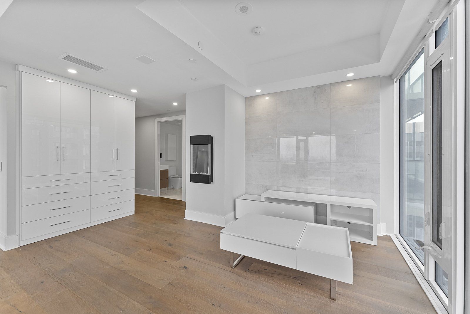 • Wide-plank hardwood flooring and floor-to-ceiling windows enhance the living space.