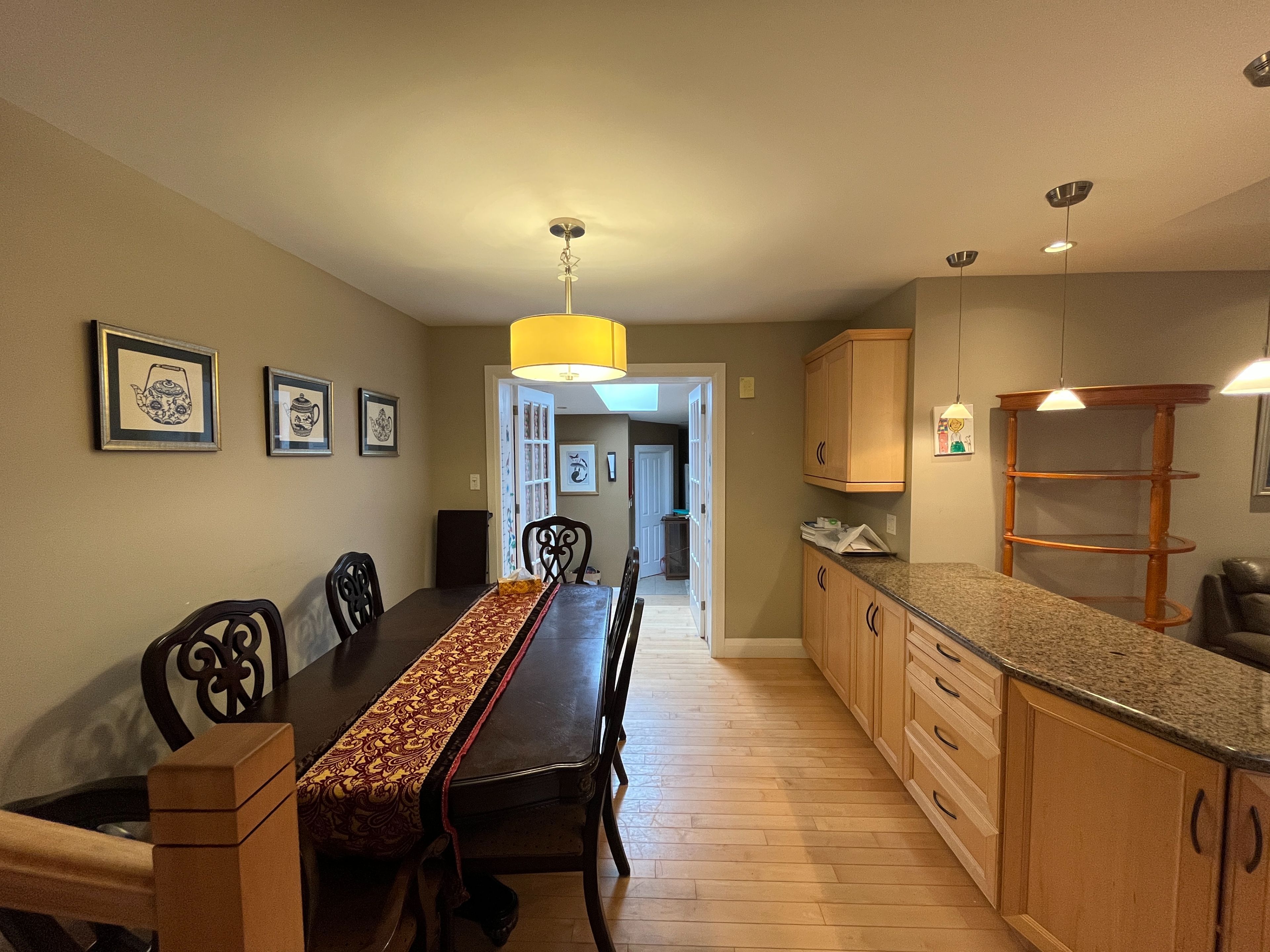 • Modern eat-in kitchen with granite countertops and stainless steel appliances.