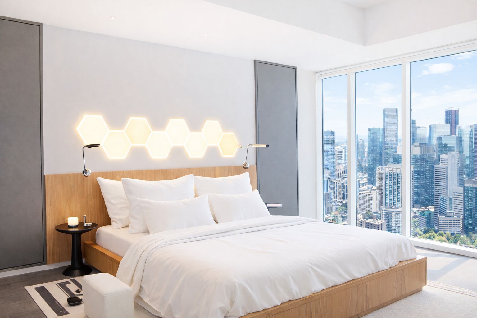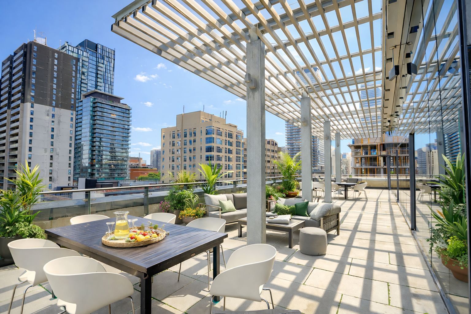 • Access to five-star amenities, including fitness studio and rooftop garden.