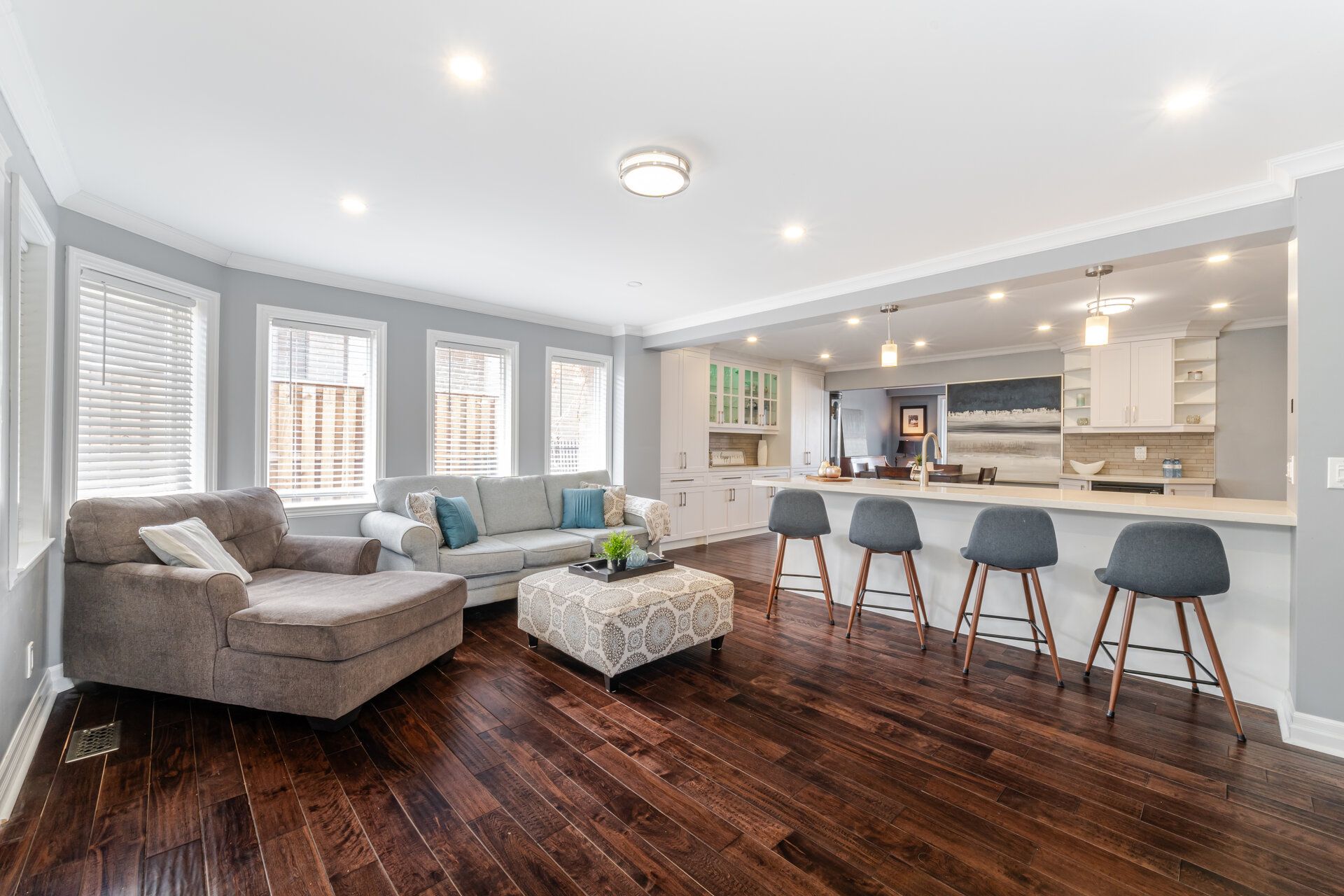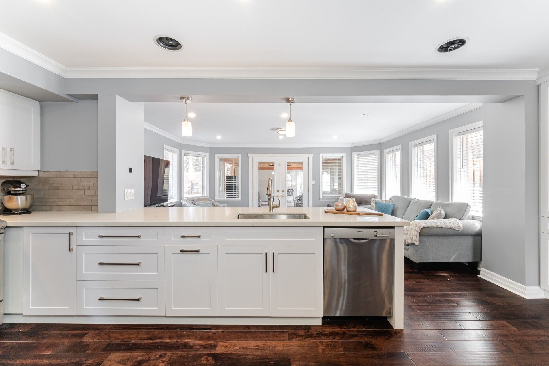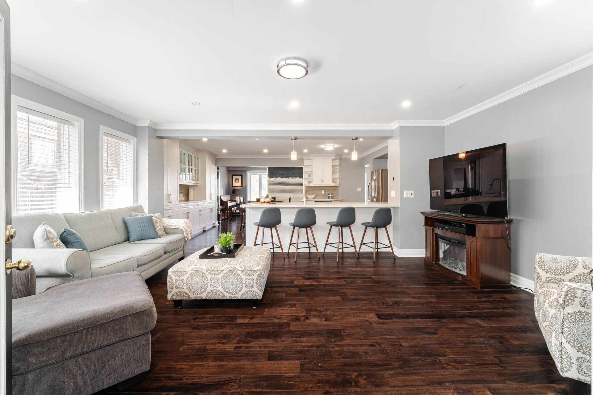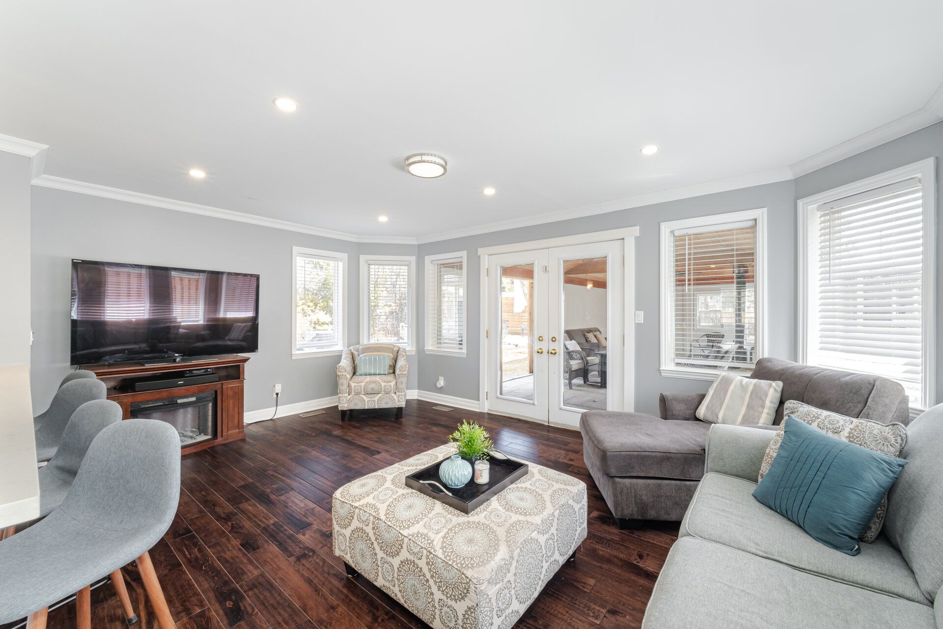 • Expansive family room with built-in speakers for entertainment.