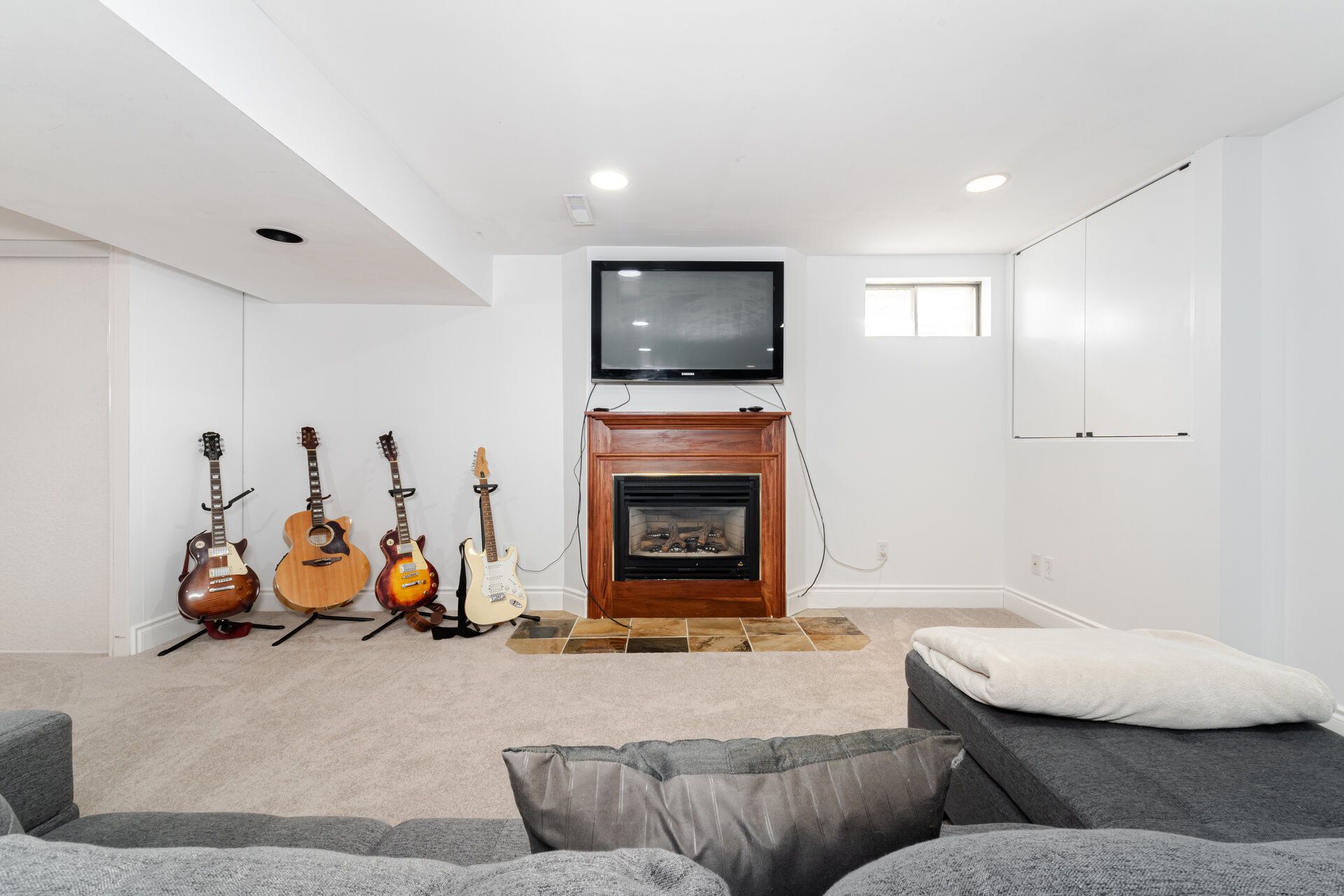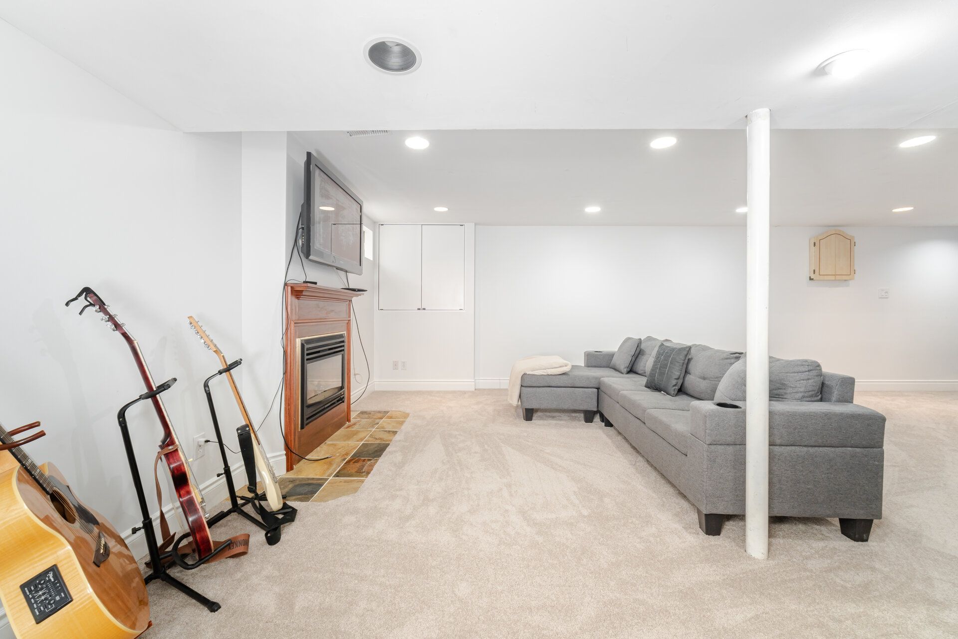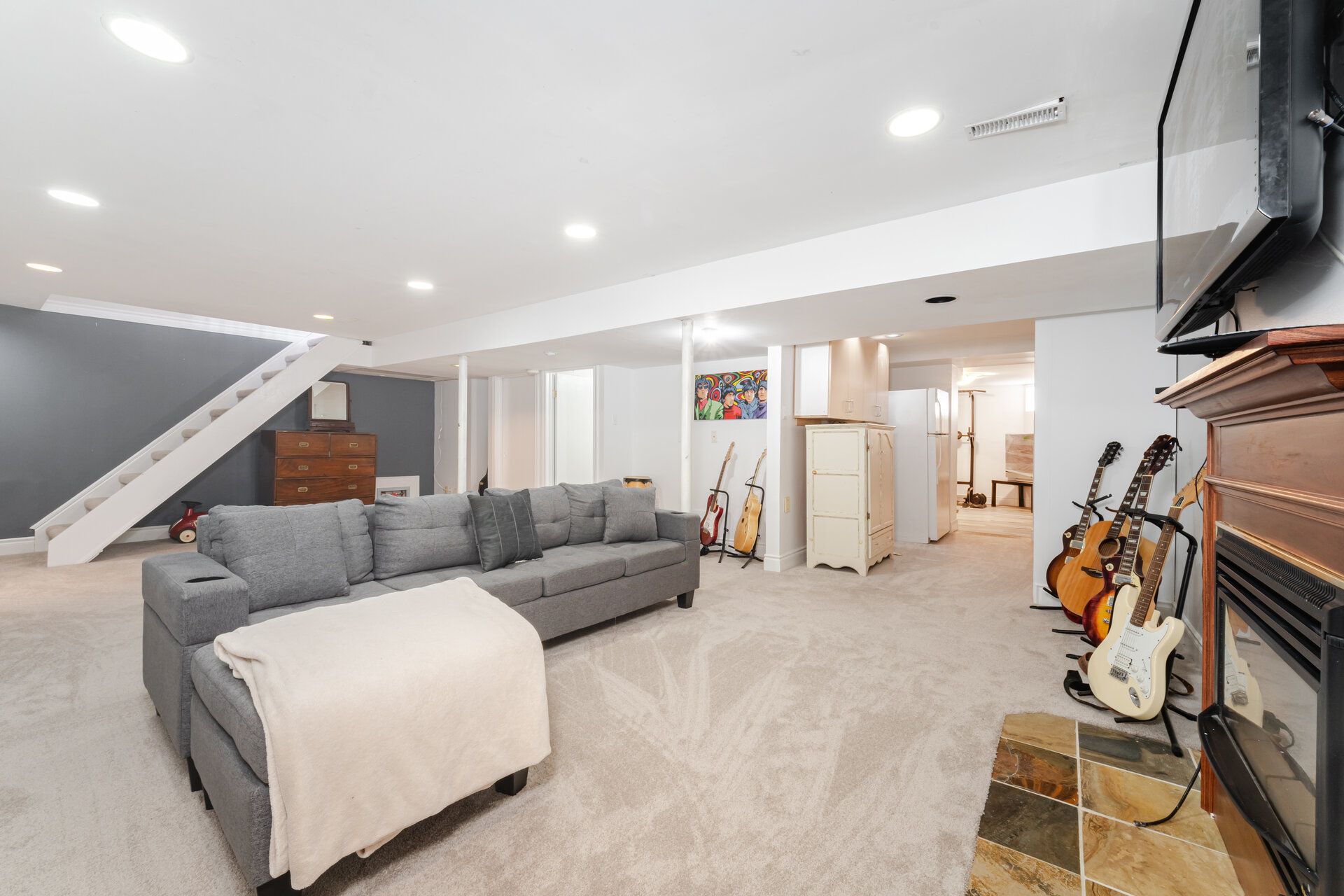 • Expansive family room with built-in speakers for entertainment.