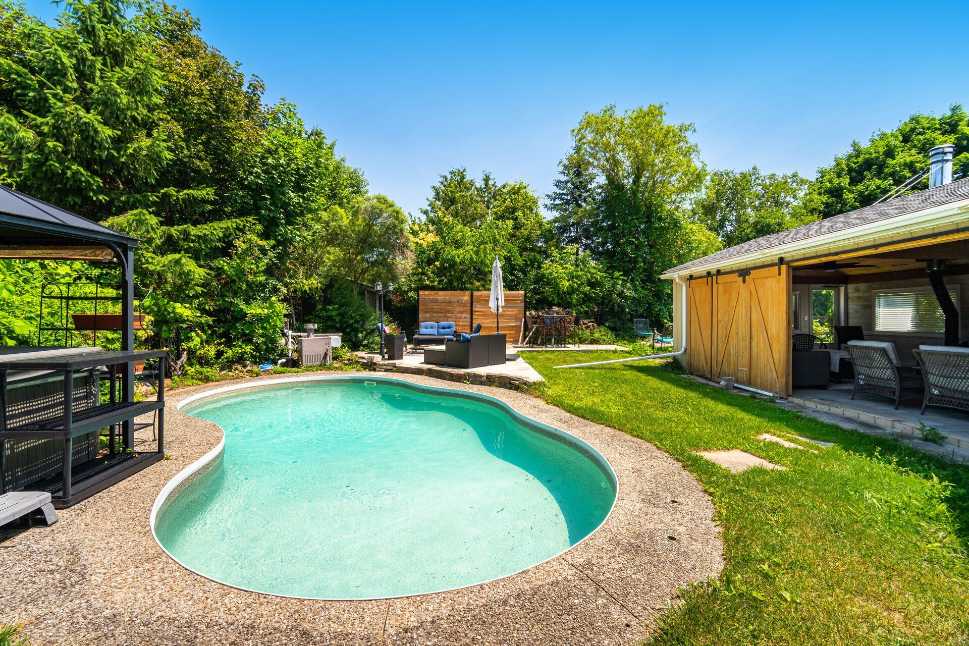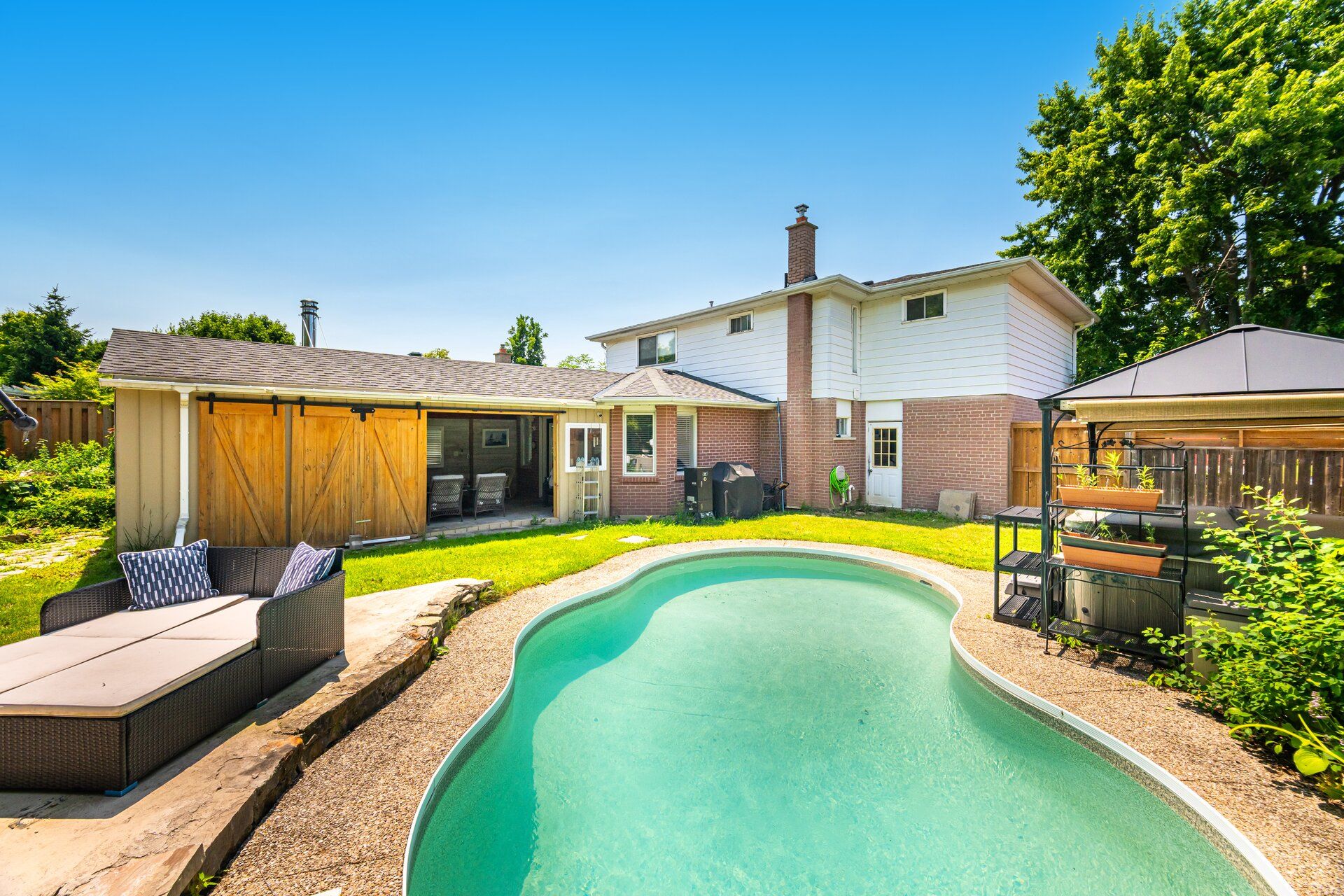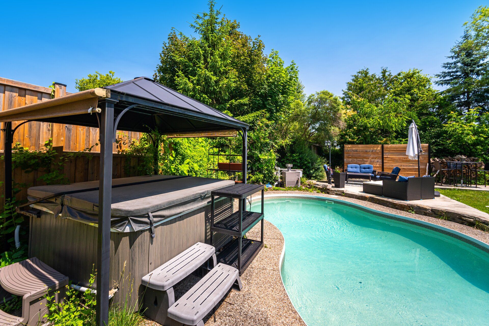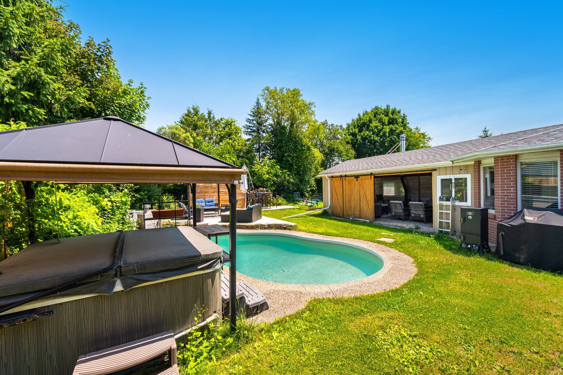 • Backyard oasis with pool, hot tub, and relaxing spaces.