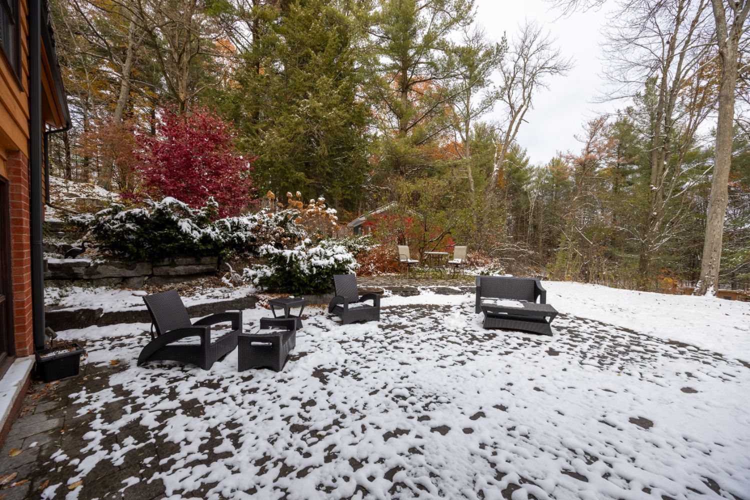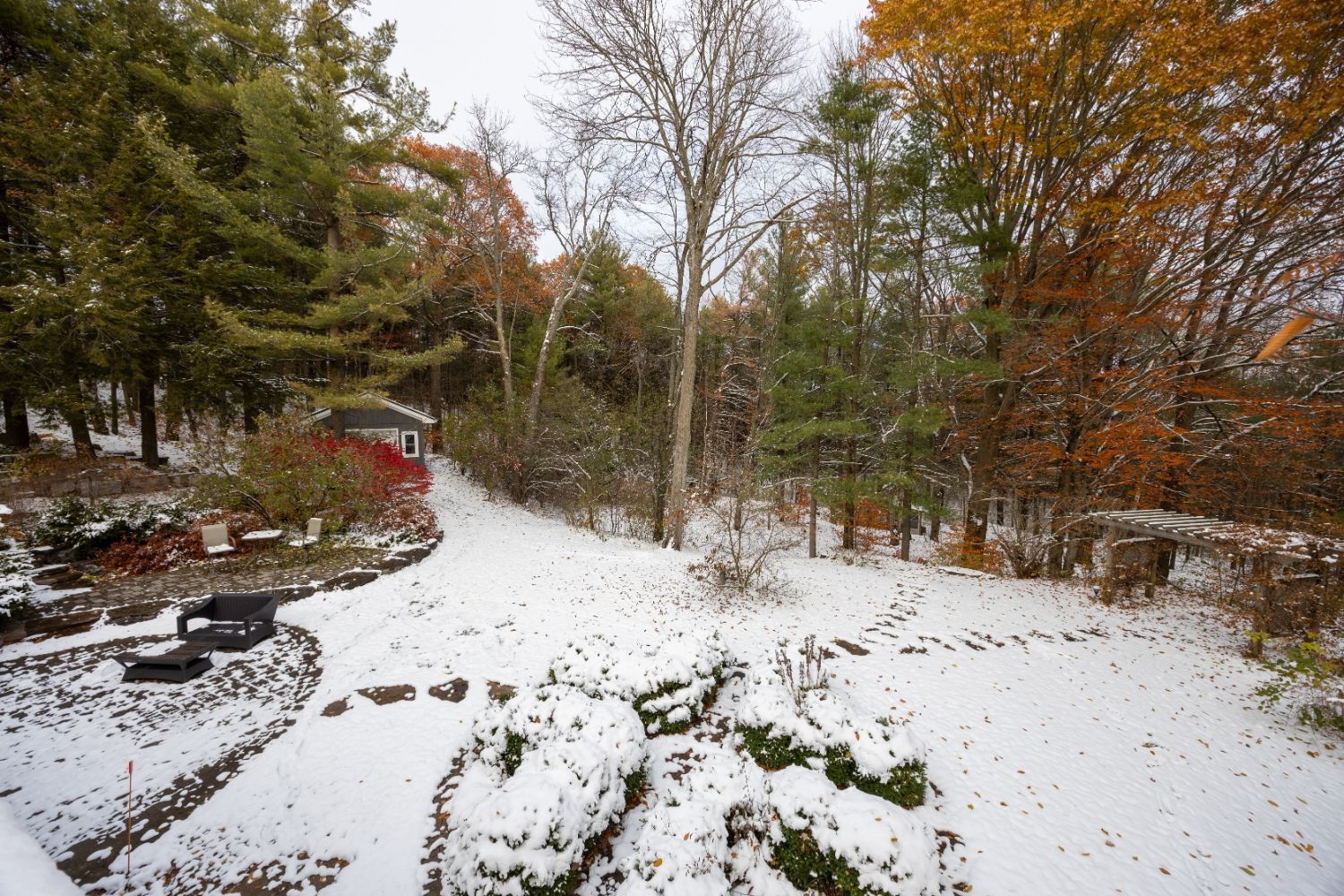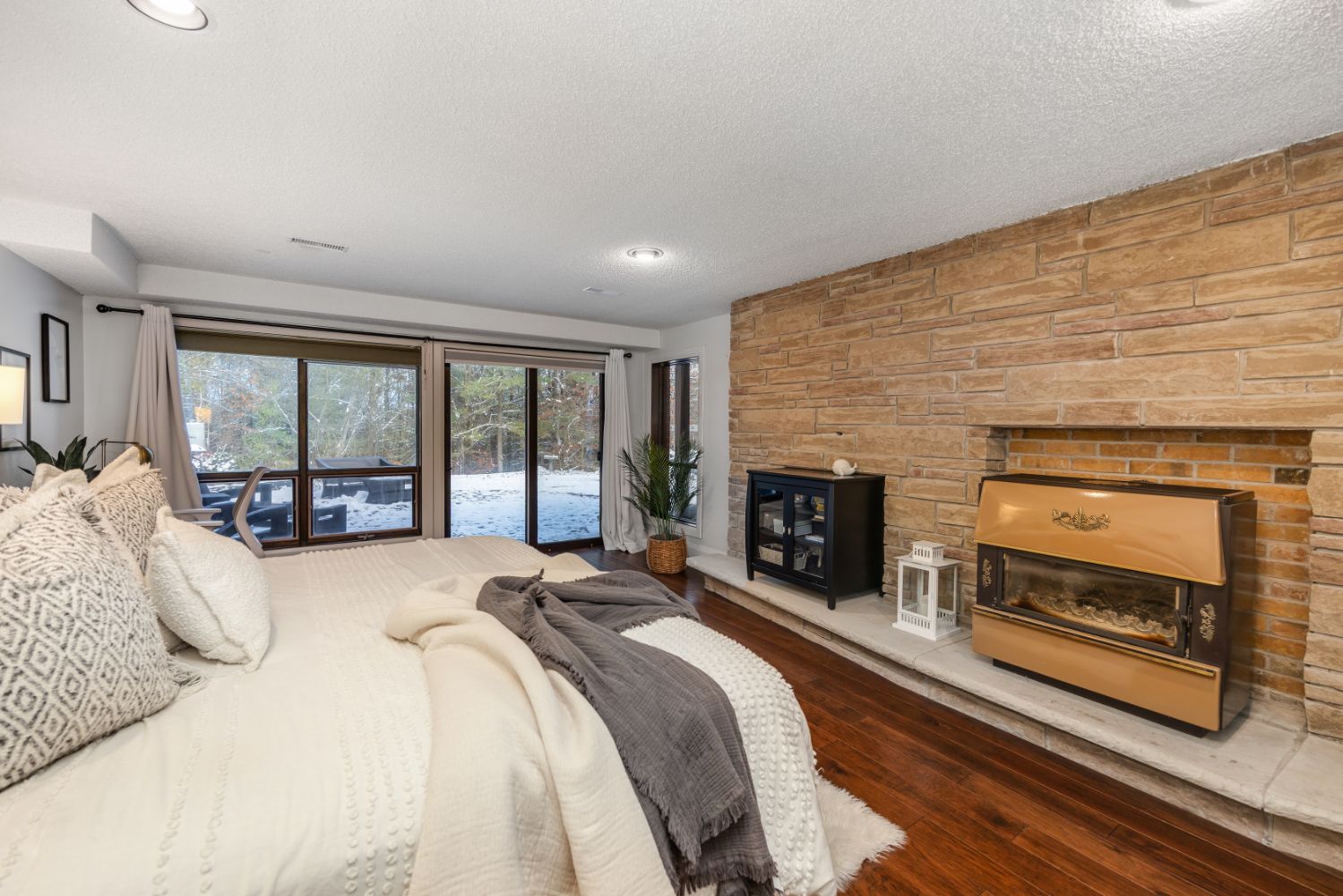 Set amongst mature trees, on approximately 6. 17 acres, in an executive burketon neighbourhood, this stunning raised bungalow offers a rare blend of privacy, character, and craftsmanship. The property welcomes you with a large paved driveway leading to a 3-car attached garage with interior access, plus a detached approx 15ft x 30 ft workshop with hydro - perfect for hobbyists or extra storage. Beautiful landscaping surrounds the home, featuring walkways, fountains, armour stone accents, multiple patio areas ideal for relaxing or entertaining and groomed trails for leisurely strolls through the trees. Enjoy the peaceful sounds of nature from the expansive deck overlooking the private yard. Inside, this home is rich in charm and design detail. The kitchen boasts quartz counters, a moveable centre island, built-in appliances, and a convenient walk-in pantry. The dining room features a walk-out to the deck and shares a striking, two-way wood-burning fireplace with the sunken living room. Here, large windows, a vaulted ceiling, and a floor-to-ceiling stone fireplace creates a warm, inviting atmosphere filled with natural light. The main floor hosts two generous sized bedrooms. The luxurious primary retreat boasts a walk-in closet and a spa-inspired ensuite, features heated floors, a soaker tub, and a tiled walk-in shower. The fully finished, walk-out basement offers exceptional living space with large windows that make it bright and welcoming. It includes two additional bedrooms (one with two closets, and the other with a walk-out to the yard and a woodstove), a 4-piece bath, a dining area and an open concept living space that overlooks the kitchenette. This area has ample cabinetry, quartz counters as well as a custom cherry wood wet-bar. This one-of-a-kind property seamlessly combines elegance, comfort, and natural beauty, truly a place to call home.