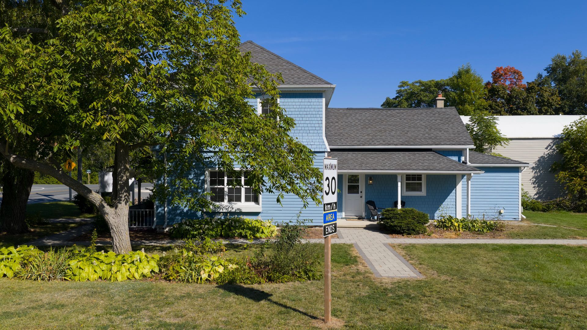 • Beautiful corner lot with a towering willow tree and scenic surroundings.