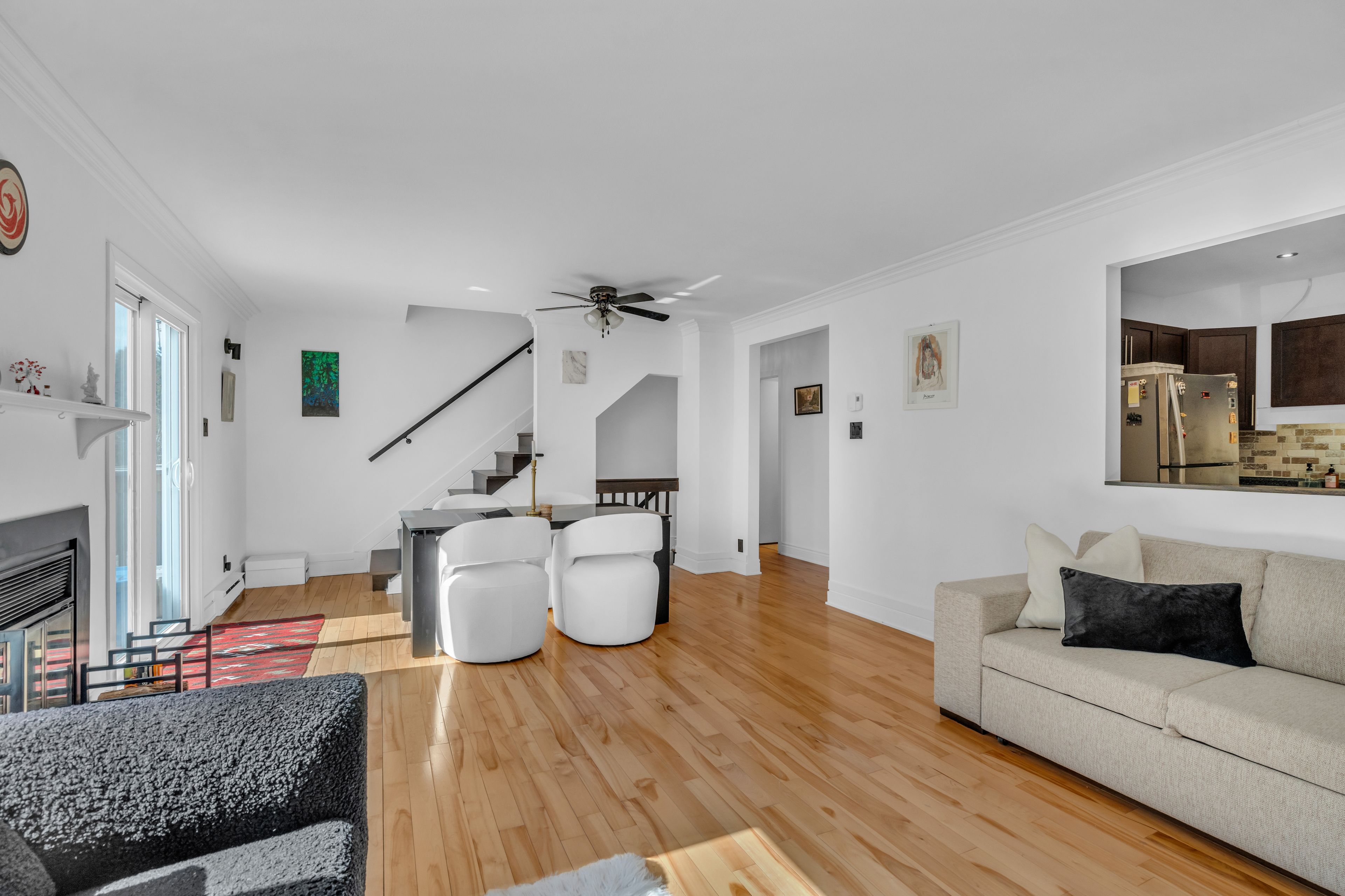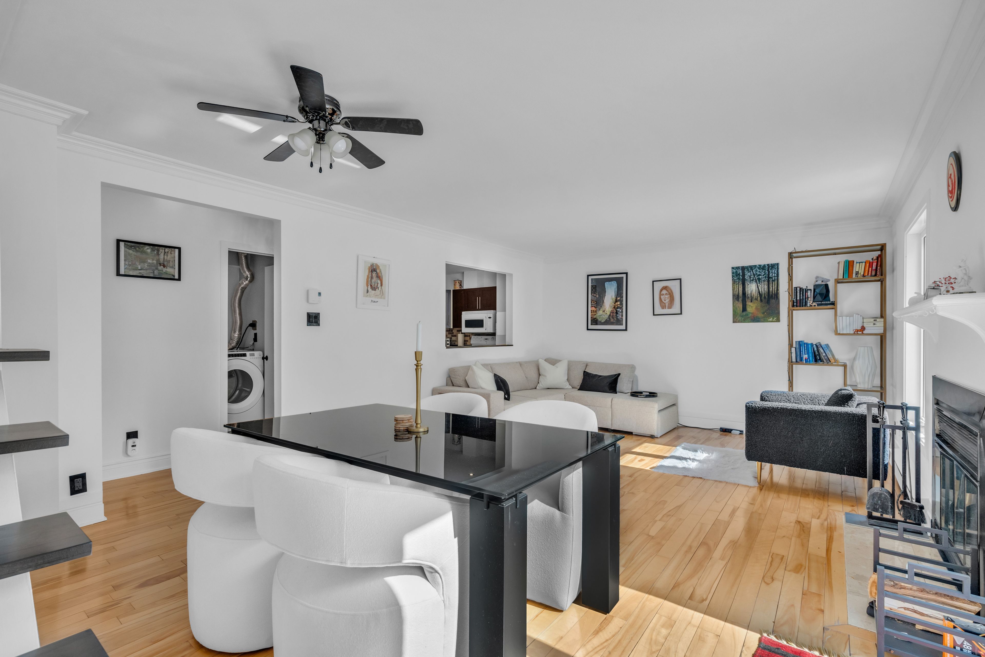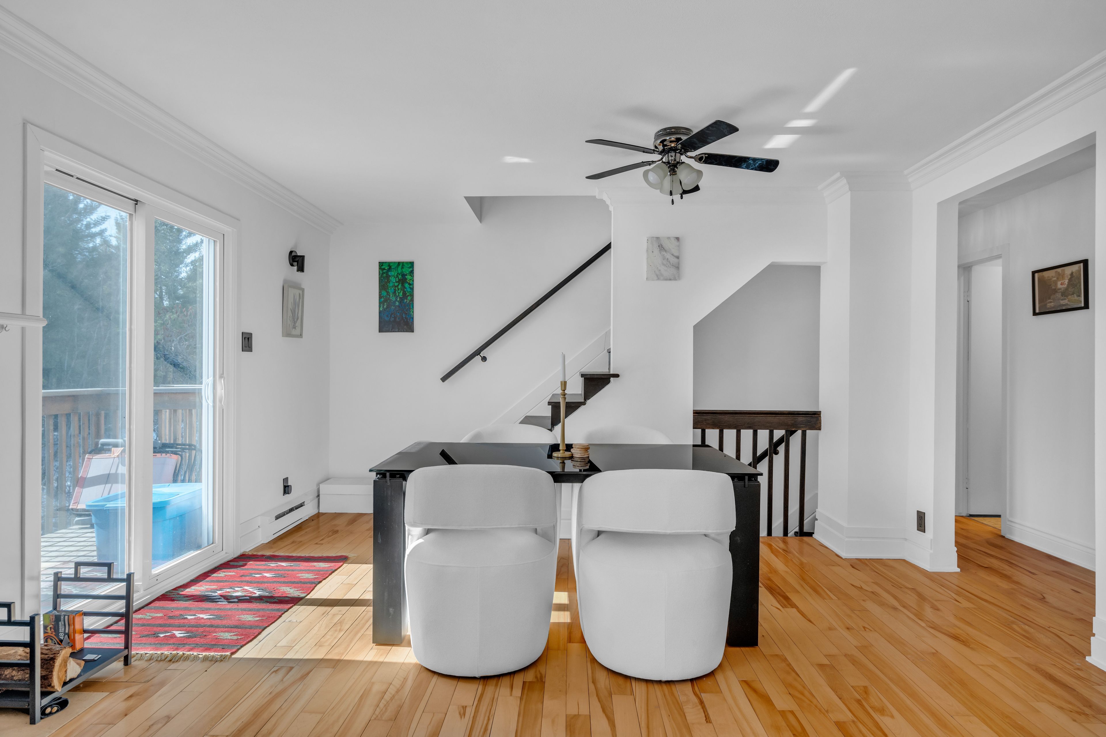 • Open-concept living and dining area features a cozy wood-burning fireplace.