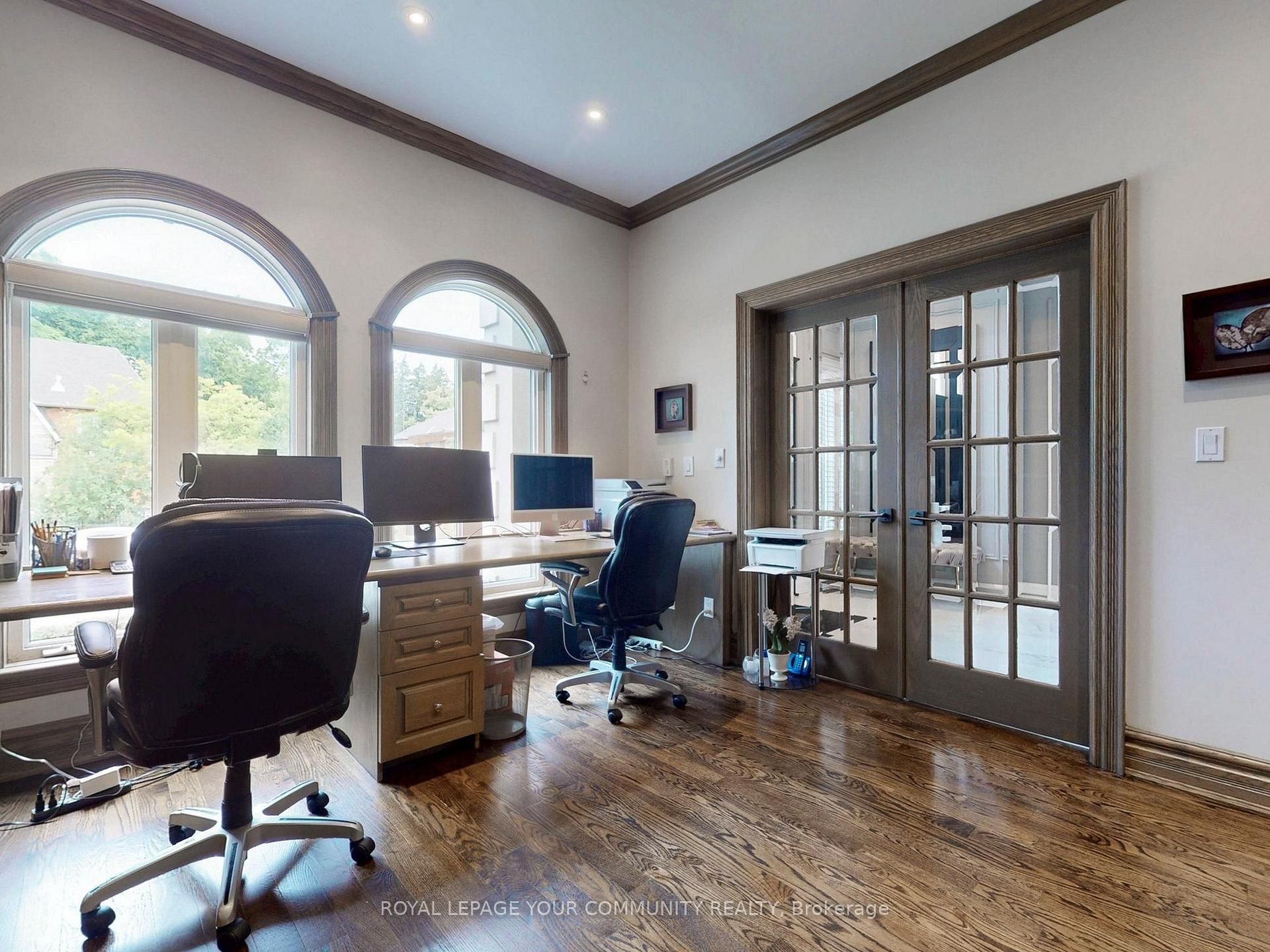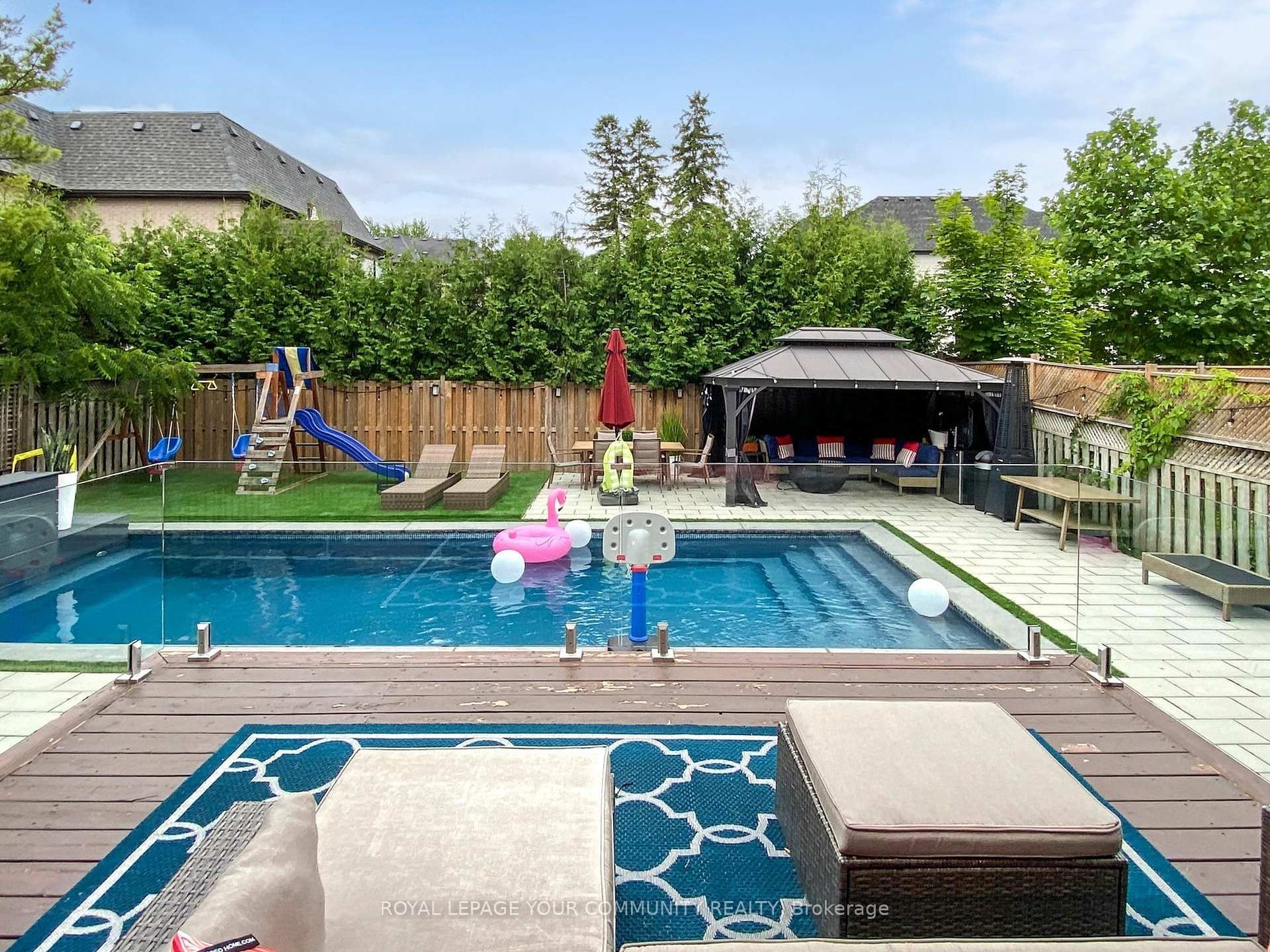 Welcome to 5 trilogy court an executive residence nestled on a quiet, sought-after cul-de-sac in the heart of south richvale, one of richmond hills most prestigious neighborhoods. This stately 4+1 bedroom home offers timeless elegance, custom finishes, and a resort-like backyard complete with a sparkling swimming pool and hot tub. Step through the grand foyer into a thoughtfully designed layout with refined living spaces ideal for both everyday comfort and upscale entertaining. Main-floor library, a warm, inviting retreat featuring custom floor-to-ceiling built-in bookcases and a two-way fireplace shared with the adjoining dinning room, creating a seamless atmosphere of sophistication and warmth. The gourmet kitchen is a chefs dream, complete with quartz countertops, high-end appliances, and ample cabinetry opening seamlessly to a bright breakfast area and expansive family room overlooking the private backyard oasis. Formal living and dining rooms provide generous space for entertaining and family gatherings. Upstairs, four spacious bedrooms await, including a luxurious primary suite with a walk-in closet and a spacious laundry room. The finished basement includes a guest/nanny suite, media area, sauna and additional entertaining space. Step outside to enjoy your private paradise with a professionally landscaped yard and in-ground swimming pool, ideal for summer relaxation and entertaining located near top-rated schools, boutiques, and golf courses, this home combines luxury, location, and lifestyle.