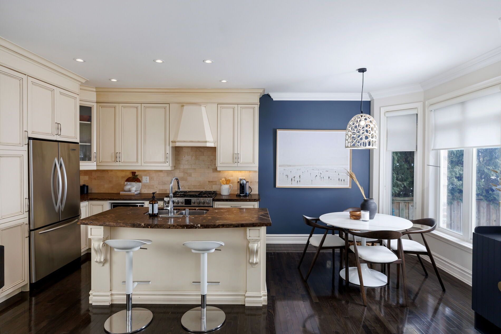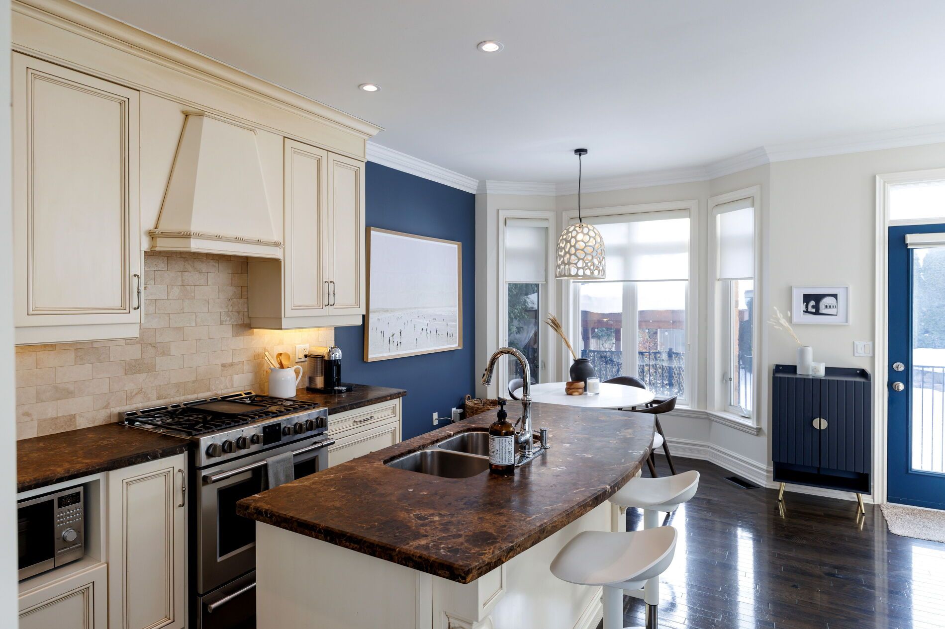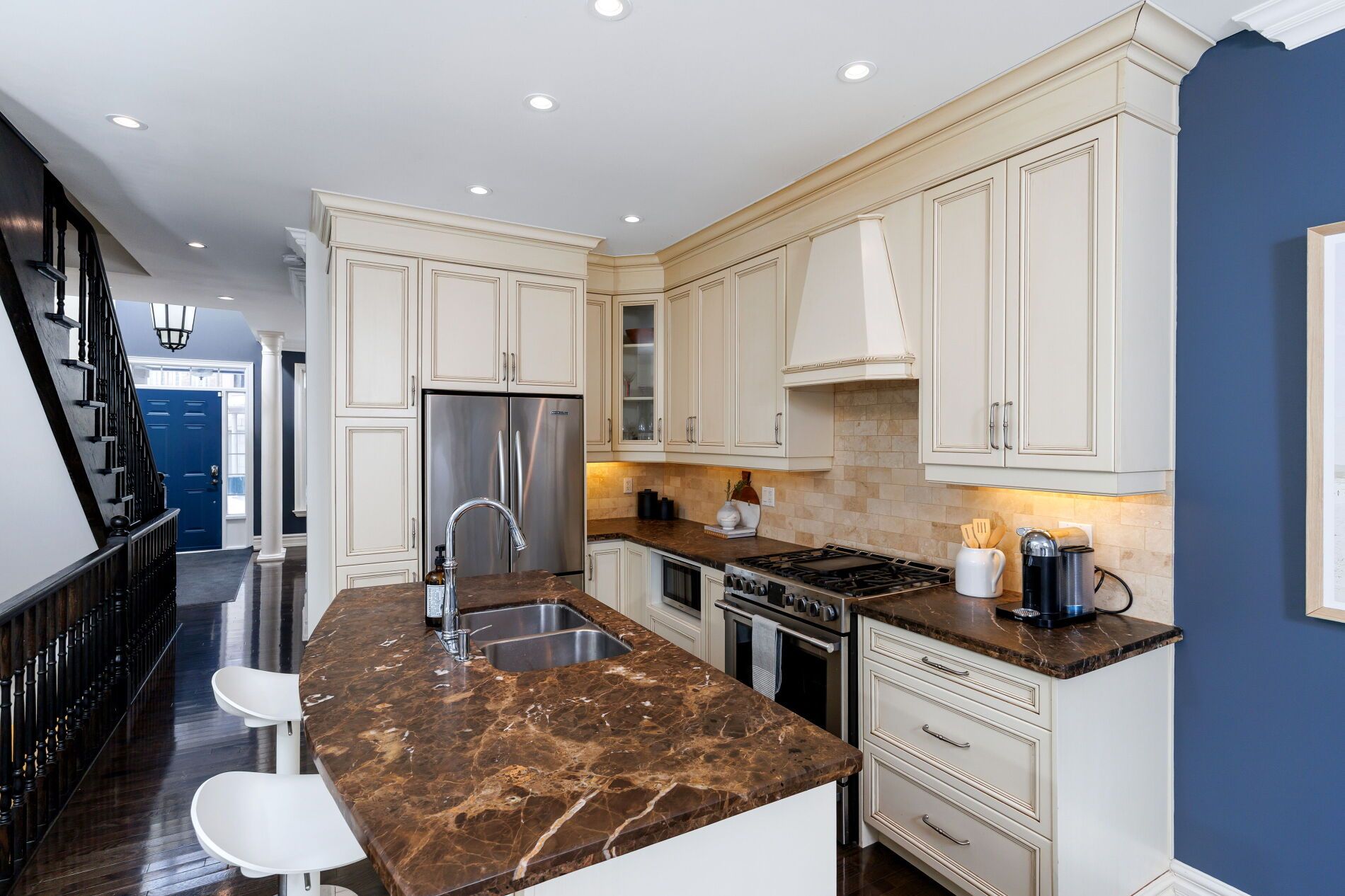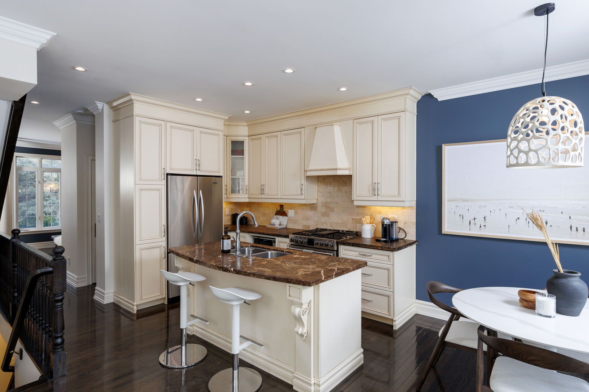 Welcome to this exceptional detached residence w/over 2,500 sq. Ft. Of beautifully finished space across four levels, perfect for both family living and entertaining. Built in 2006, this home stands apart being the largest lot in the highly desirable islington village estates. Numerous upgrades throughout as well as a dramatic backyard transformation. The vaulted foyer opens into a warm and welcoming setting with bright, airy ambiance throughout the main floor. Featuring 9-foot ceilings and rich hardwood flooring, the open-concept layout seamlessly connects the principal spaces. The elegant kitchen is anchored with a center island, marble countertops, stainless appliances and a charming breakfast nook overlooking the backyard pool. The open family room offers a relaxing retreat with a gas fireplace and custom built-in bookshelves. Upstairs, the second level features three spacious bedrooms, including a luxurious primary suite with a sumptuous 5-piece ensuite, deep soaking tub with built-in television, and an oversized walk-in closet. The third-floor loft provides an expansive and versatile open-concept space with abundant storage - ideal as additional bedrooms, a home office, fitness studio, or even a private primary retreat. The fully finished lower level adds a generous recreation room featuring a drop-down movie screen rustic wood-accent wall, along with a renovated 3-piece bathroom complete with a steam shower. The true pièce de résistance is the spectacular backyard oasis. Designed for ultimate privacy and tranquility, it features an inground pool, lush landscaping, covered cabana, poolside bar, and hot tub - creating the perfect setting for summer entertaining or peaceful relaxation. Nestled within a coveted enclave this is a rare opportunity for a growing family. Potl fee of 209. 00/month includes road maintenance & snow removal, landscaping, security cameras & visitor parking.