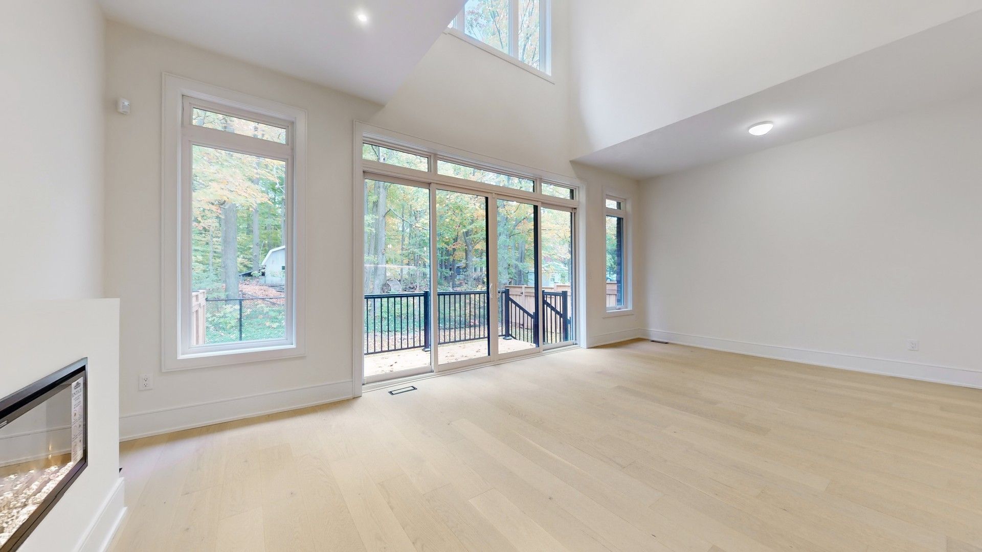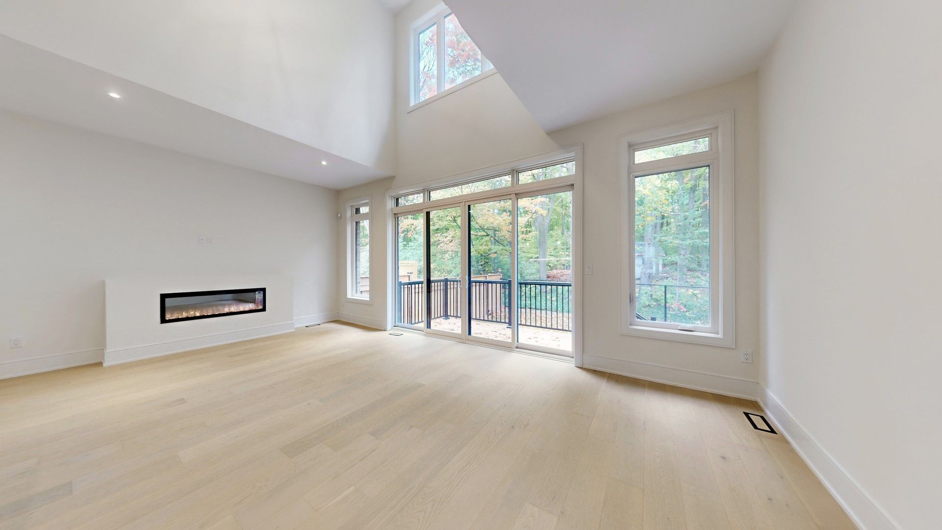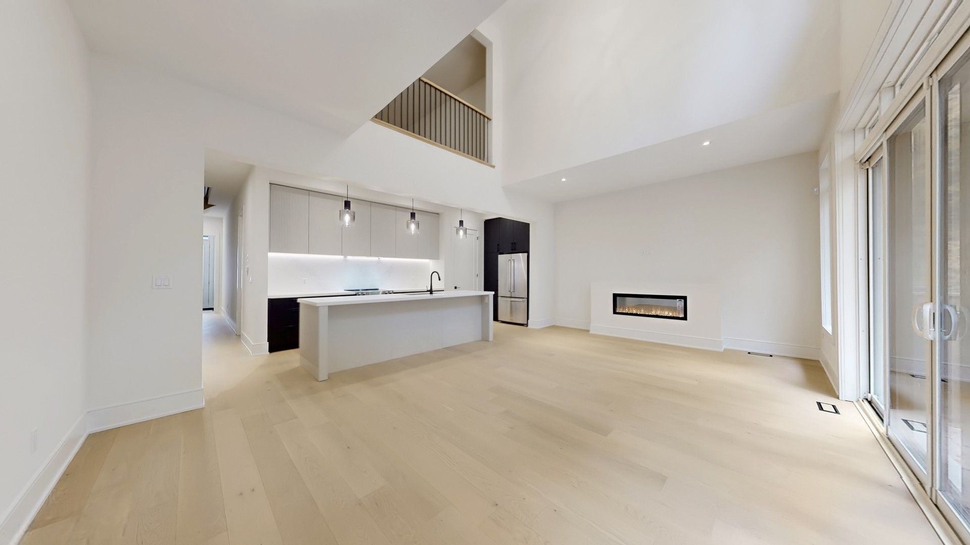 • Light-filled great room with 20' ceiling and electric fireplace for comfort.
