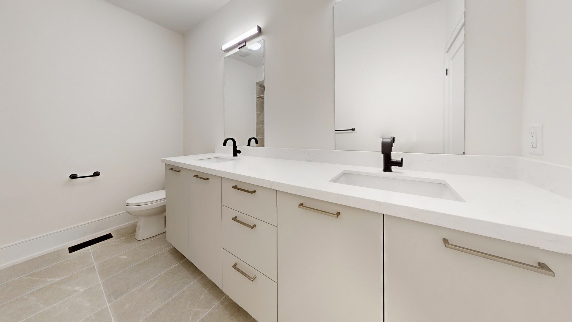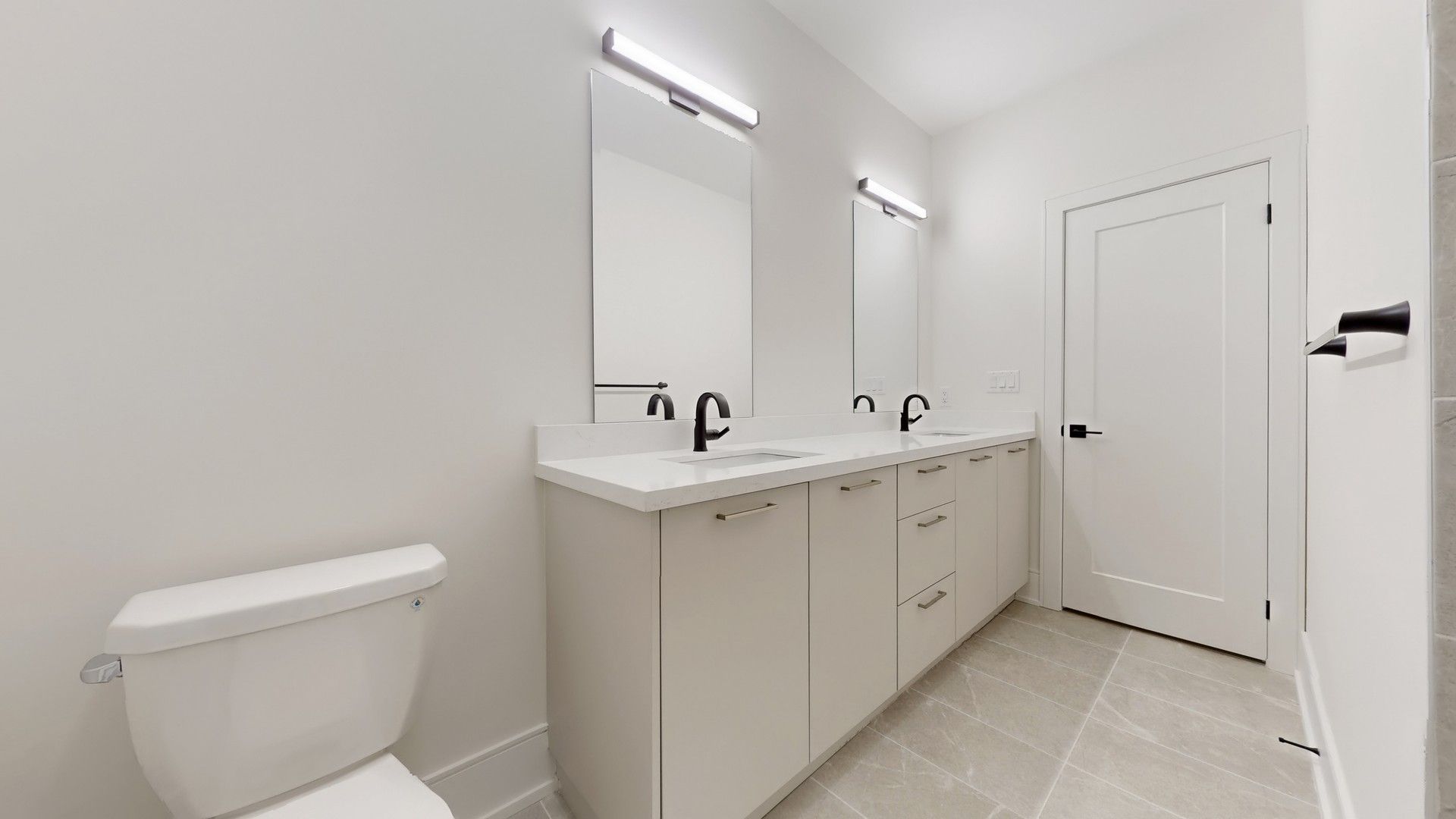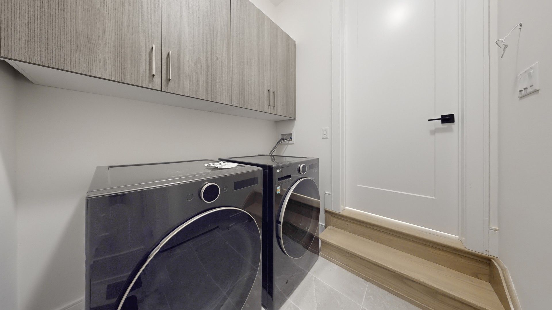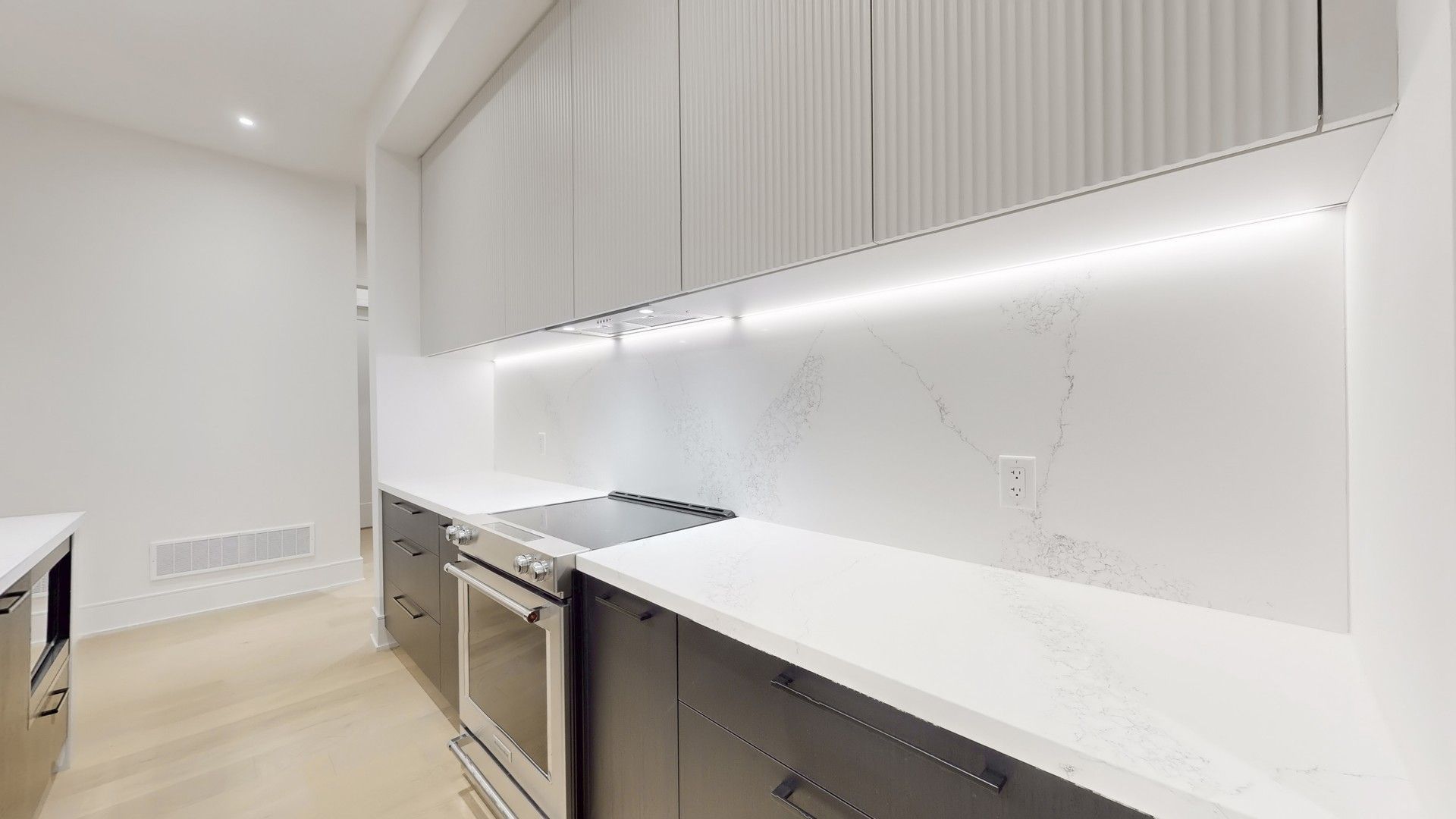• Modern kitchen with sleek two-tone cabinets and designer fixtures.