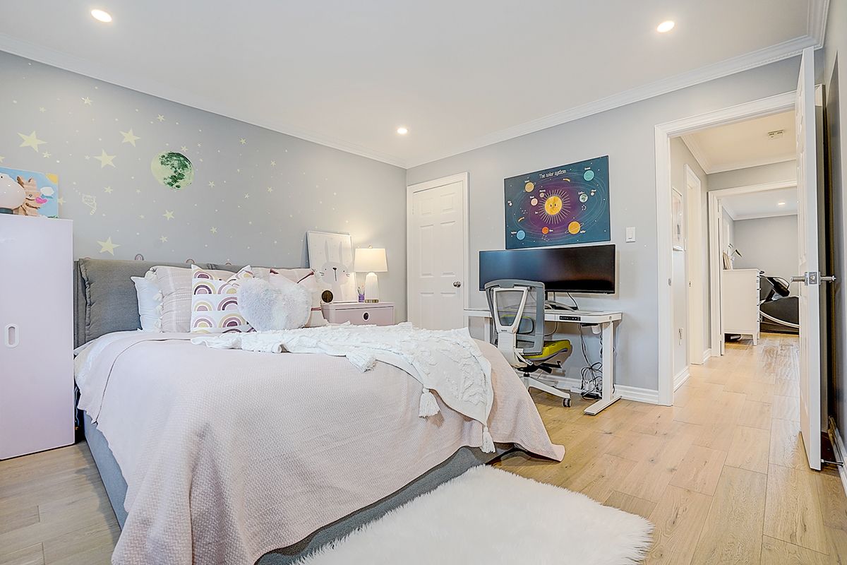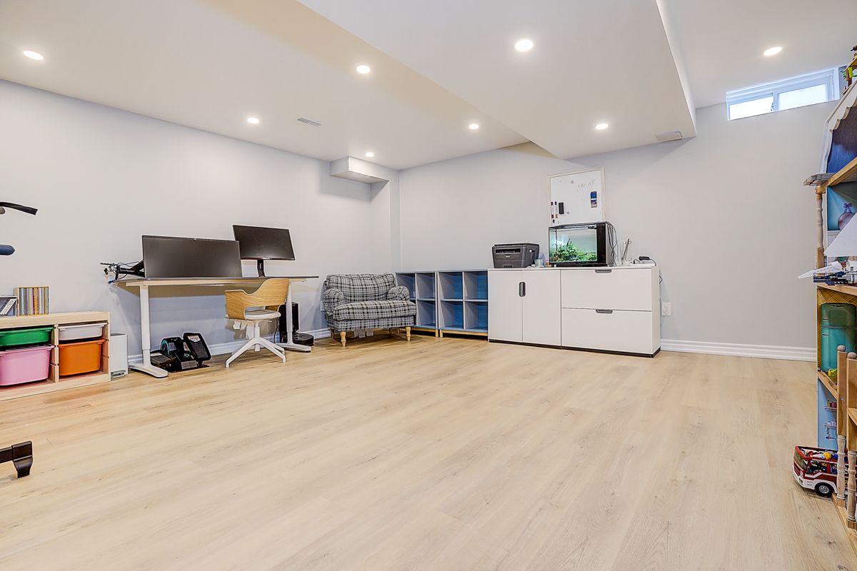 • Finished basement includes a bedroom, bathroom, and recreational area.