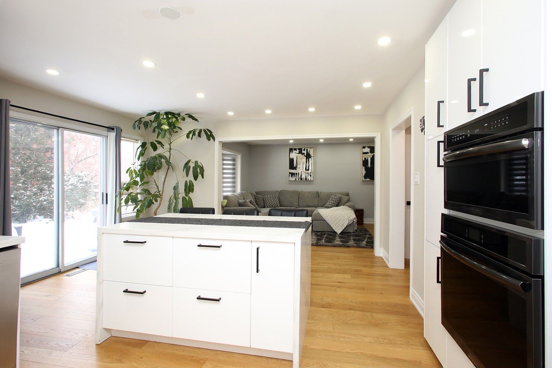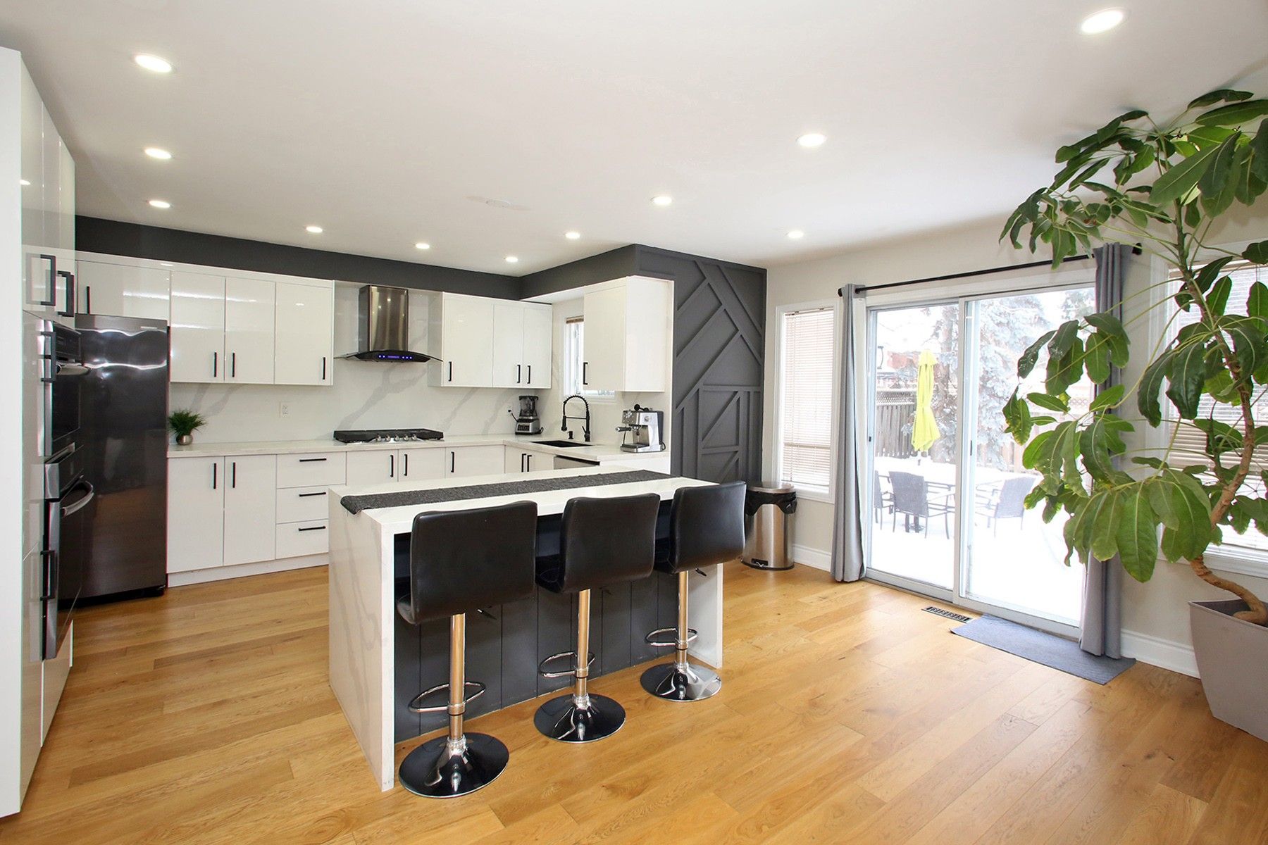 • Modern kitchen equipped with quartz island and gas cooktop.