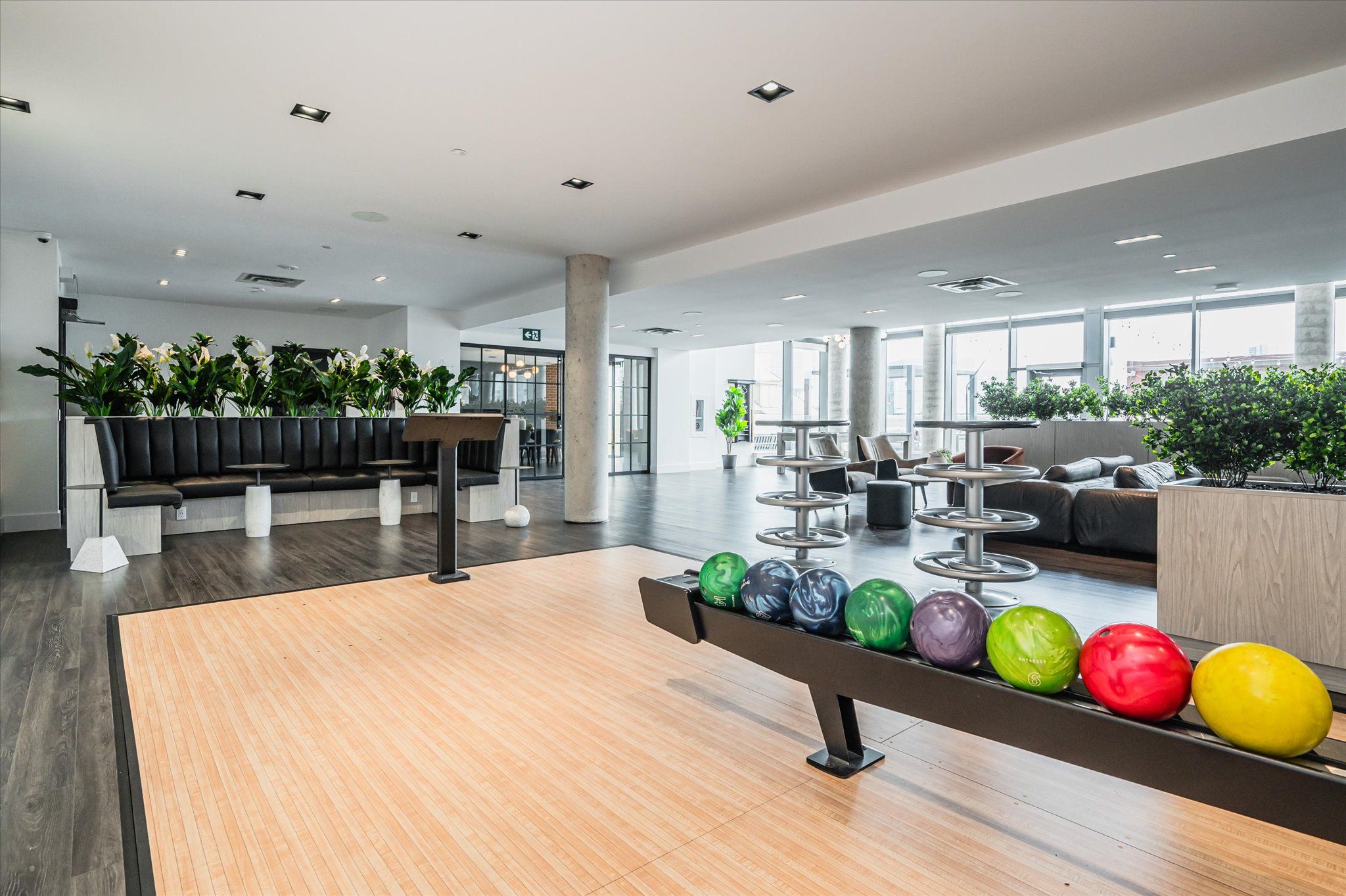 • Amenities include a luxury lounge, bowling alley, and fitness center.