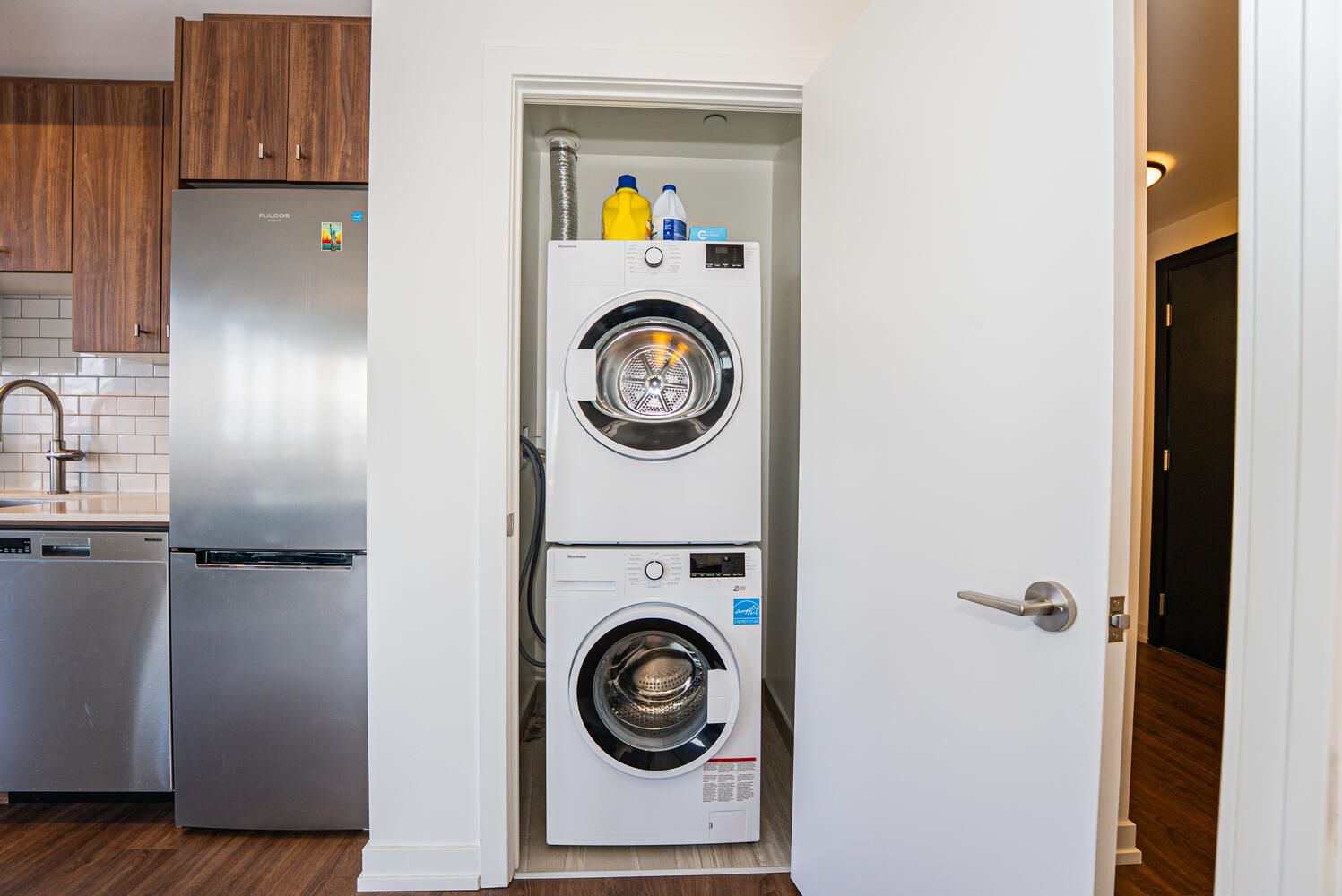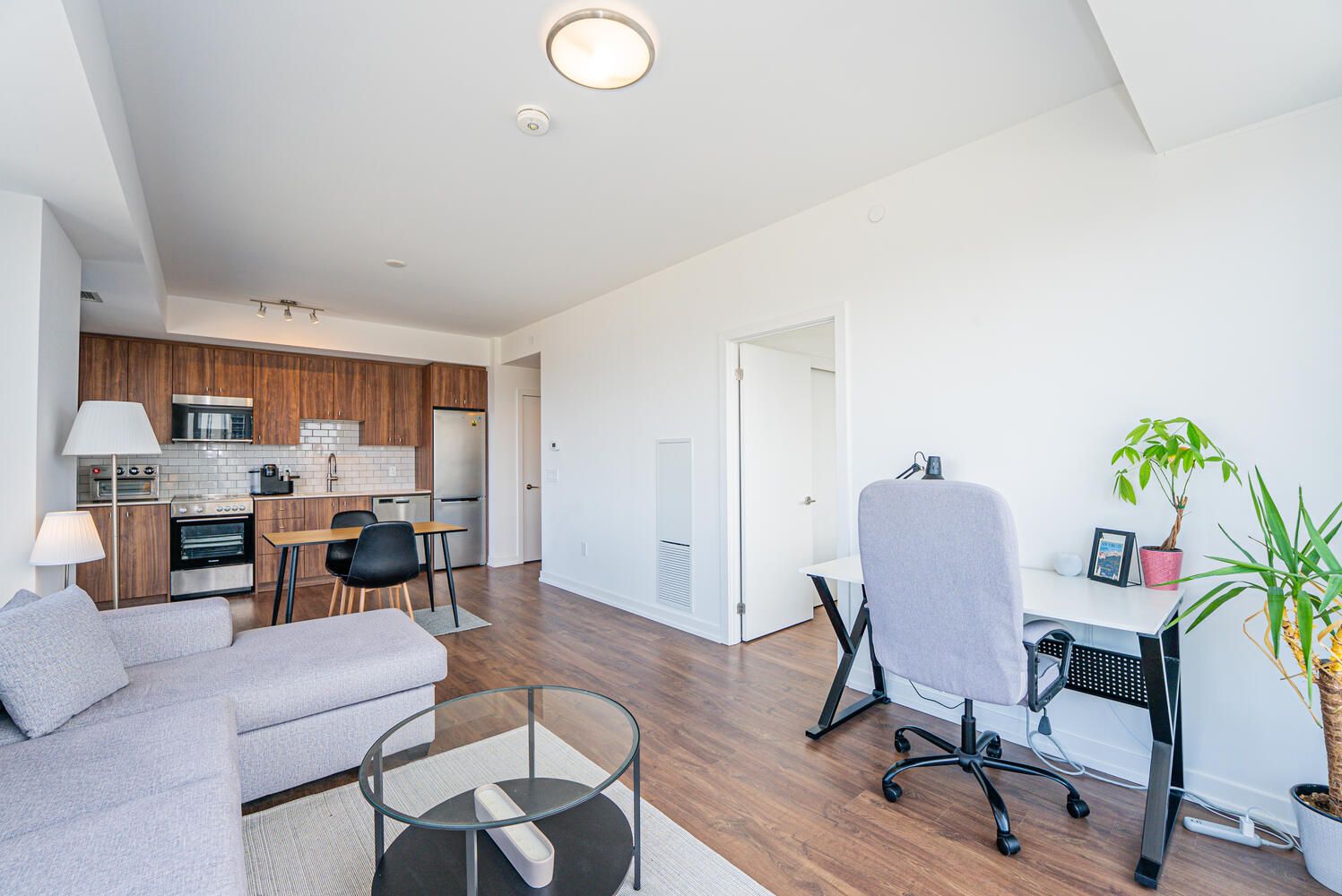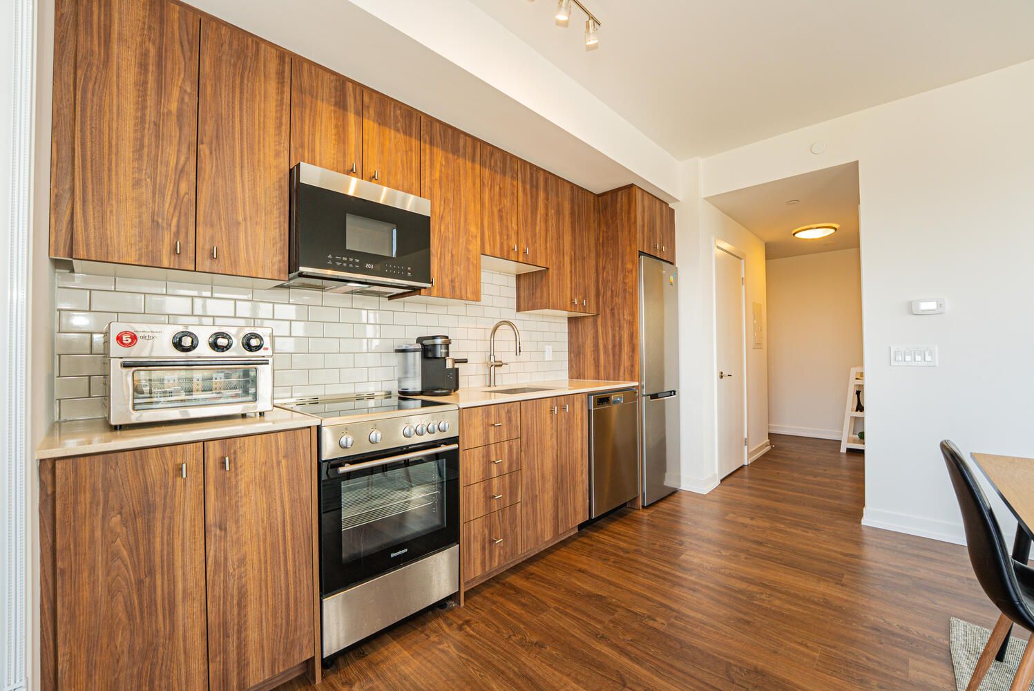 • Sleek kitchen with quartz countertops and stainless steel appliances.