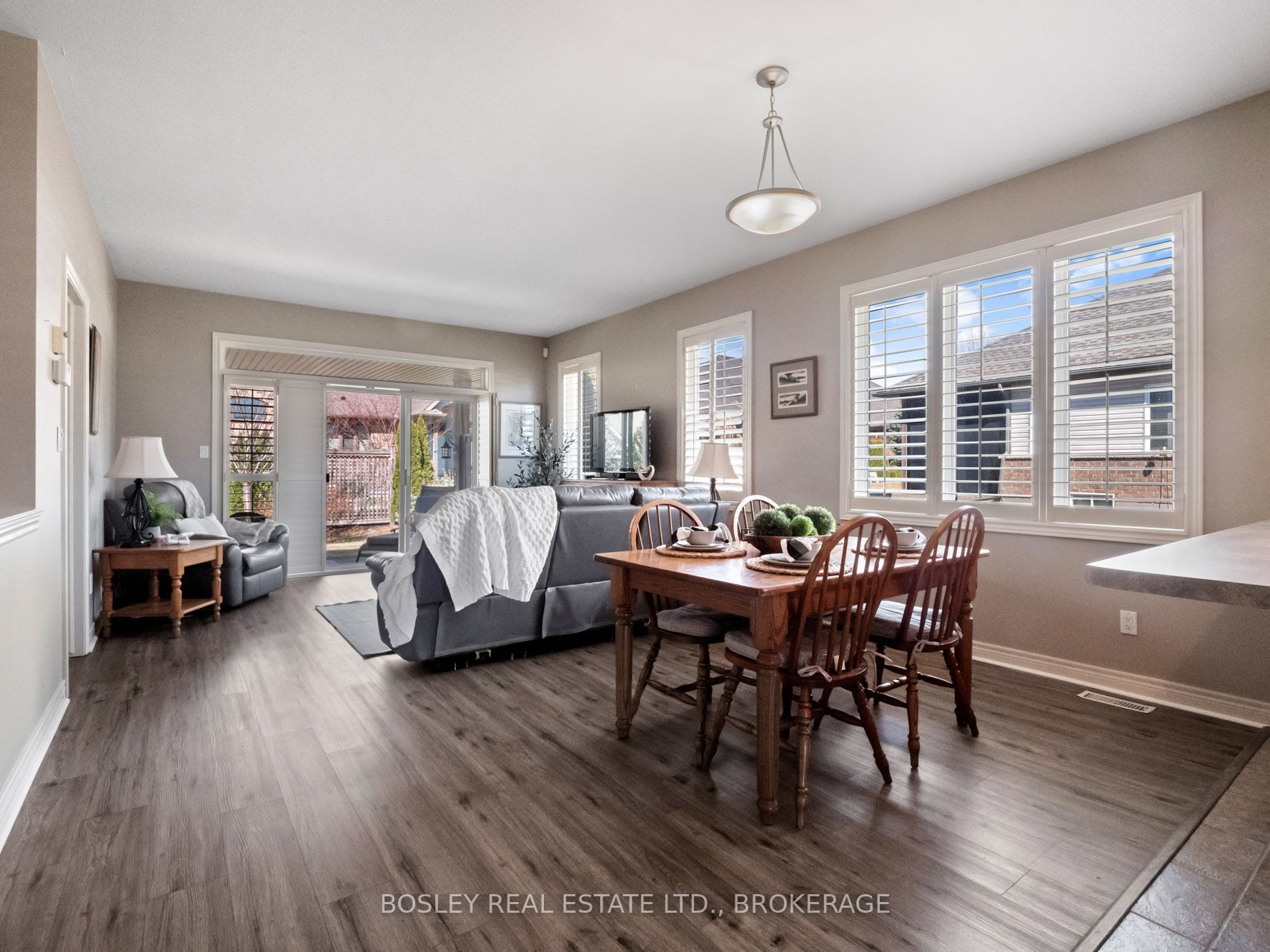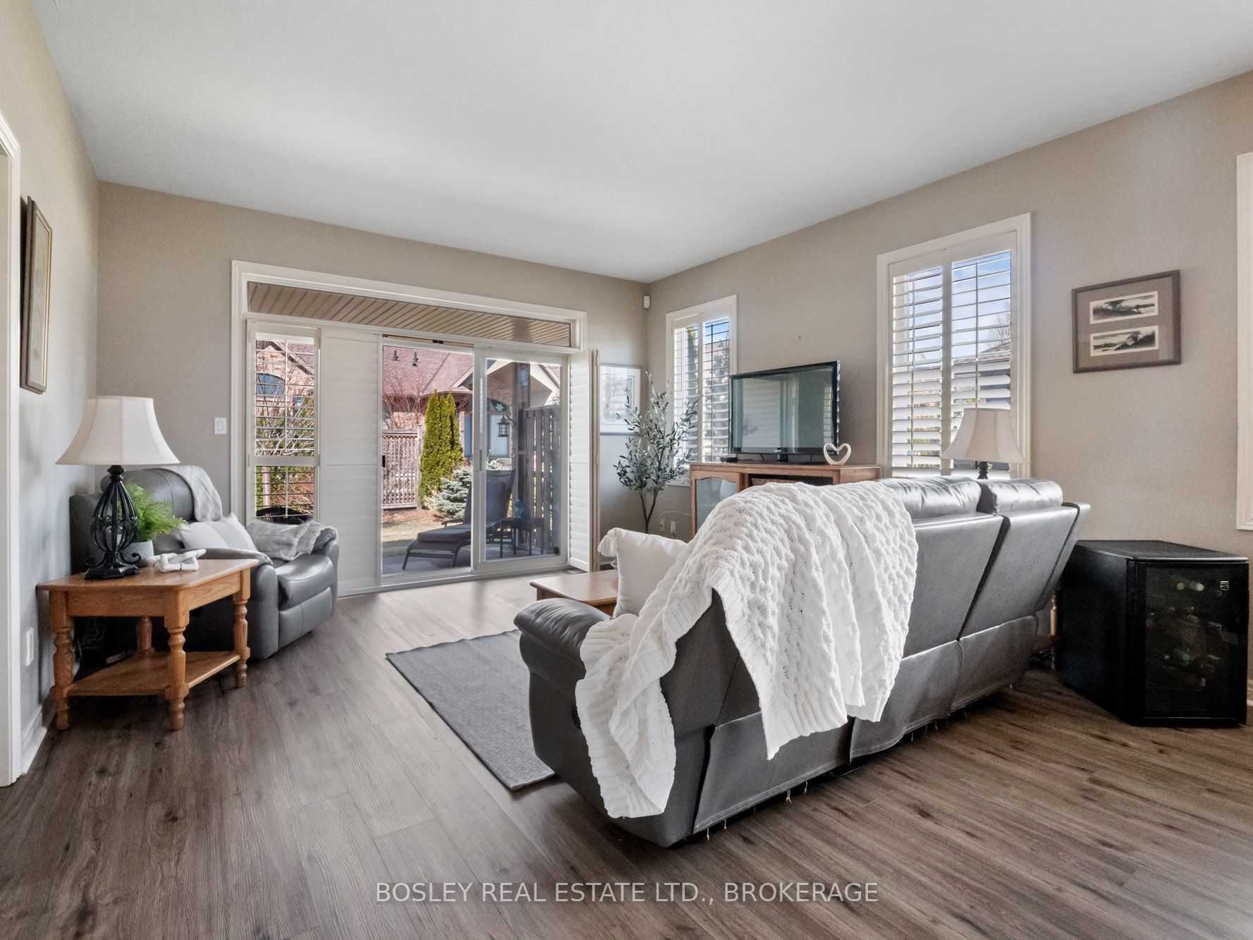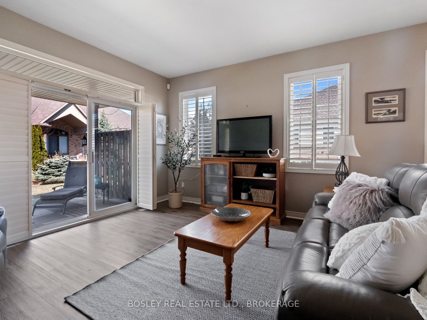 • Bright living space featuring California shutters and easy patio access.