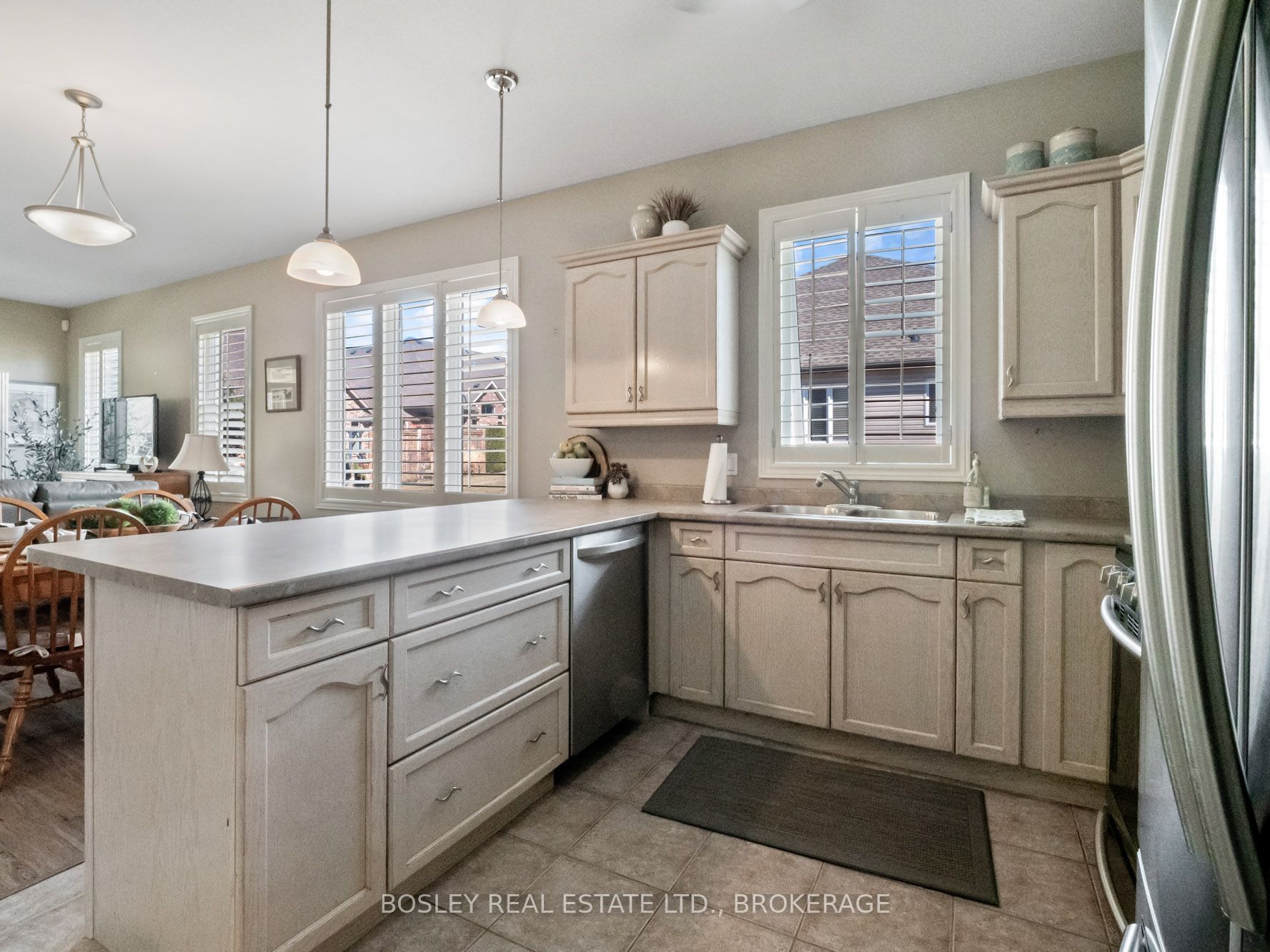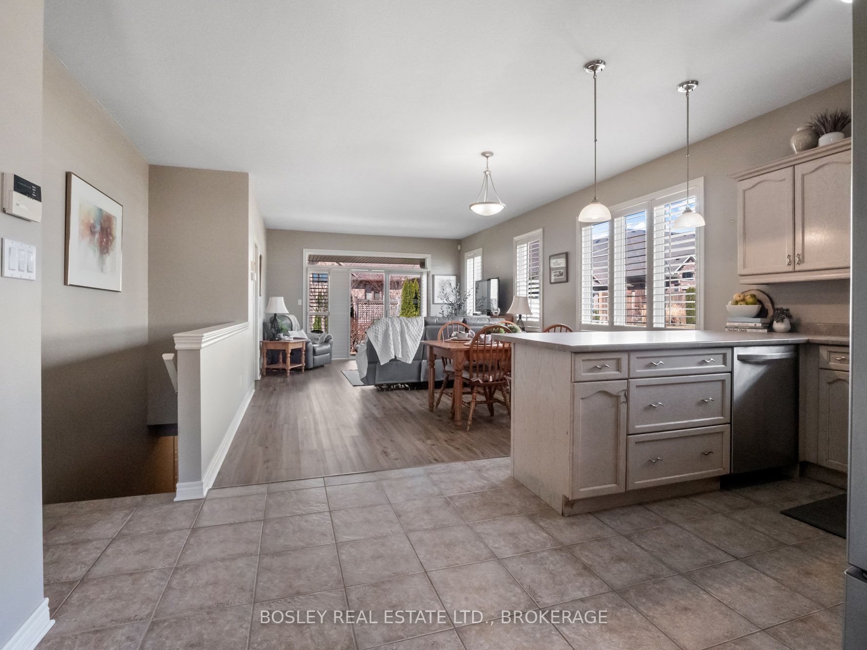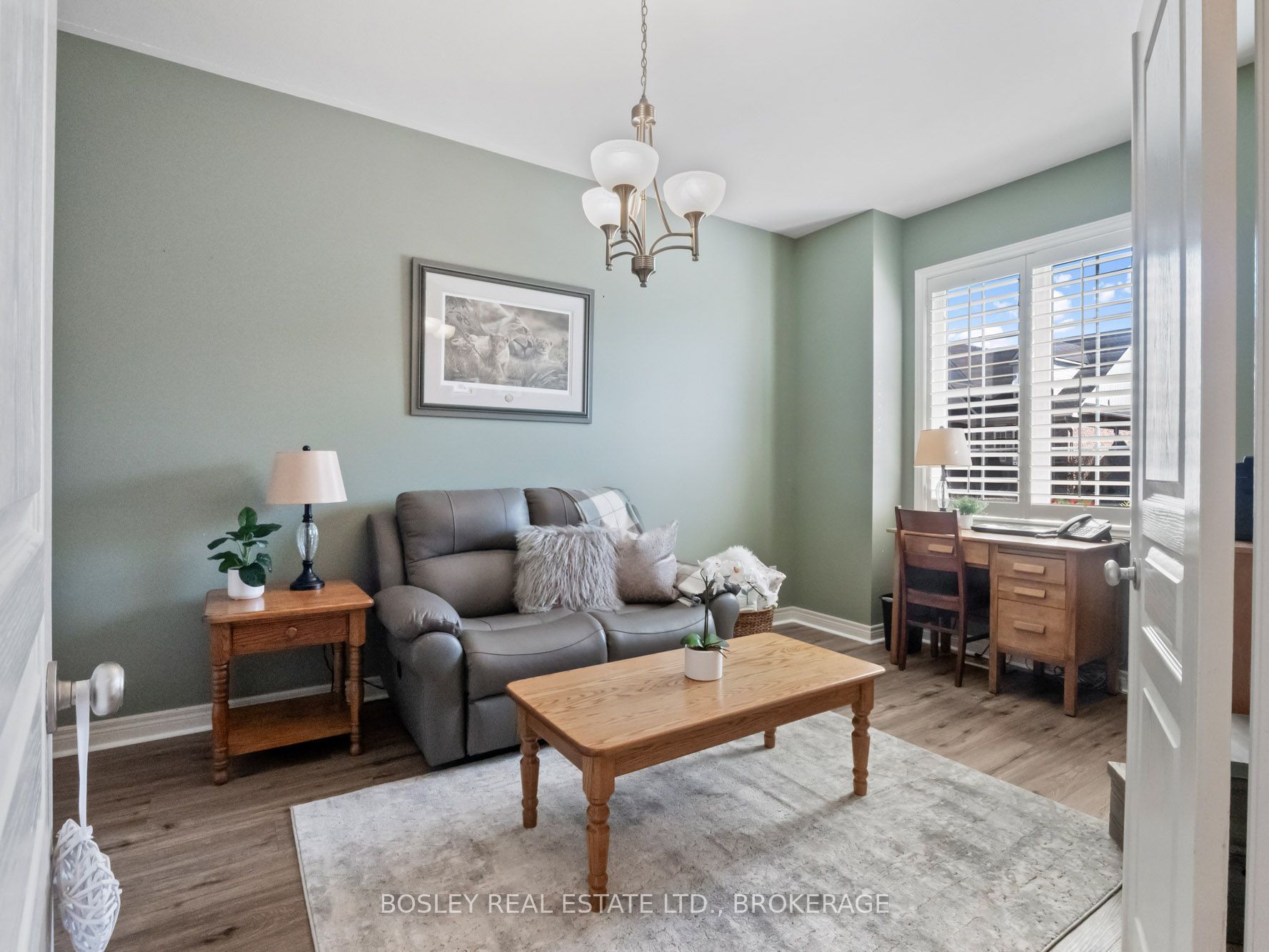 • Bright living space featuring California shutters and easy patio access.