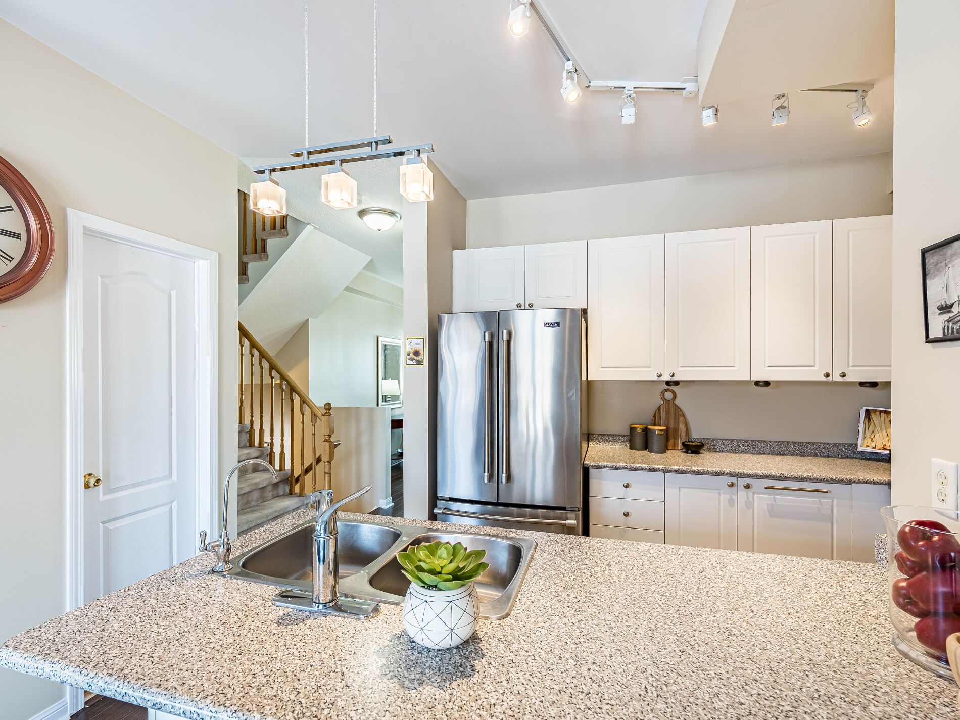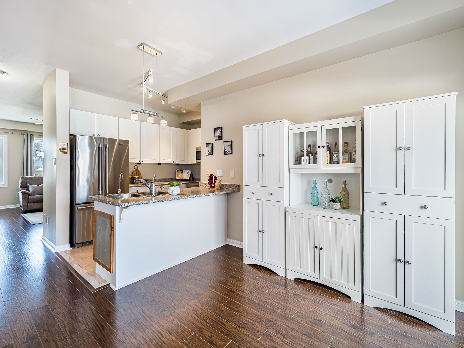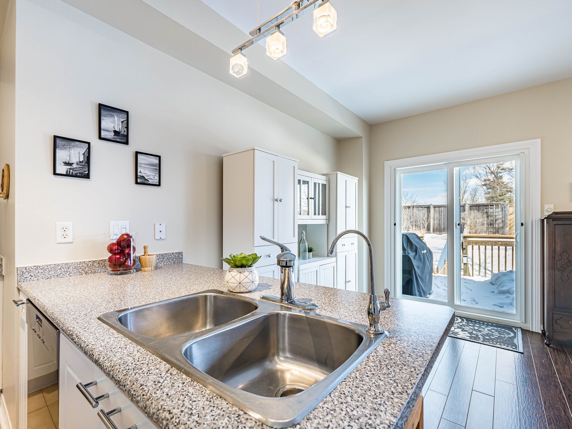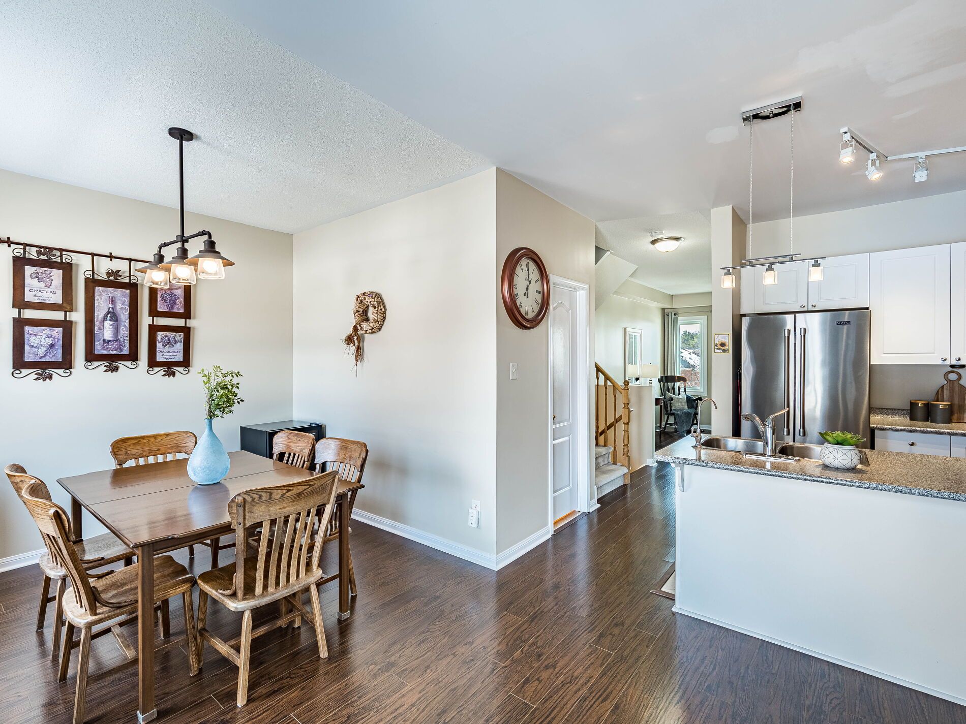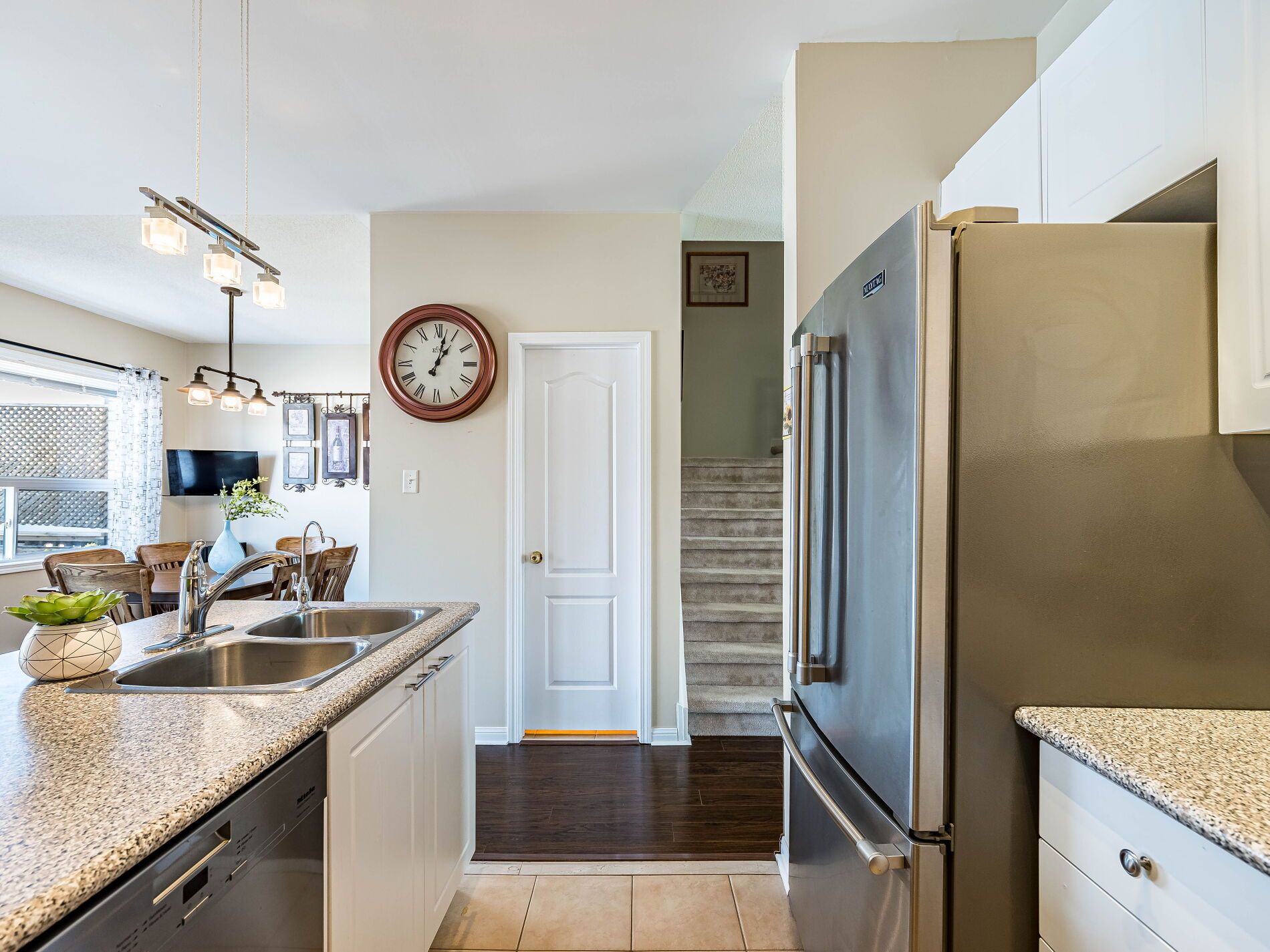 Welcome to this beautifully maintained 3-bedroom townhome in the heart of georgetown a rare opportunity featuring a 2-car garage, an exceptional find in townhome living. Thoughtfully upgraded and meticulously cared for, this home blends comfort, functionality, and modern convenience. Step inside to soaring 9-ft ceilings, durable laminate flooring, and a bright, open-concept main level designed for both everyday living and effortless entertaining. The kitchen truly stands out with soft-close cabinetry, smart storage solutions, stainless steel appliances, a premium jennair induction/convection oven, miele dishwasher, and a gas line ready for your bbq on the walkout deck. New patio doors and high-efficiency windows including several magic windows with triple-pane glass and blackout shades fill the home with natural light while creating a quiet, energy-efficient retreat. Upstairs, you'll find 3 spacious bedrooms. The primary suite offers a large closet and private 4-piece ensuite complete with a relaxing soaker tub. A semi-ensuite main bath with a tiled shower serves the additional bedrooms, providing comfort and convenience for family or guests. The versatile lower level features large windows, a finished storage room, laundry/utility area, and direct access to both the backyard and garage perfect for organized, functional living. Additional highlights include a brand-new a/c, furnace (2022), owned tankless water heater (no rental fees), culligan water purification system, water softener, central vacuum, ecobee thermostat, 220v garage outlet, belt-drive opener, and a fully fenced backyard. Located just minutes from vibrant downtown shops, restaurants, parks, trails, schools, and the go station, this home offers the perfect balance of small-town charm and commuter convenience. With rare garage space, extensive upgrades, and an unbeatable location, this is a standout opportunity you won't want to miss, book your private showing today and experience it for yourself.