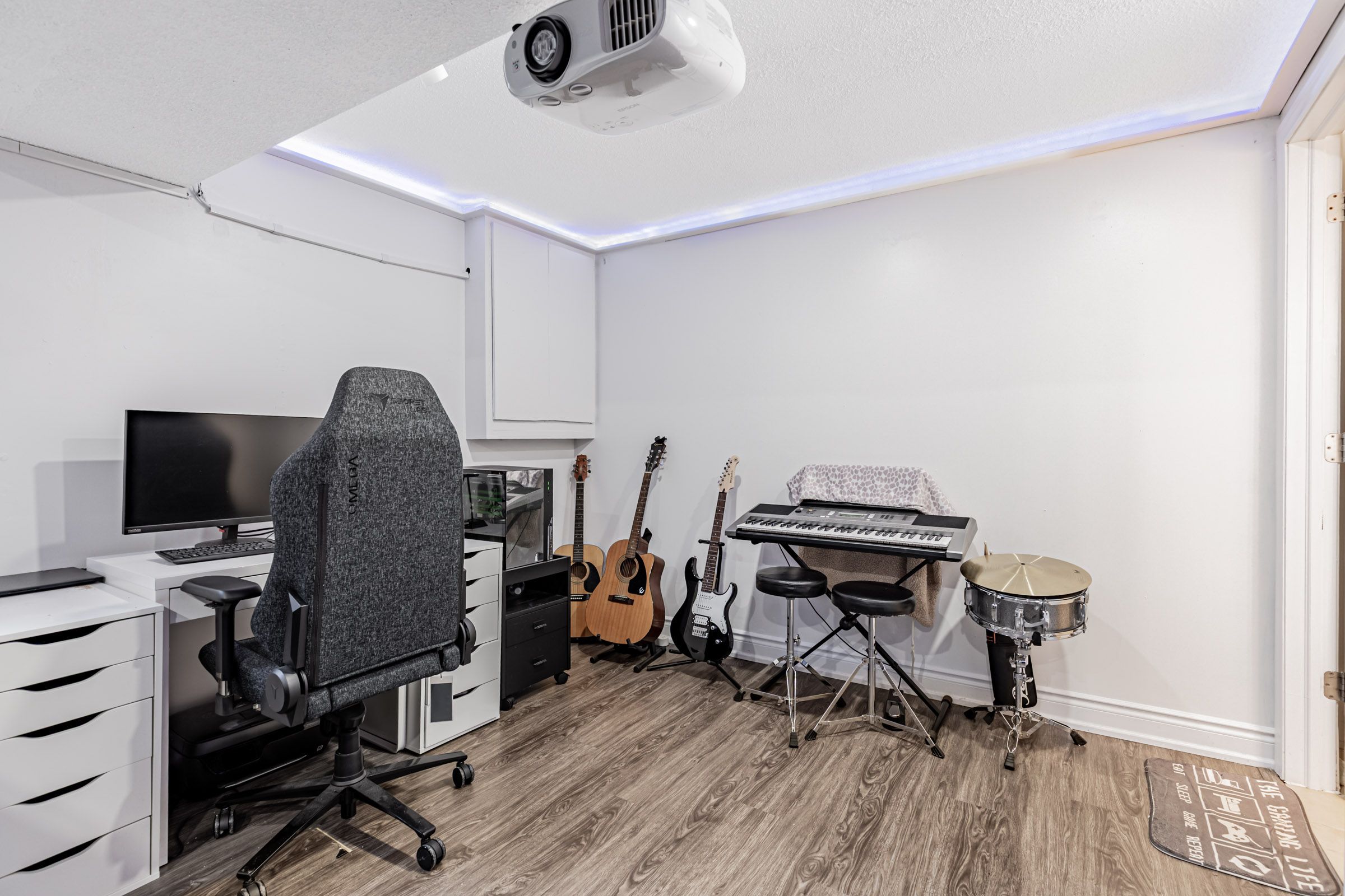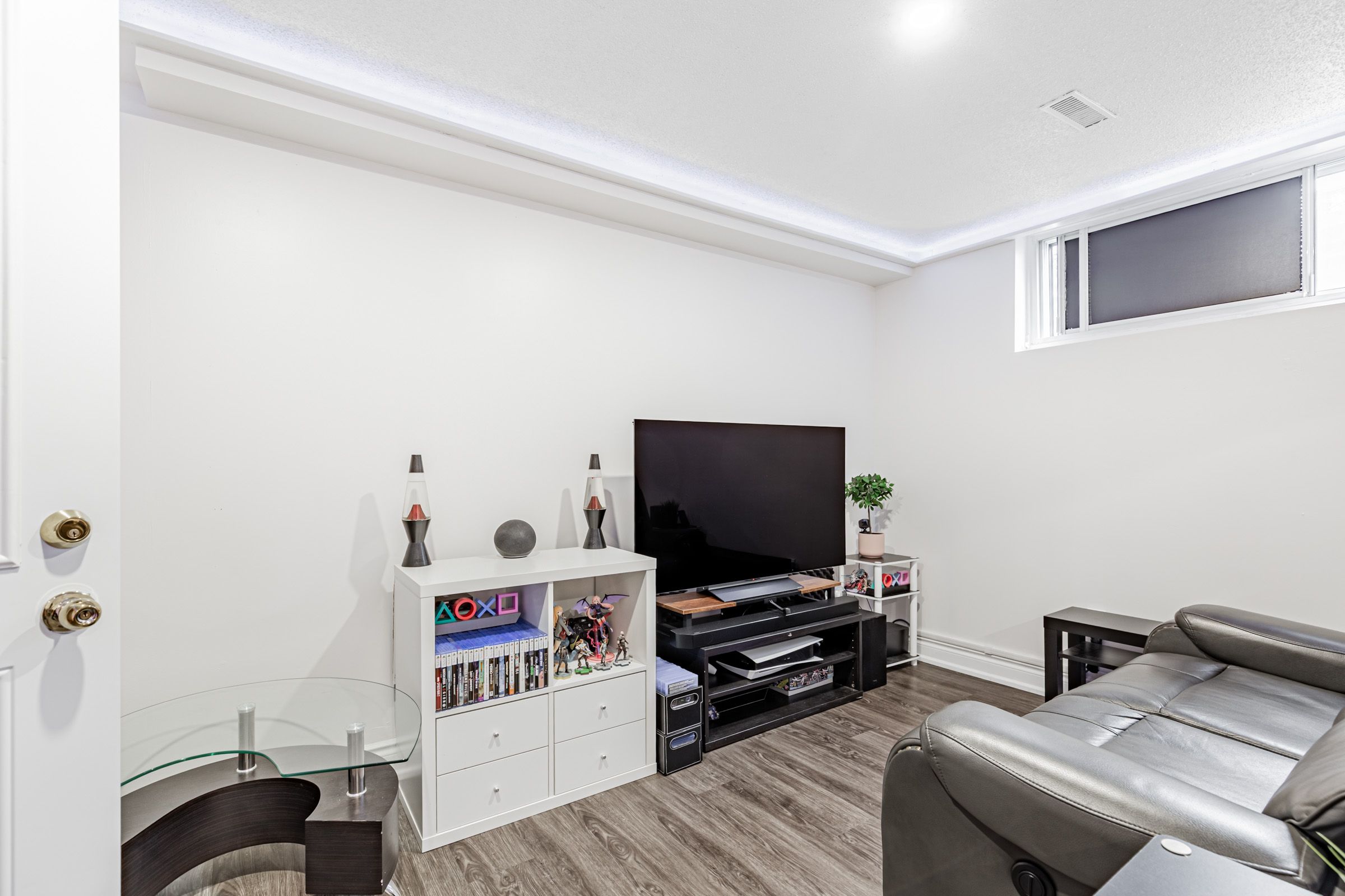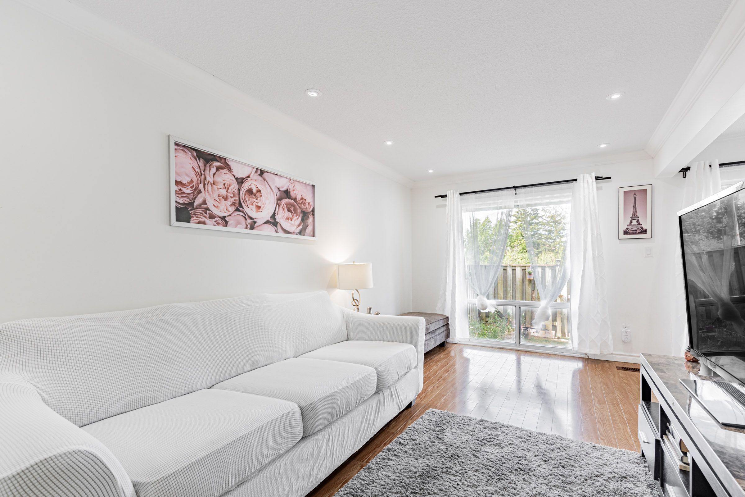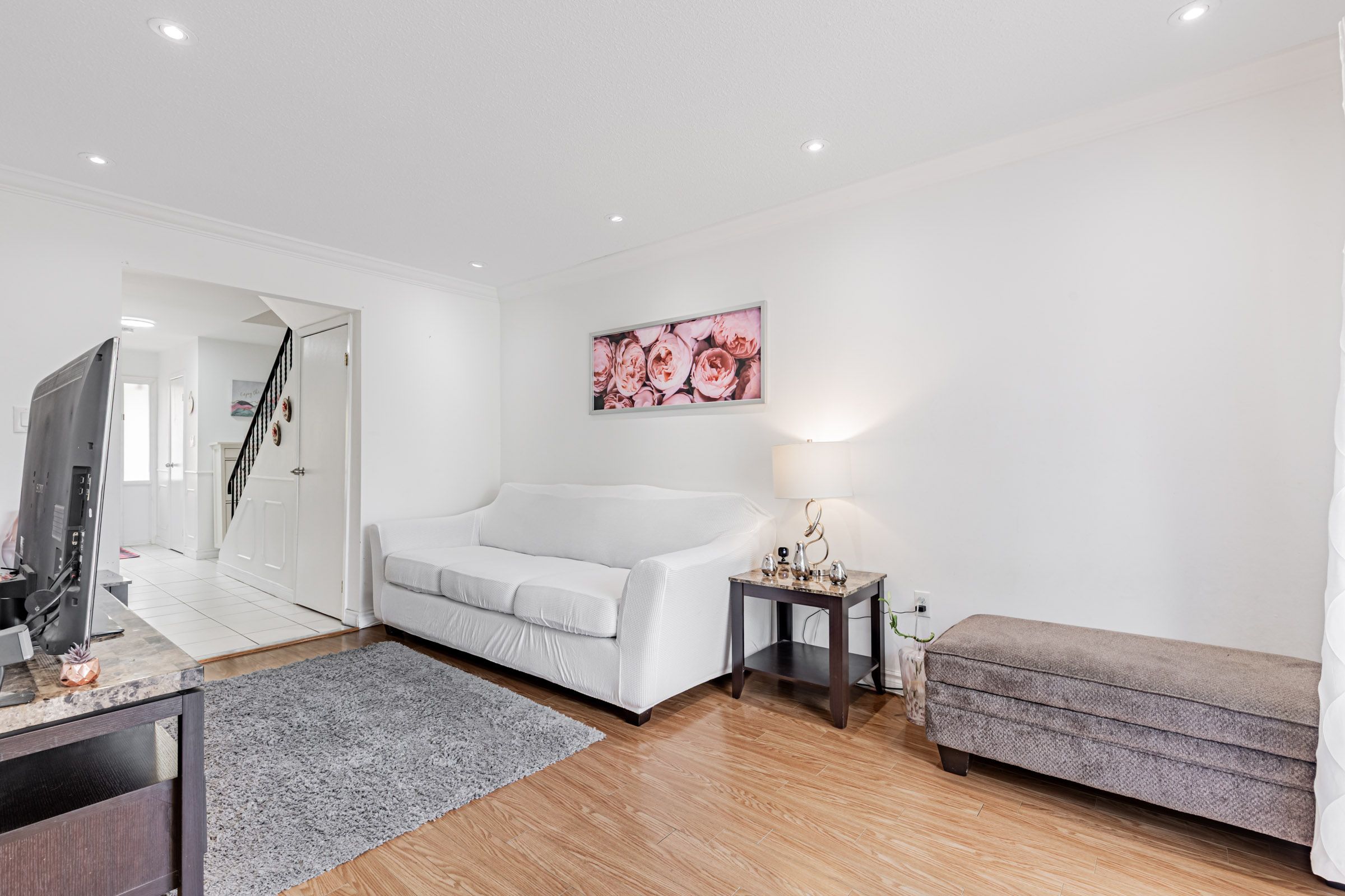 • Open-concept living area with pot lights and elegant crown-molding throughout.