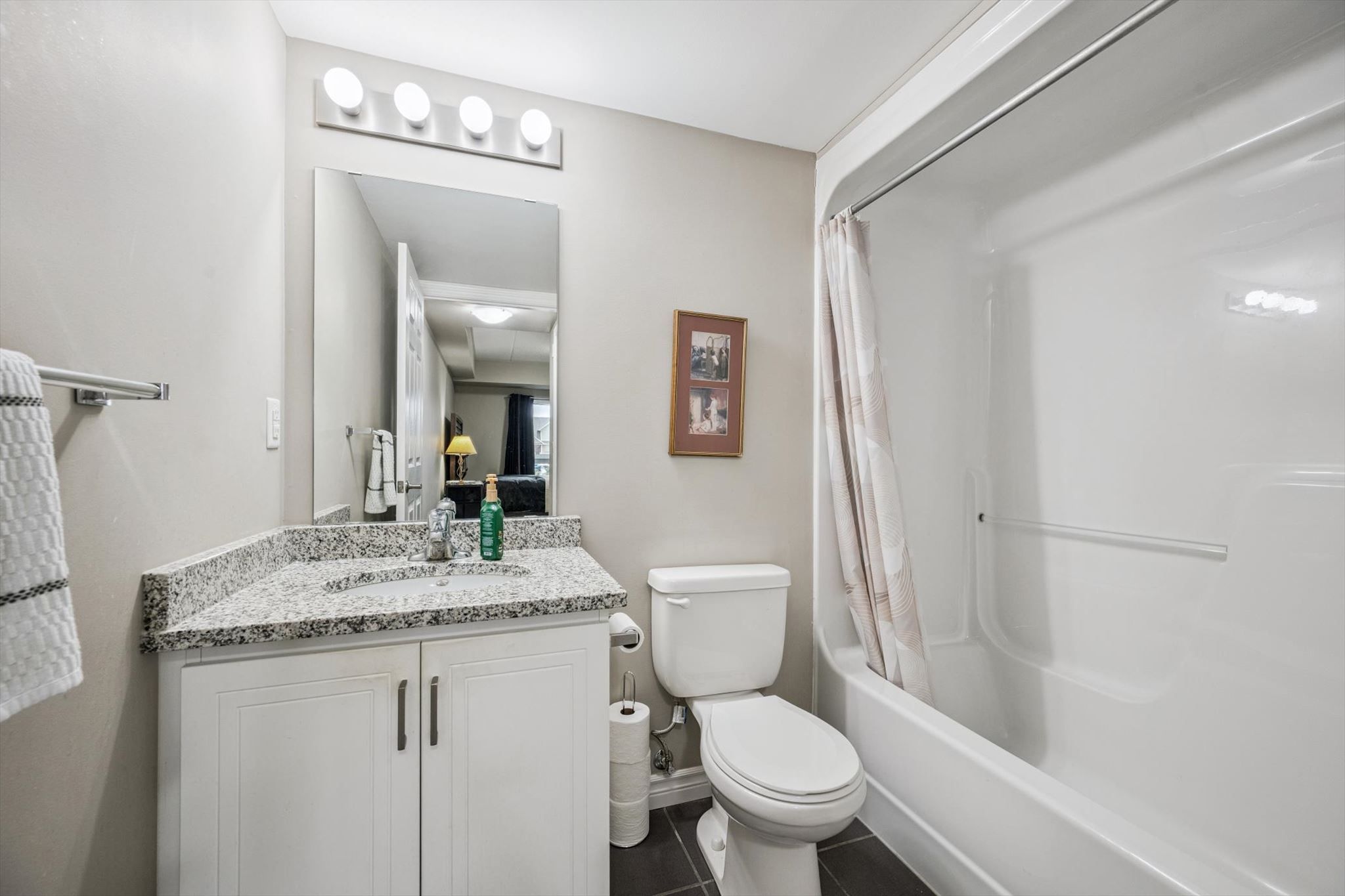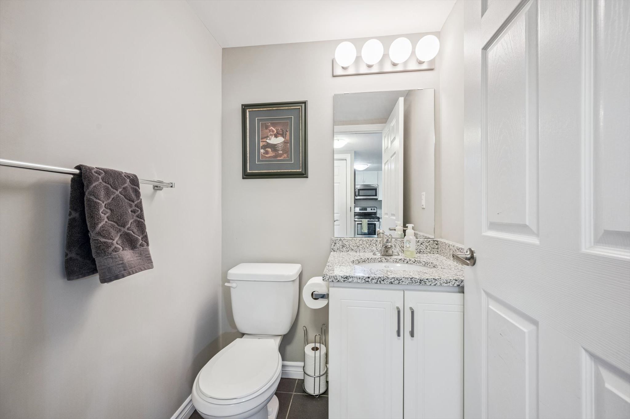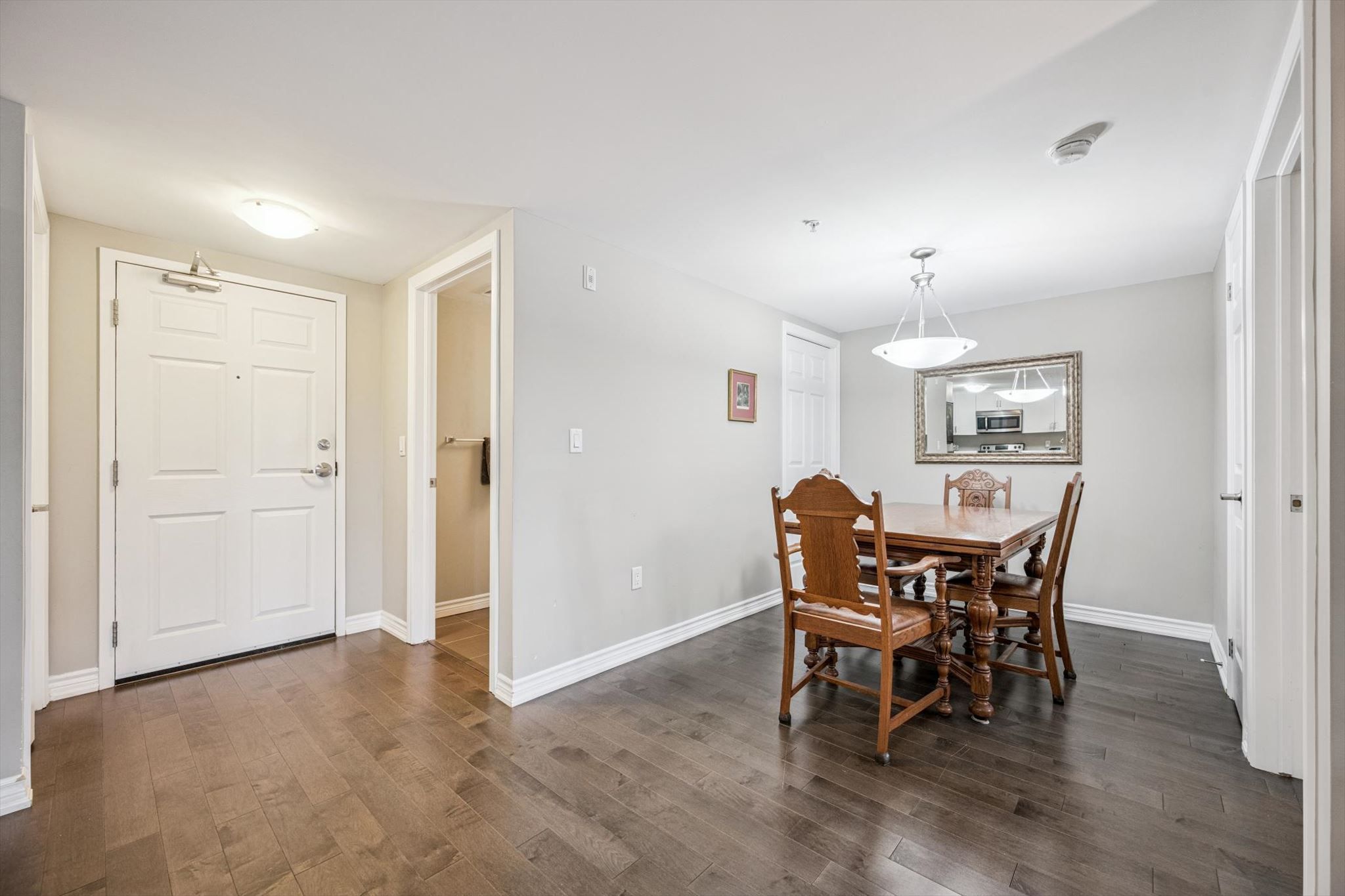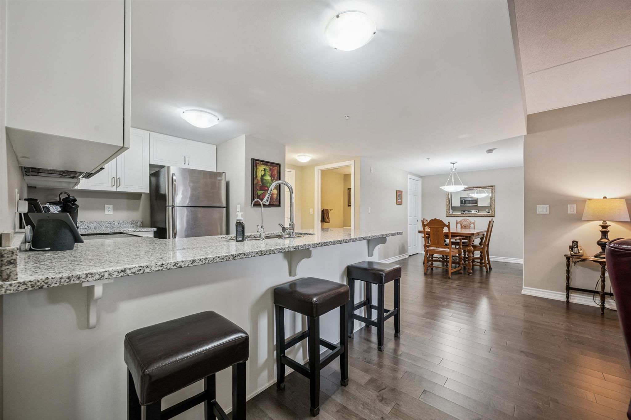 • Open concept design with hardwood floors and granite countertops.