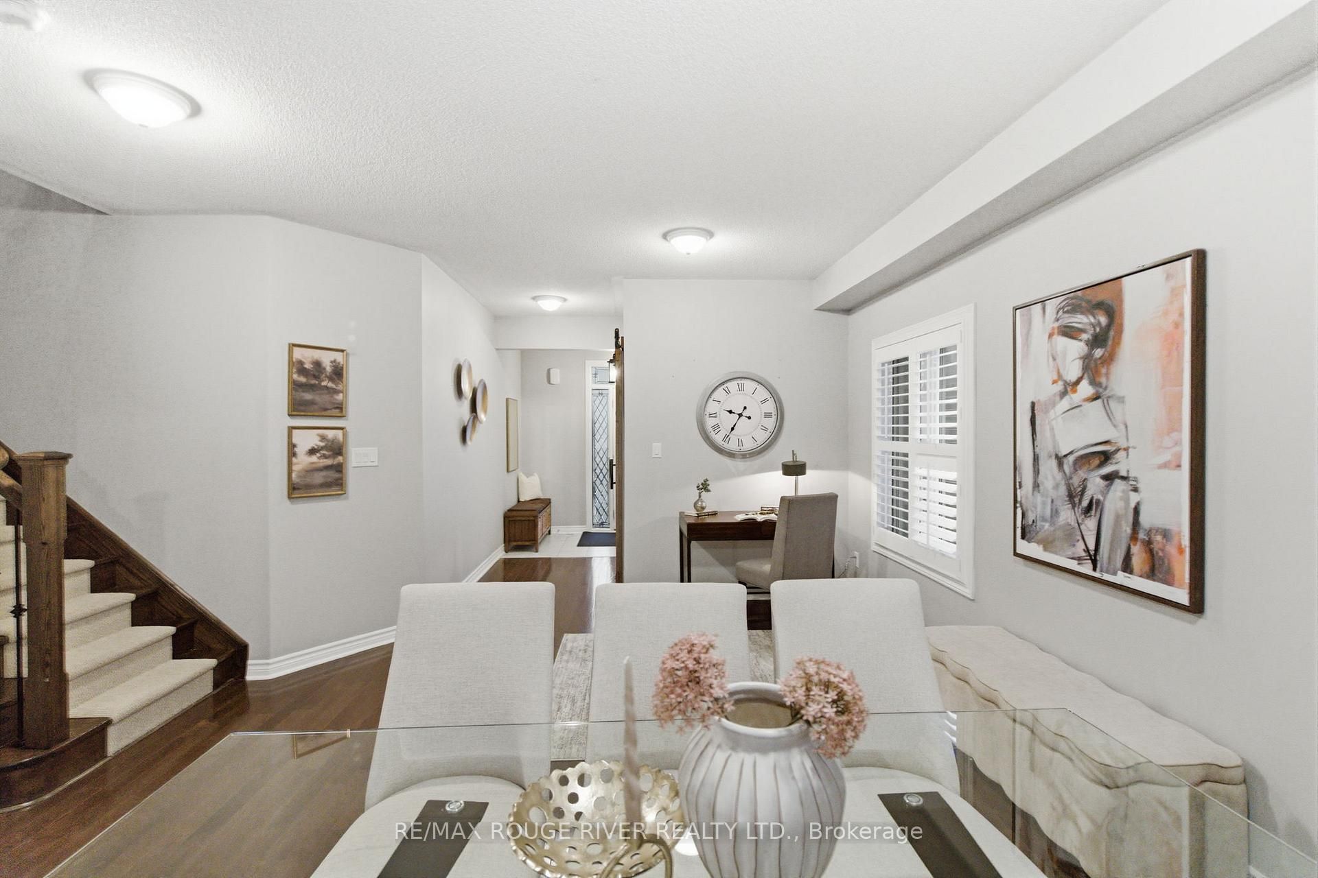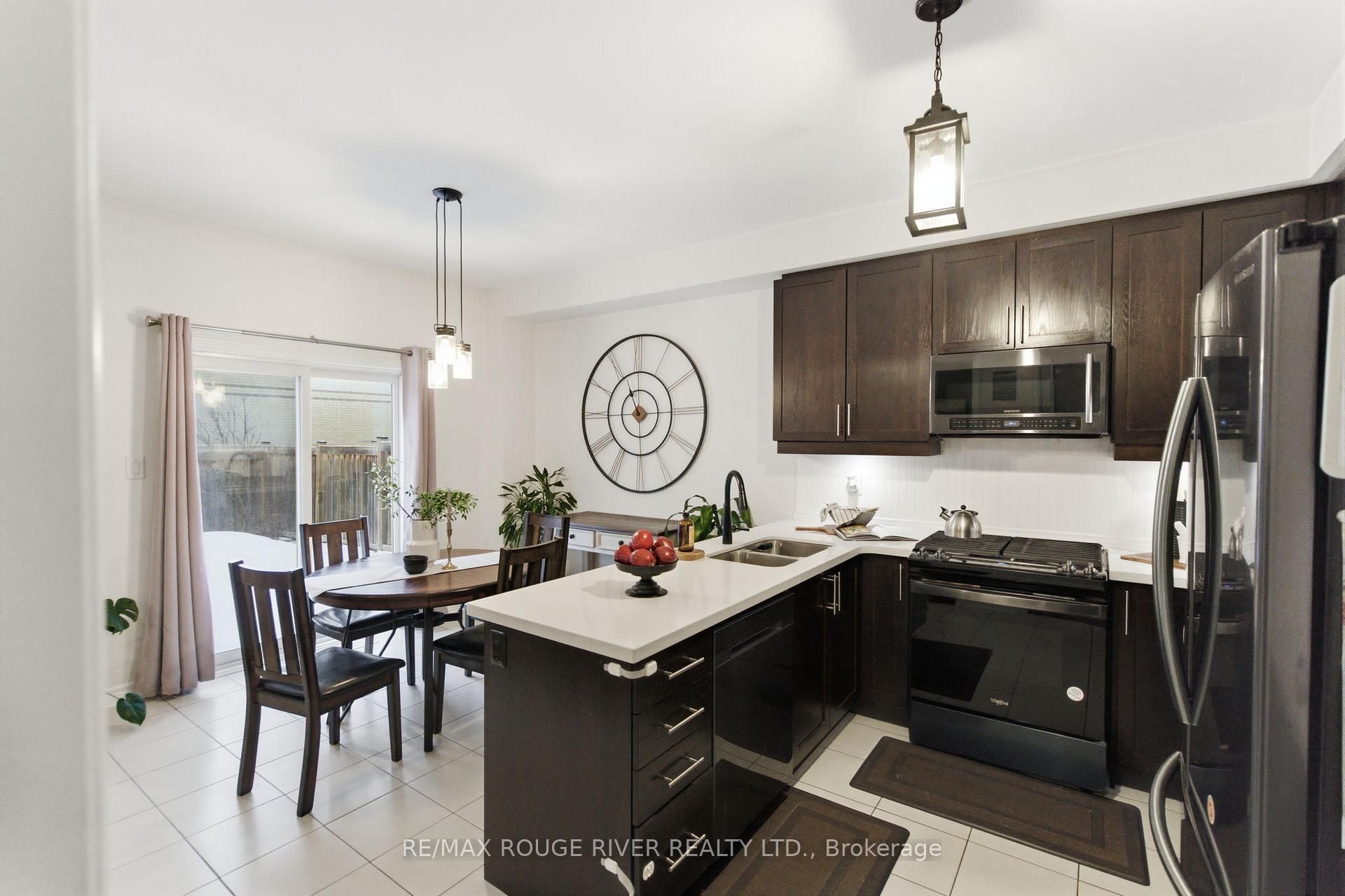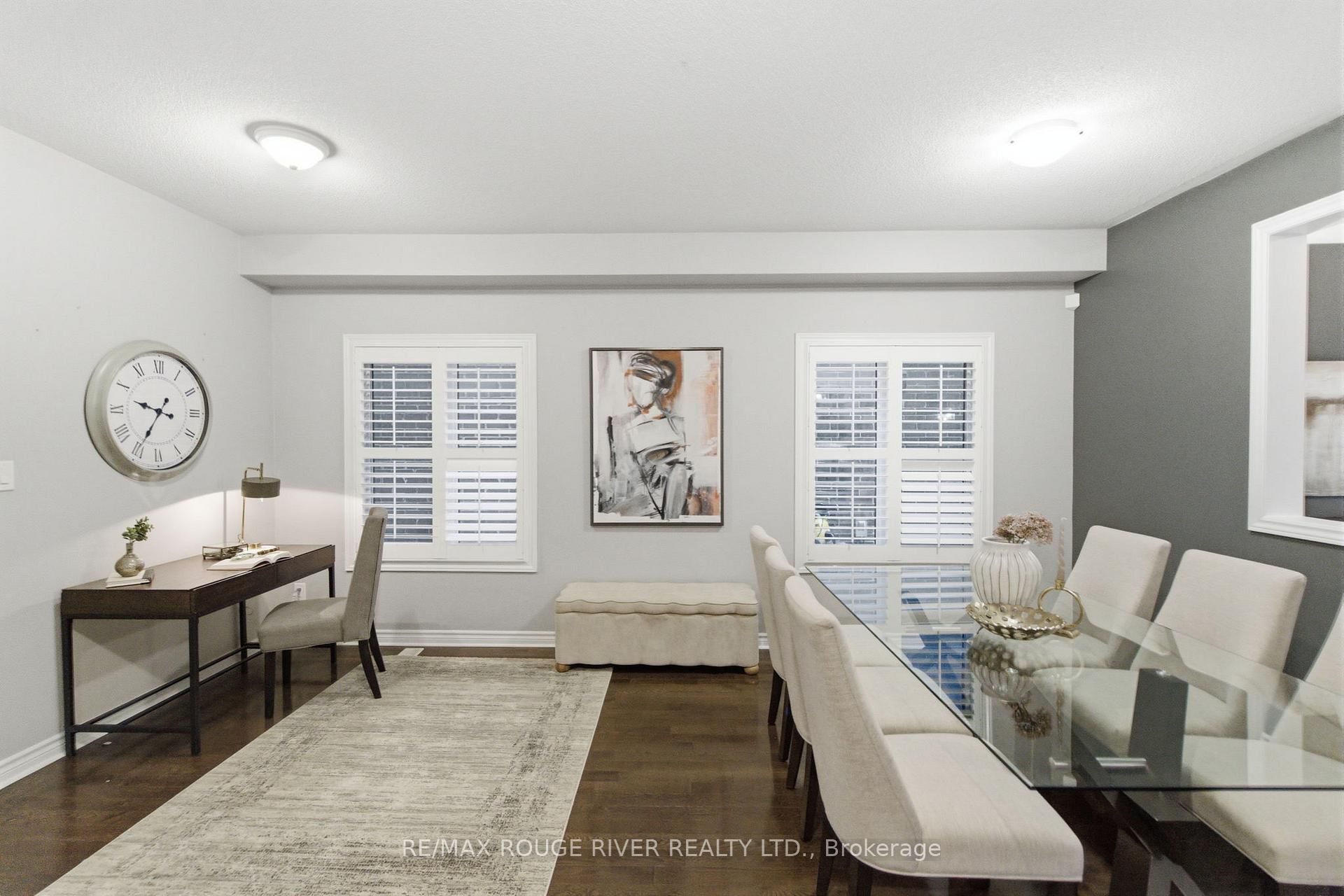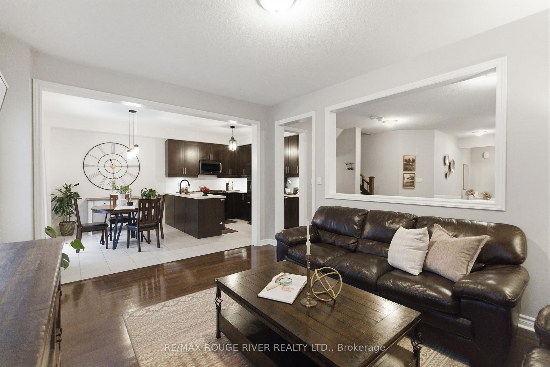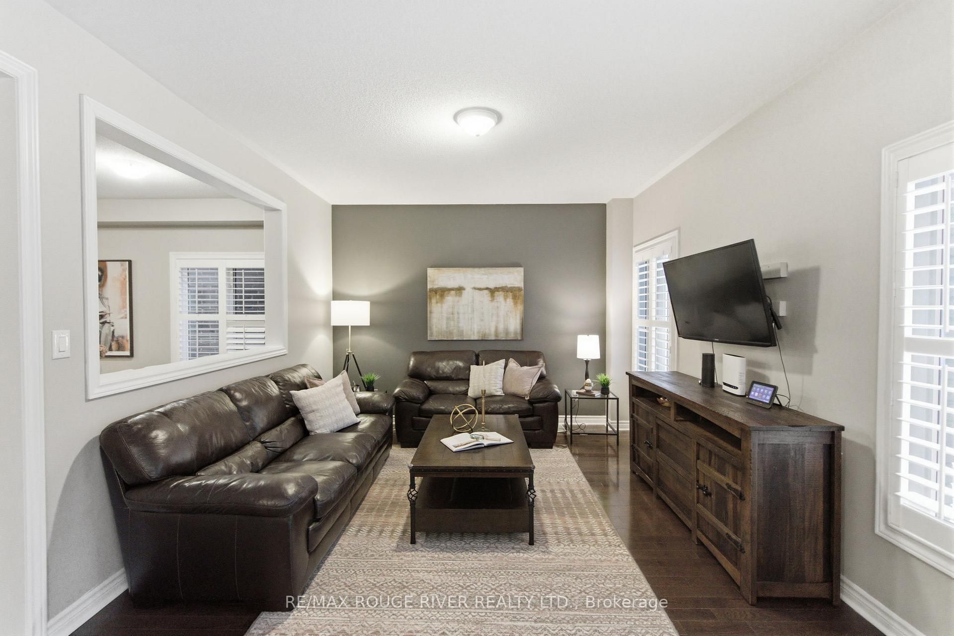 Step into this beautifully designed open-concept family home, built in 2016 by preston homes. The main floor boasts 9-foot ceilings, hardwood and ceramic flooring, and a bright, inviting living room overlooking the backyard, complete with california shutters. Adjacent is the formal dining room with elegant hardwood floors and ample natural light, flowing seamlessly into the kitchen and breakfast area. The kitchen features quartz countertops, black samsung stainless steel appliances, and a breakfast space with walkout access to the private backyard. A convenient main floor laundry adds to the practicality of this level. Upstairs, the primary bedroom offers a luxurious 5-piece ensuite and his-and-hers walk-in closets. Three additional bedrooms provide plenty of space for family and guests, each with broadloom flooring and ample closet space. The partially finished basement offers a versatile recreation area, pot lighting, windows for natural light, and rough-ins for a kitchenette and 3-piece bathroom, along with a cold room for added storage. Outside, the backyard is private and family-friendly, backing onto dr. G. J. Macgillivray public school, offering peace of mind and convenience. The property features professionally landscaped front, back, and side yards, creating an inviting outdoor space for play, relaxation, and entertaining. Ideally located, this home offers easy access to durham oshawa go station and courtice go bus stop for effortless commuting. Recreation is just steps away, with south courtice arena within walking distance and clarington public library only a short drive. With every detail carefully considered, this home perfectly balances style, comfort, and practicality for modern family living.