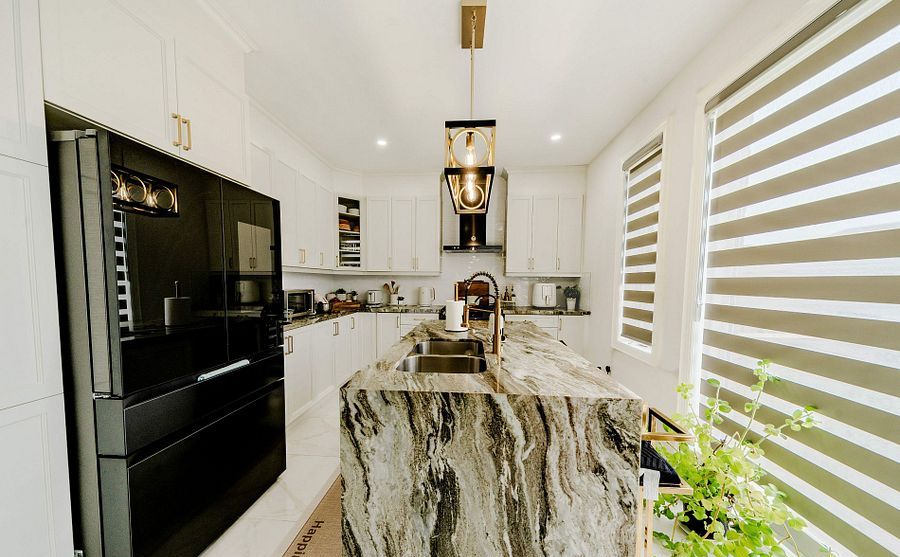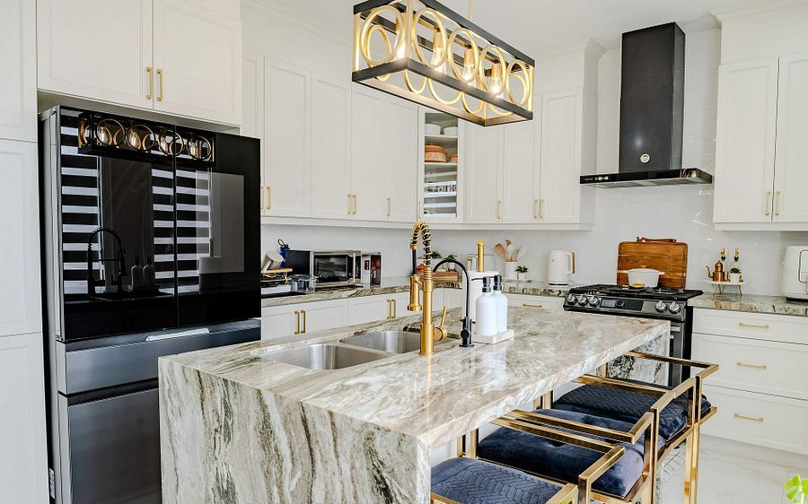 • Modern chef's kitchen with stainless steel appliances and large deck access.