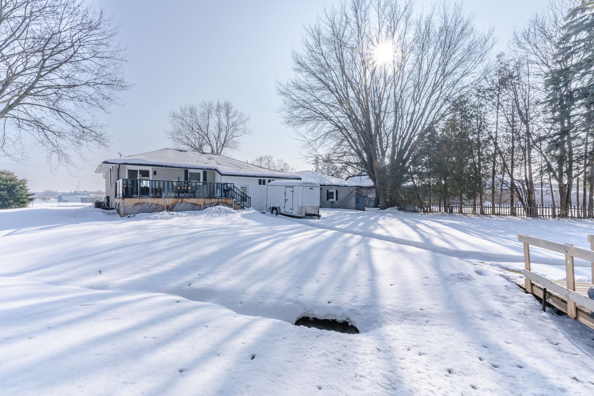 Welcome to this absolutely stunning, fully updated, detached brick bungalow set on a beautiful 1. 49-acre corner lot, just walking distance to downtown orono. Enjoy country living with no neighbours in front, back, or one side, offering exceptional privacy and open views. This home features a bright open-concept main floor with engineered hardwood throughout and a fully remodeled kitchen complete with quartz countertops, a large island, and state-of-the-art appliances. The combined living and dining area walks out to a spacious deck, perfect for entertaining. The main floor also offers two generous bedrooms and a modern 3-piece bathroom. A separate entrance leads to the finished basement, which includes its own kitchen, bedroom, large recreation area, office, and 3-piece washroom - ideal for extended family or in-law potential. The double car garage connects to both the main floor and basement through a large breezeway for added convenience. Outdoors, relax on the covered front porch or enjoy the simply gorgeous expansive backyard surrounded by mature trees. A separate driveway leads to the backyard and to the heated 20 x 28 ft workshop with garage door and loft - perfect for hobbies, storage, or additional parking for vehicles, trailers, and recreational toys. Bonus: no rentals! Furnace, hot water tank, and a/c are fully owned (2020). Located on a quiet dead-end street in a family-friendly neighbourhood with easy access to highways 115, 407, and 401, and close to all amenities, this home offers the perfect blend of city convenience and country comfort. A rare opportunity offering privacy, space, and versatility - don't miss it!