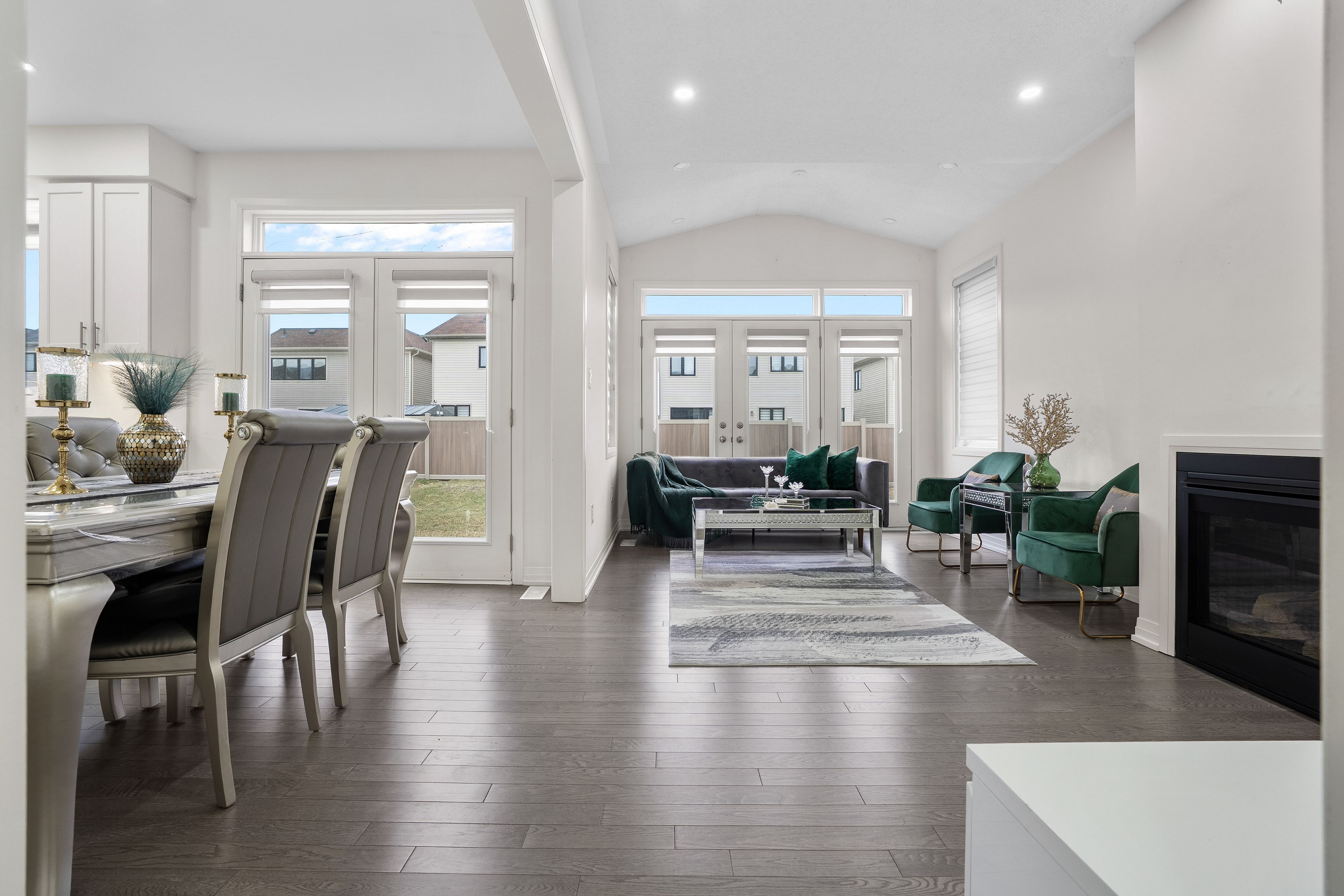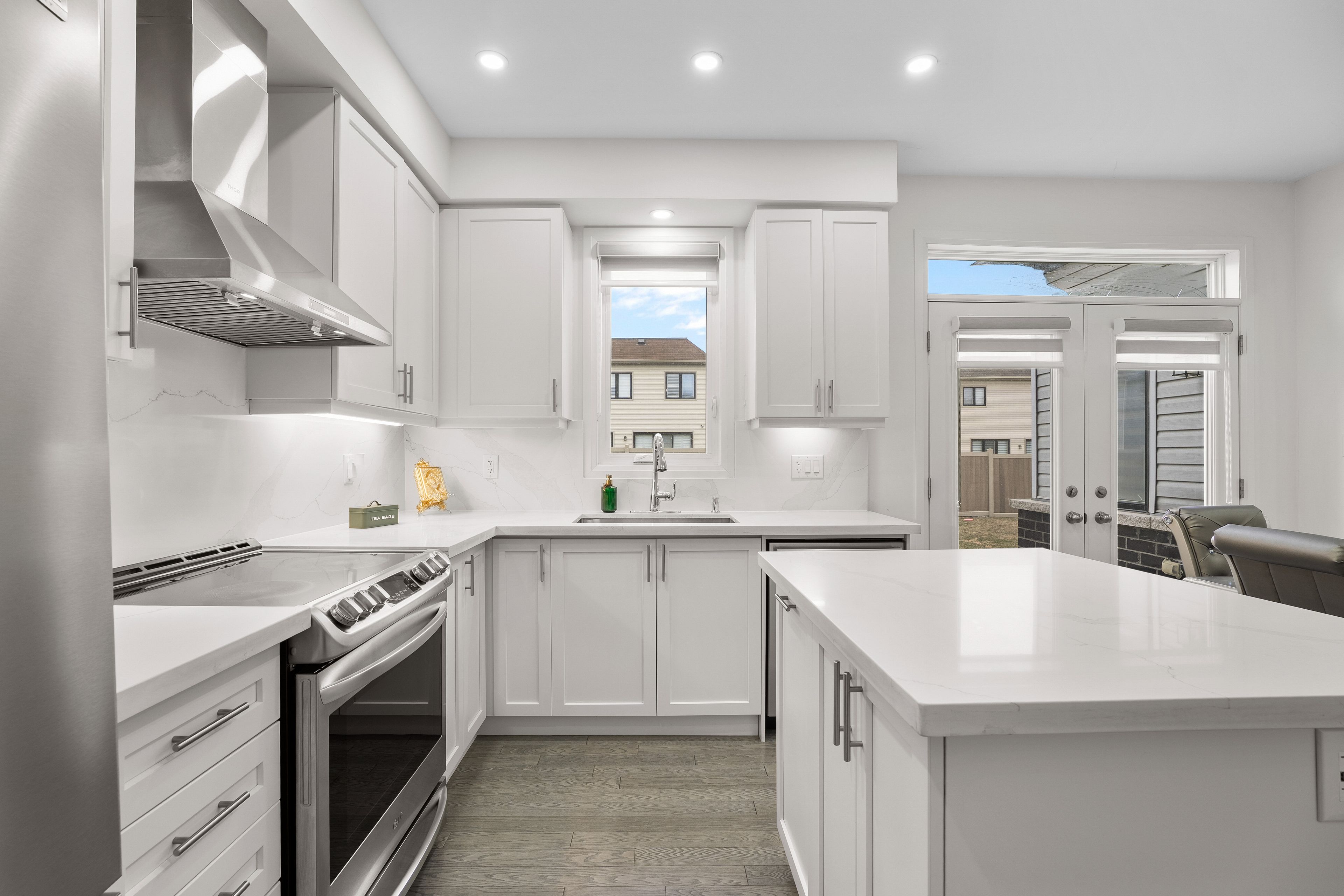 • Open-concept design with 10ft ceilings and French doors.