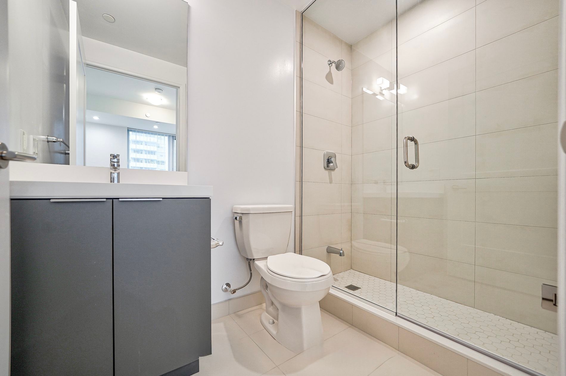 • Modern kitchen features quartz countertops and stainless steel appliances.