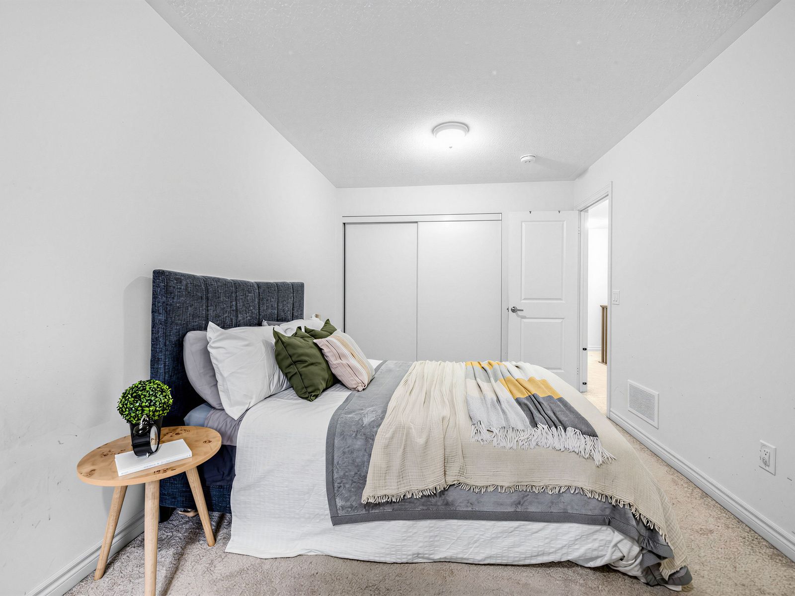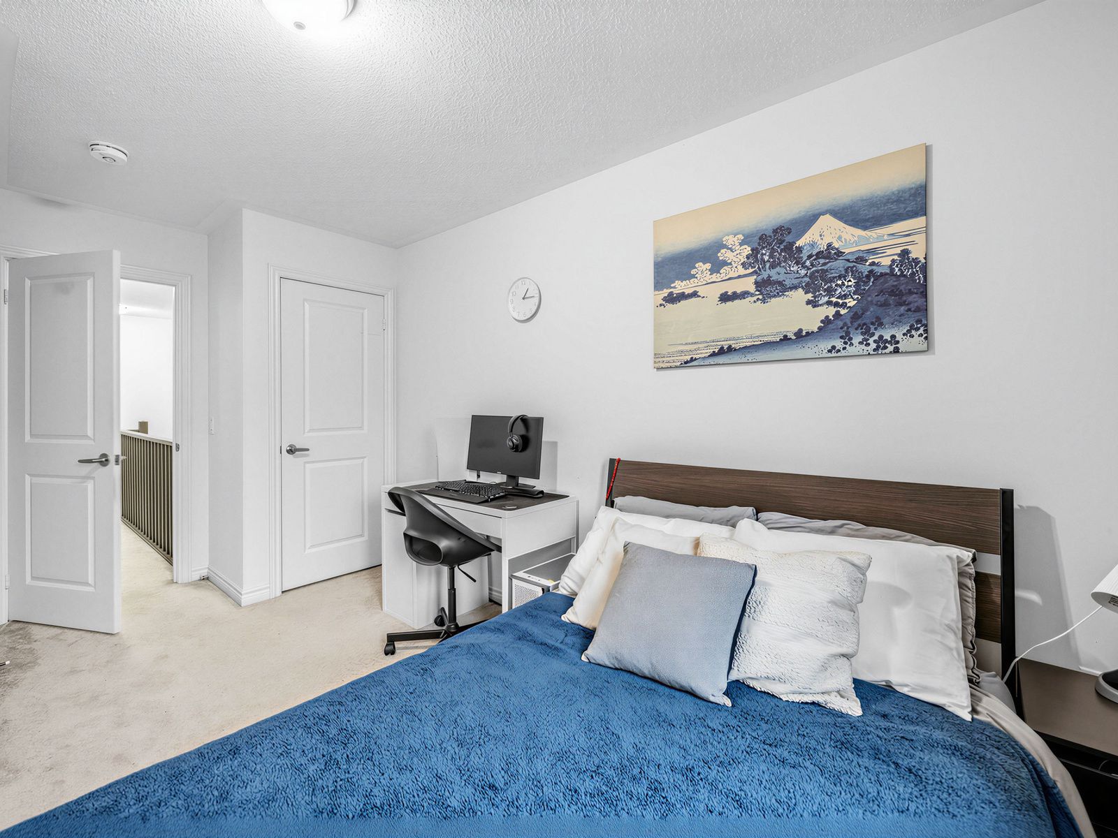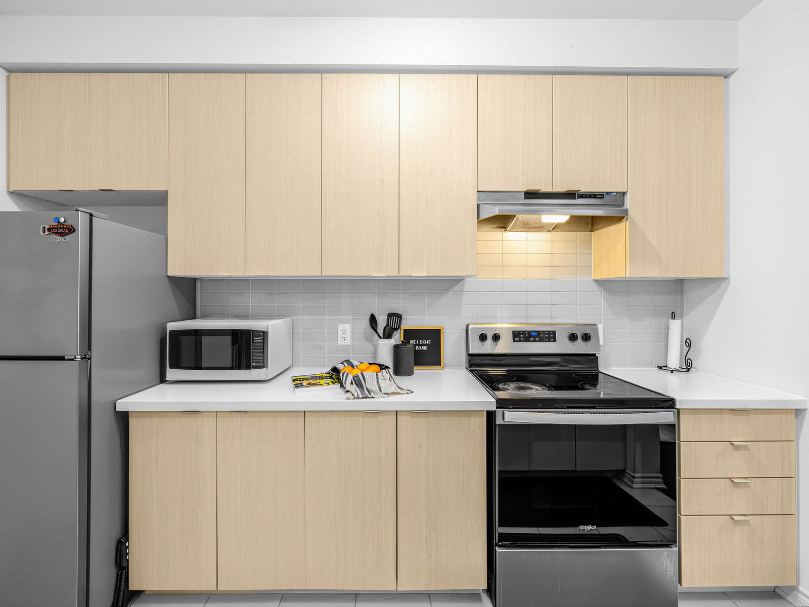 Welcome to this beautifully maintained townhome situated in a high-demand neighborhood, offering convenience and modern living. Ideally located within walking distance to shopping plazas, restaurants, schools, major highways, and everyday amenities, this home provides the perfect blend of lifestyle and accessibility. The open-concept main floor features a contemporary layout ideal for both entertaining and daily living, highlighted by a high-end kitchen with quartz countertops and quality finishes throughout. A stunning hardwood staircase leads to the upper level, where you'll find three generously sized bedrooms filled with natural light. The finished basement offers additional living space, complete with large windows and a full bathroom, making it perfect for a recreation area, guest suite, or home office. An excellent opportunity for both end users and investors, this home delivers style, functionality, and an unbeatable location.