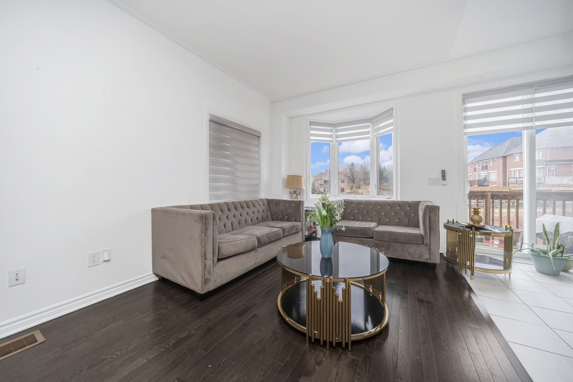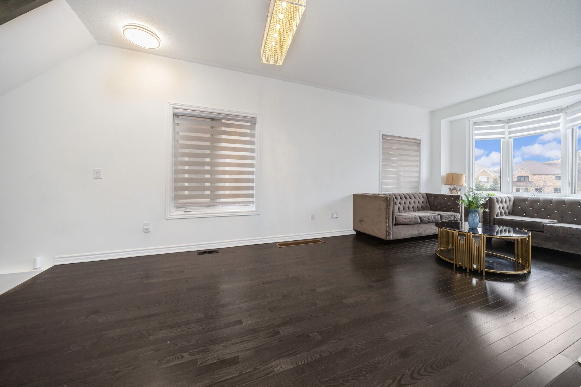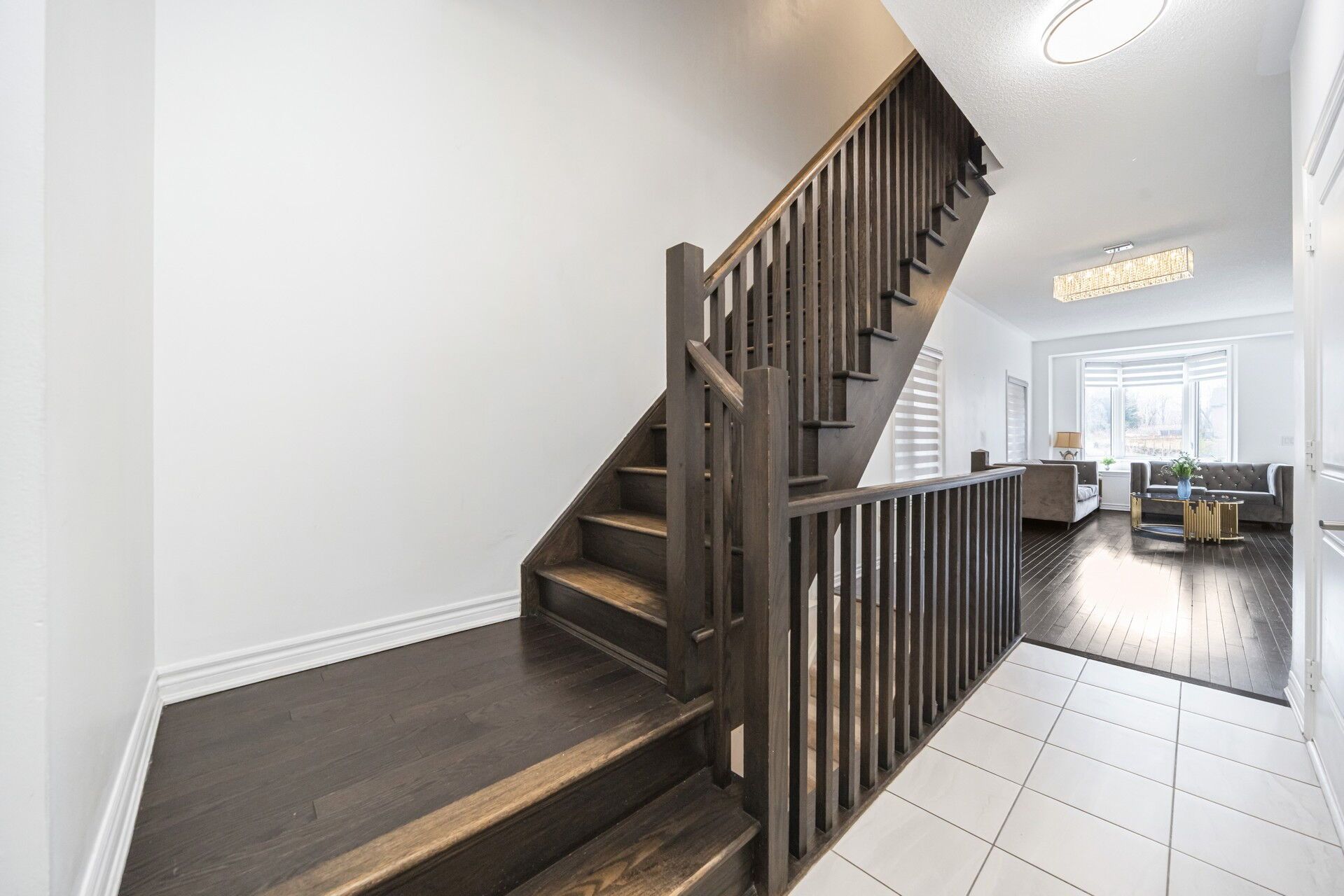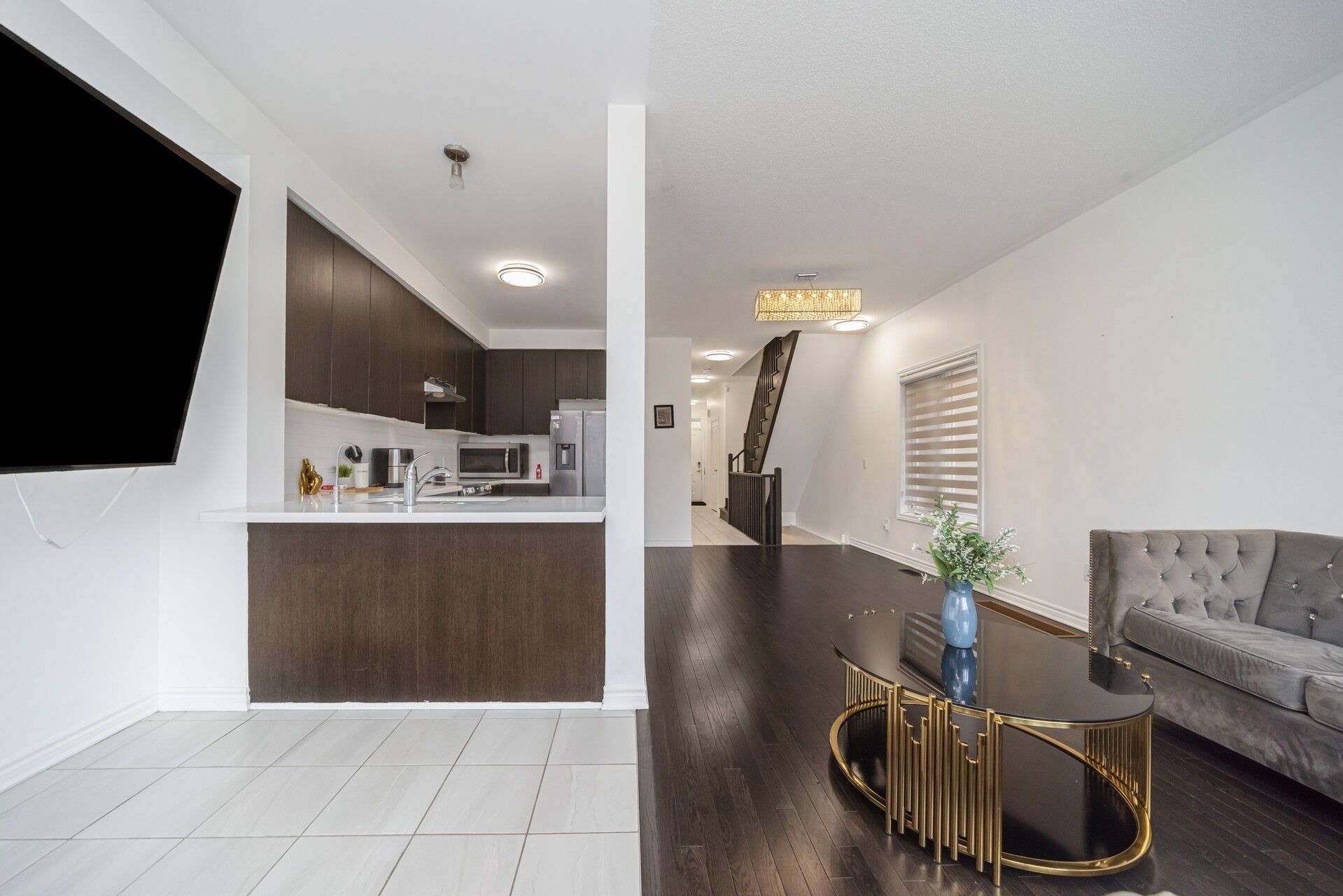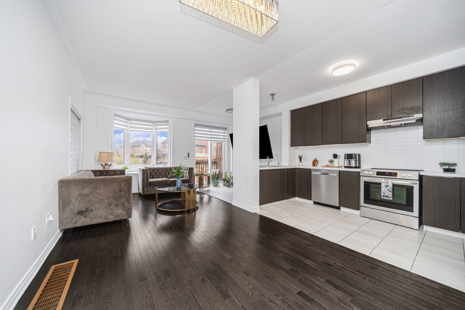 • Open-concept living and dining area with elegant hardwood flooring.