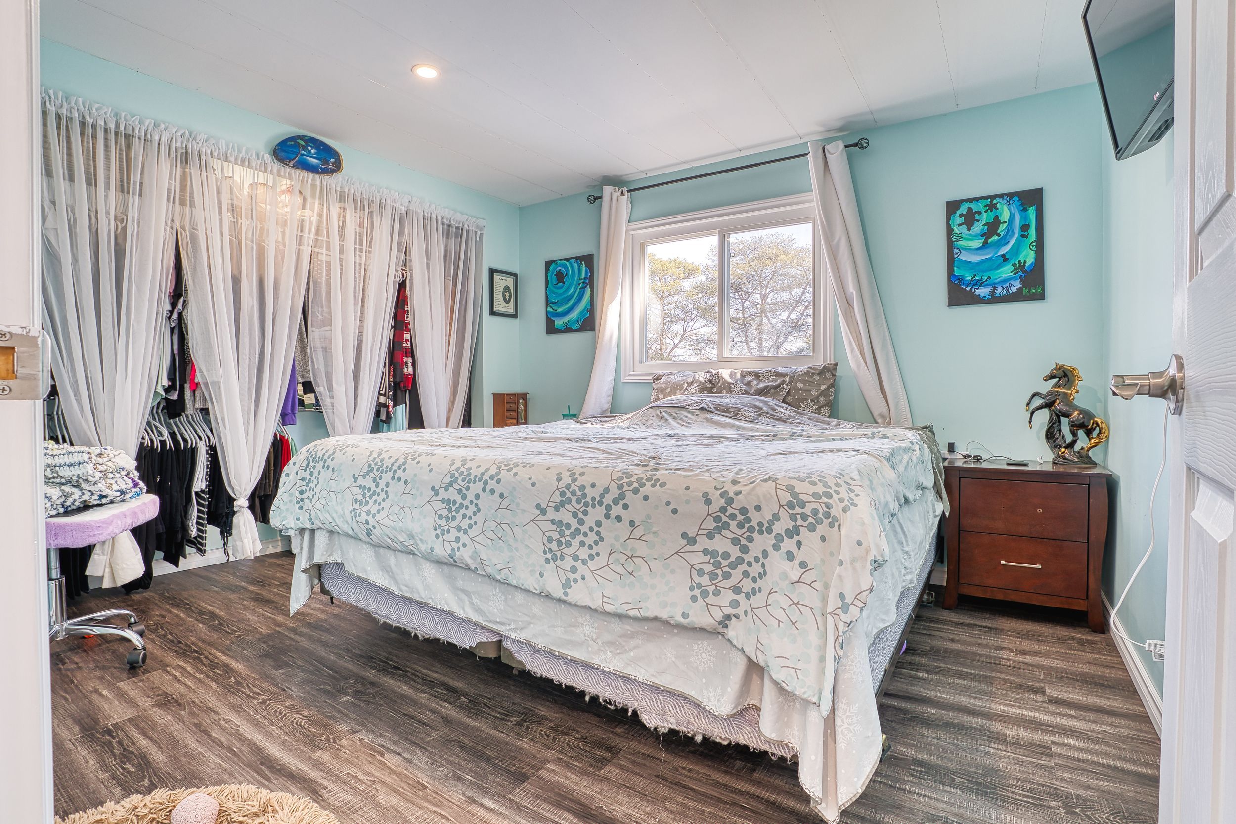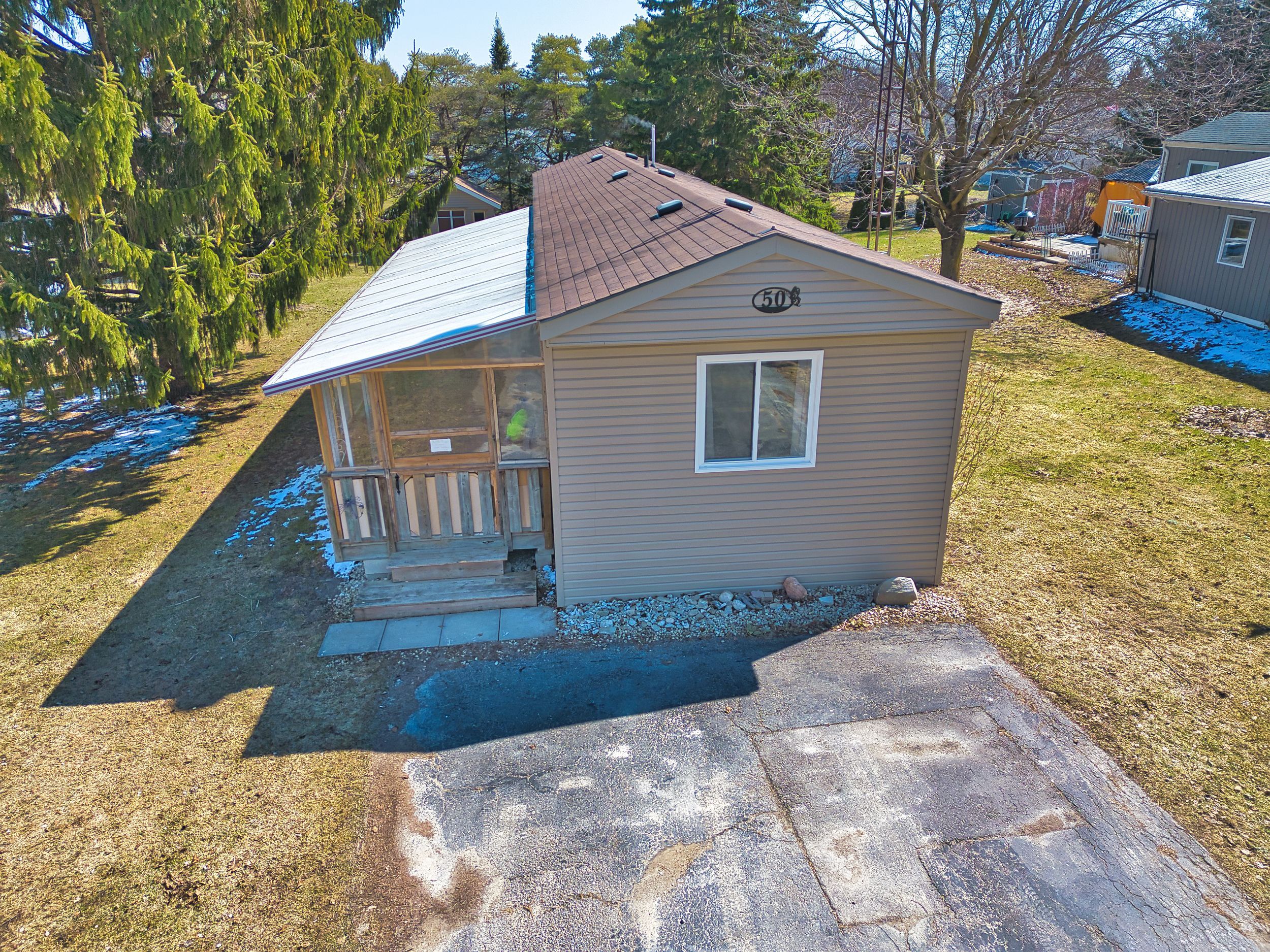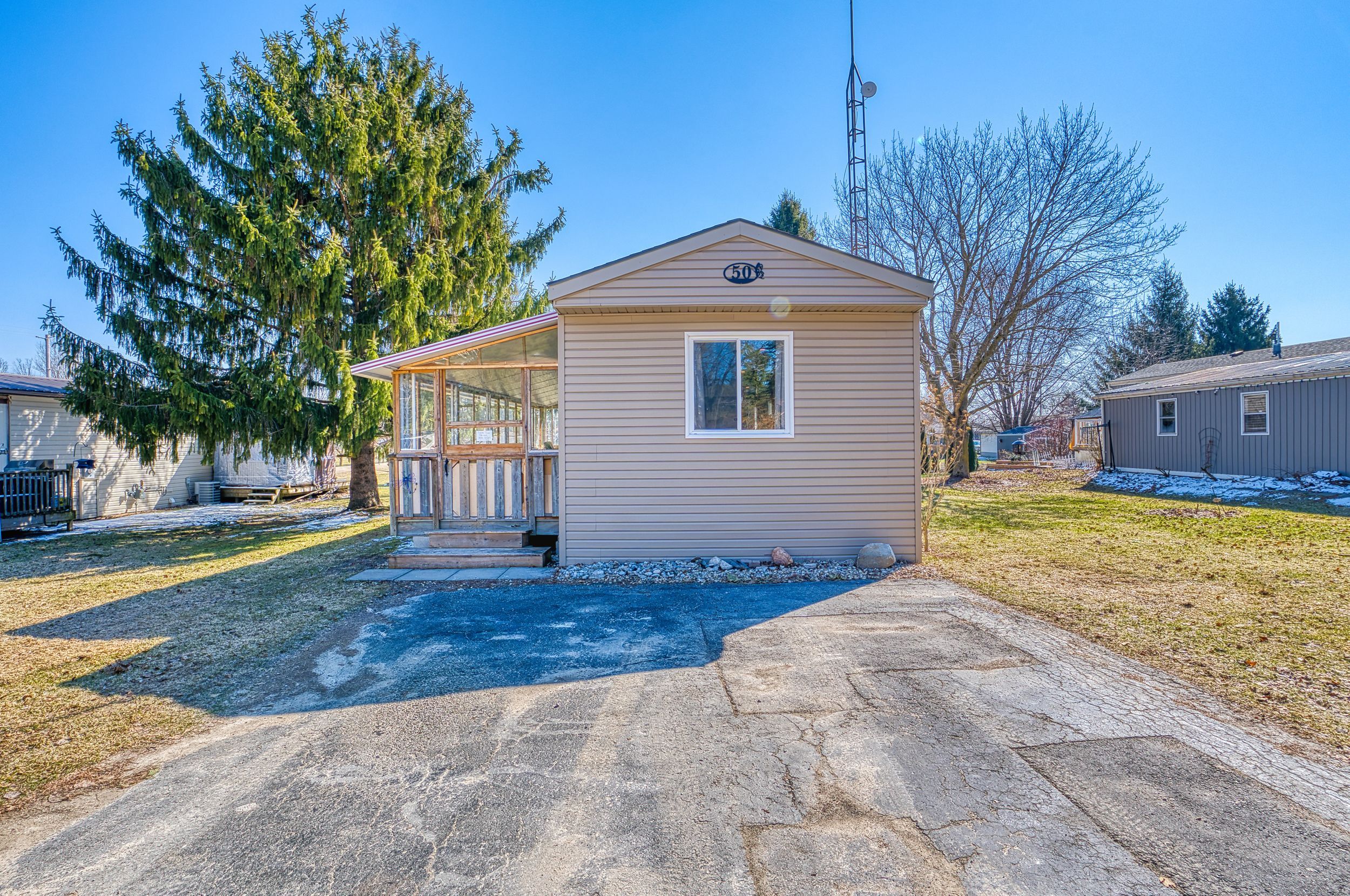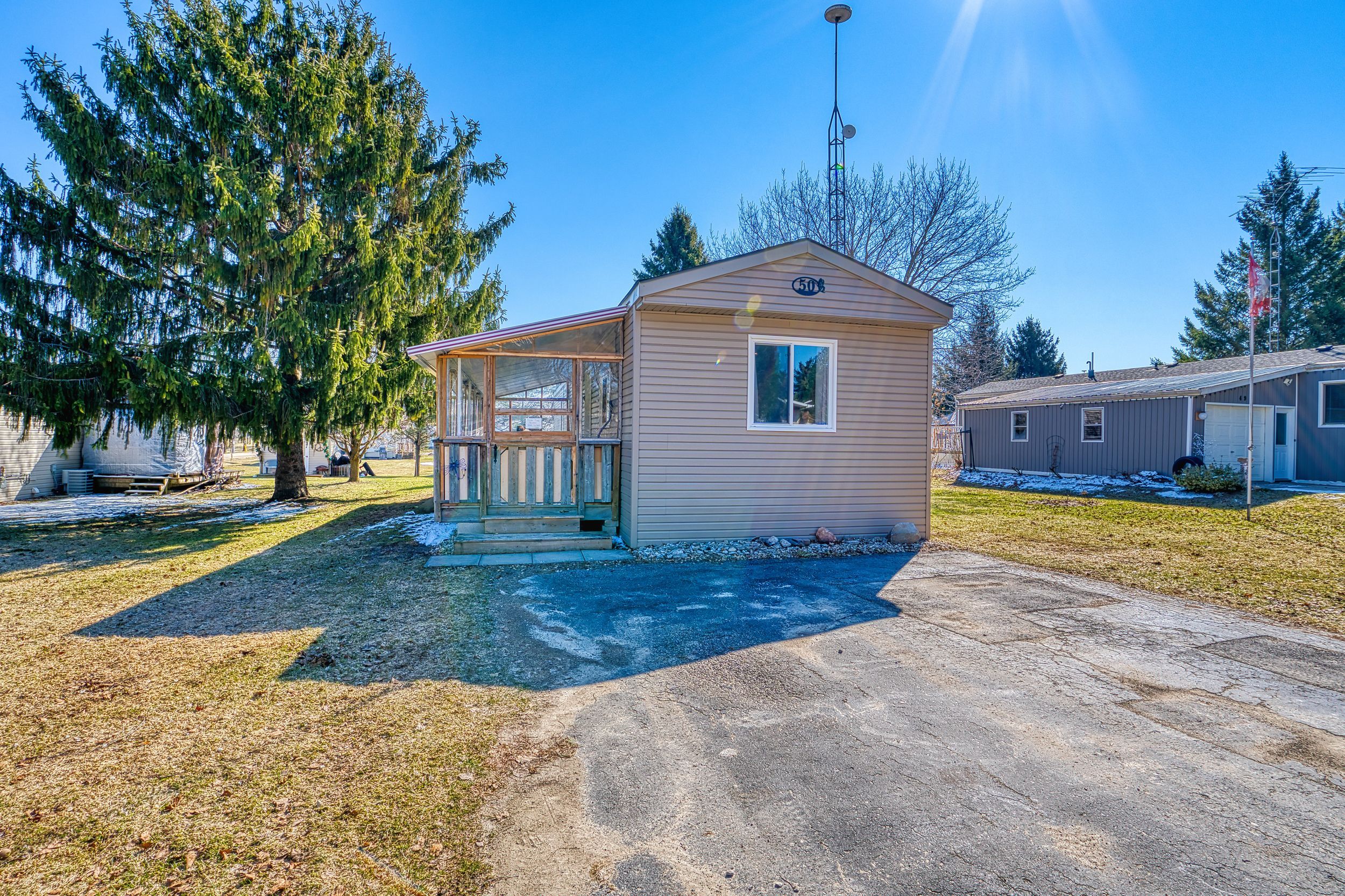 Welcome to 50 fifth ave in conestoga estates, a well-maintained land lease community offering affordable year-round living in a peaceful setting. This home features a spacious enclosed front porch with removable panels, making it the perfect spot to enjoy summer breezes or stay cozy during the colder months. Inside, you'll find a bright open-concept layout with a combined living, dining, and kitchen area, ideal for everyday living and entertaining. A wide hallway leads to a 4-piece bathroom, convenient hallway laundry, and two comfortable bedrooms. A walkout to the backyard adds extra outdoor enjoyment and easy access to the yard and storage shed. Monthly fee: $761. 49. Includes land lease fee, property taxes, and water testing. A great opportunity for affordable living in a great community, only 15 minutes to shopping, groceries and restaurants.