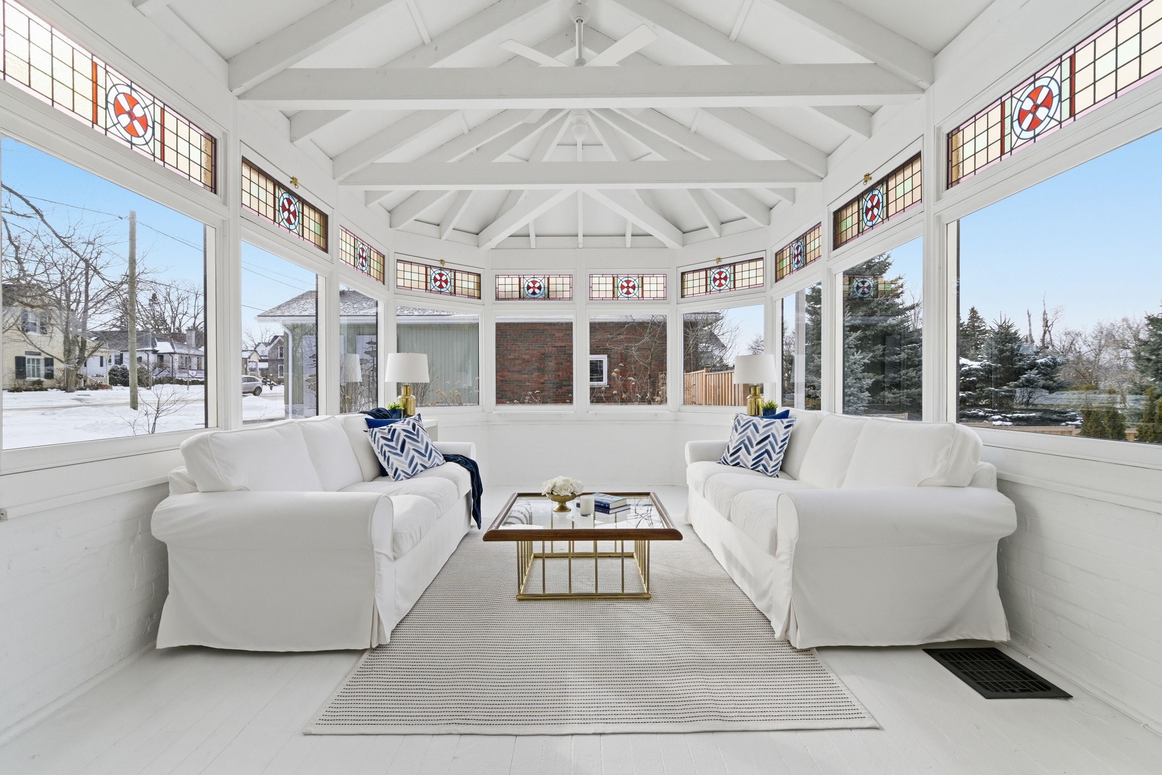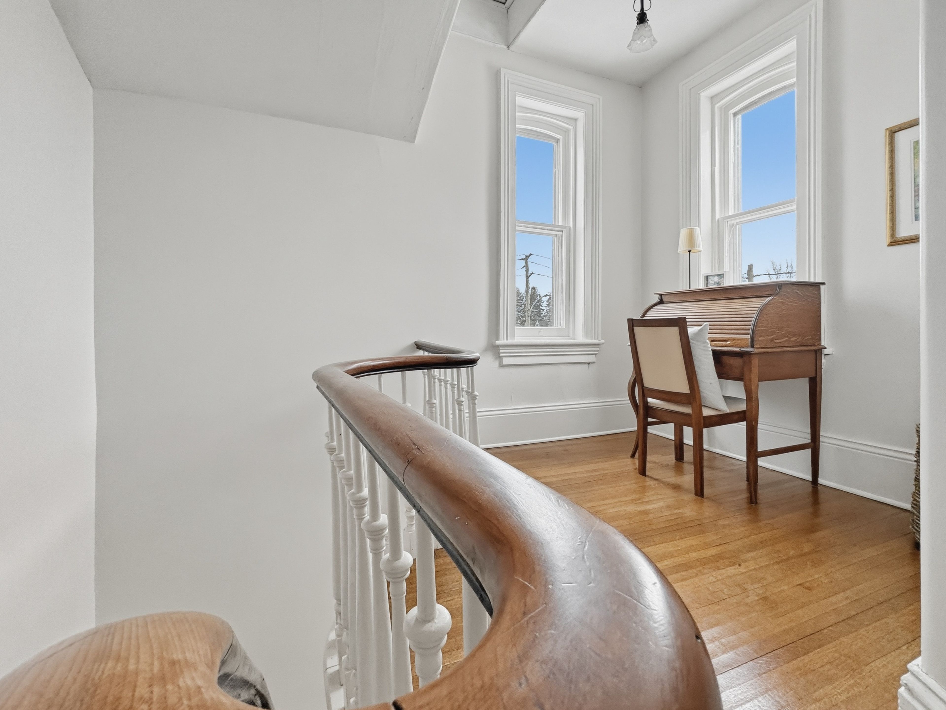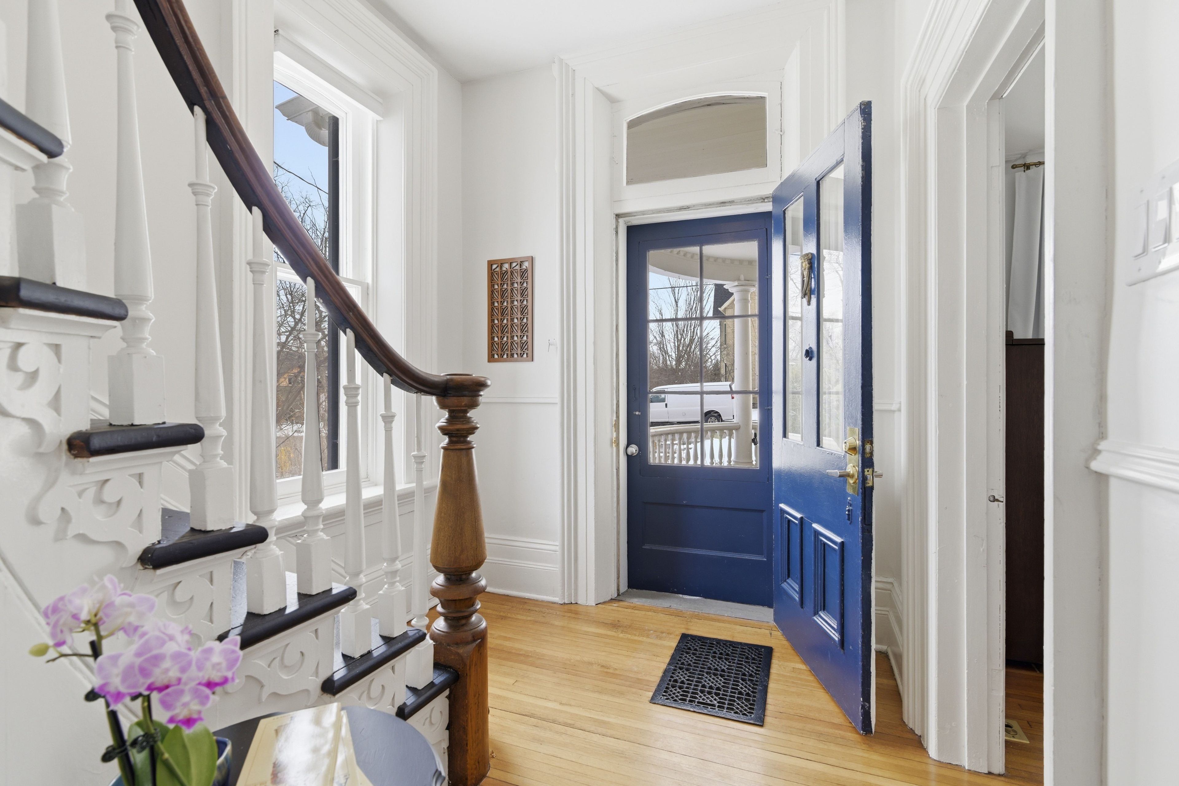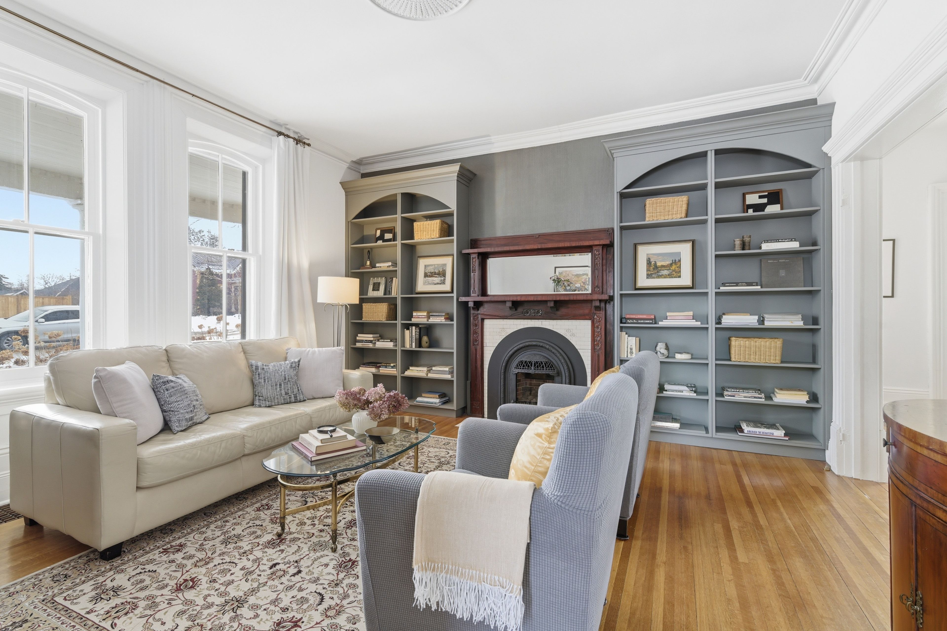 This beautifully preserved circa 1880 century home is set on a prominent corner lot along one of the town's most picturesque streets. Offering over 3,200 sq ft, the property balances architectural character with thoughtful modern upgrades, including a newer roof and furnace. Exceptional curb appeal is defined by extensive gardens, a wraparound porch, decorative trim, and classic shutters that speak to the craftsmanship of its era. Inside, a grand foyer introduces a sweeping curved staircase accented by ornate millwork and soaring ceilings. The main floor features 10-foot ceilings and an abundance of original details, including oversized baseboards, period trim, tall windows with transoms, chair rails, and original cold air returns. Six well-defined living spaces offer both elegance and versatility: a formal living room with gas fireplace insert, central dining room, parlour with french doors, warm and inviting kitchen, private office with adjacent bathroom, and a beautifully rebuilt conservatory with original stained glass transoms providing a peaceful, light-filled retreat. The kitchen is anchored by a centre island with granite countertops and stainless steel appliances, and the main-floor office is ideal for a home-based workspace. Upstairs, 9. 5-foot ceilings continue the sense of openness. A generous landing offers space for a reading nook. The principal bedroom features an electric fireplace, large walk-in closet with custom organizers, and excellent natural light. Two additional bedrooms are generously sized and complemented by a 3-piece bath with soaker tub and a second 3-piece bath with shower. The dry basement with 8' ceilings provides ample storage space, a washer, dryer, hot water heater (rented), owned water softener, and utility sink. Homes of this calibre and character rarely come to market. A true uxbridge landmark, offering timeless beauty, thoughtful updates, and a setting that feels both special and welcoming.