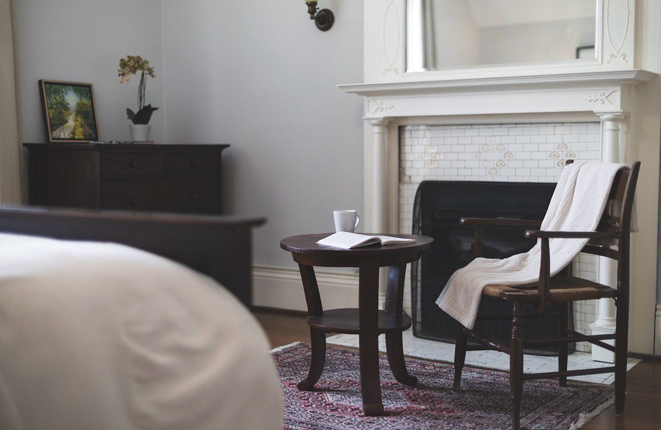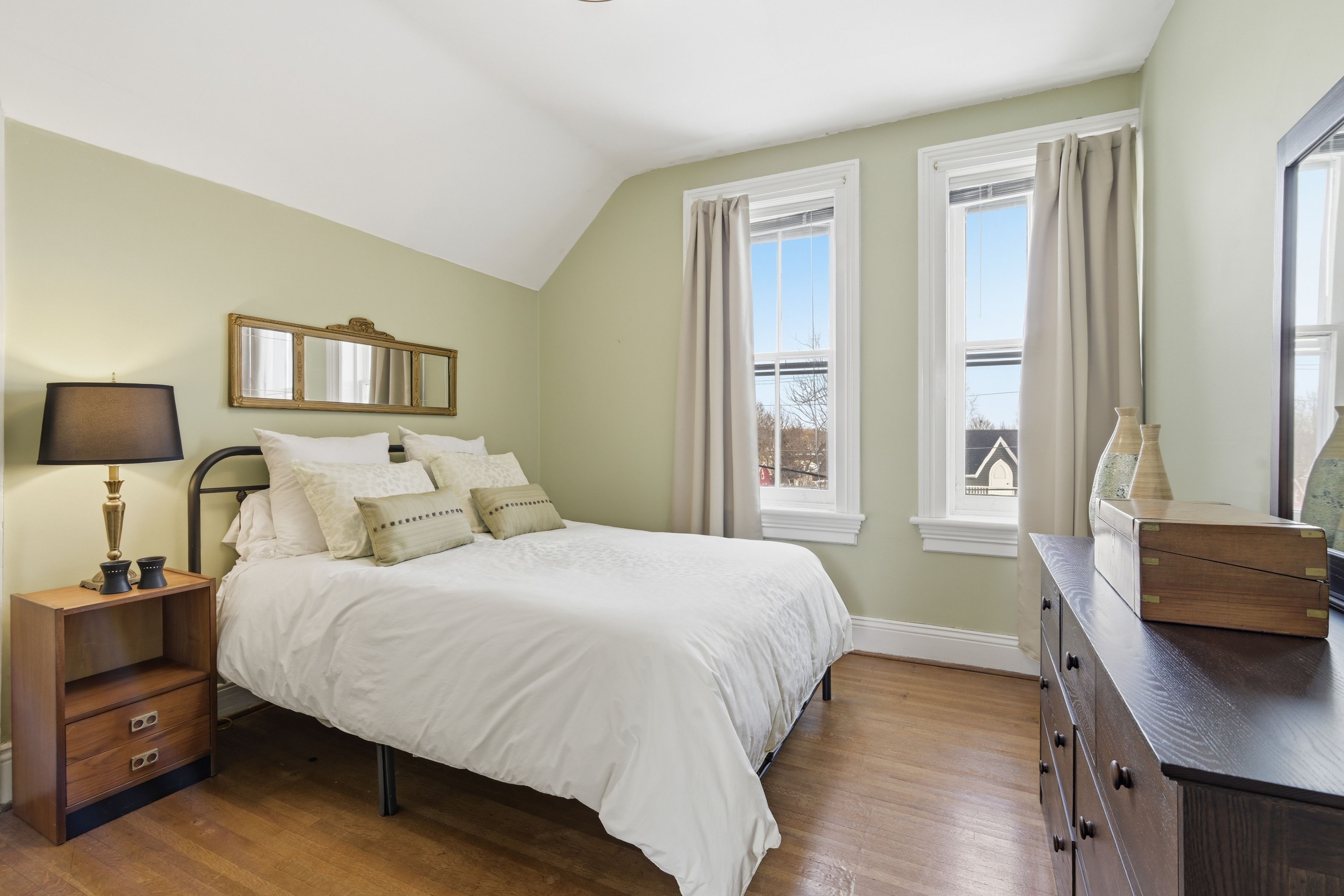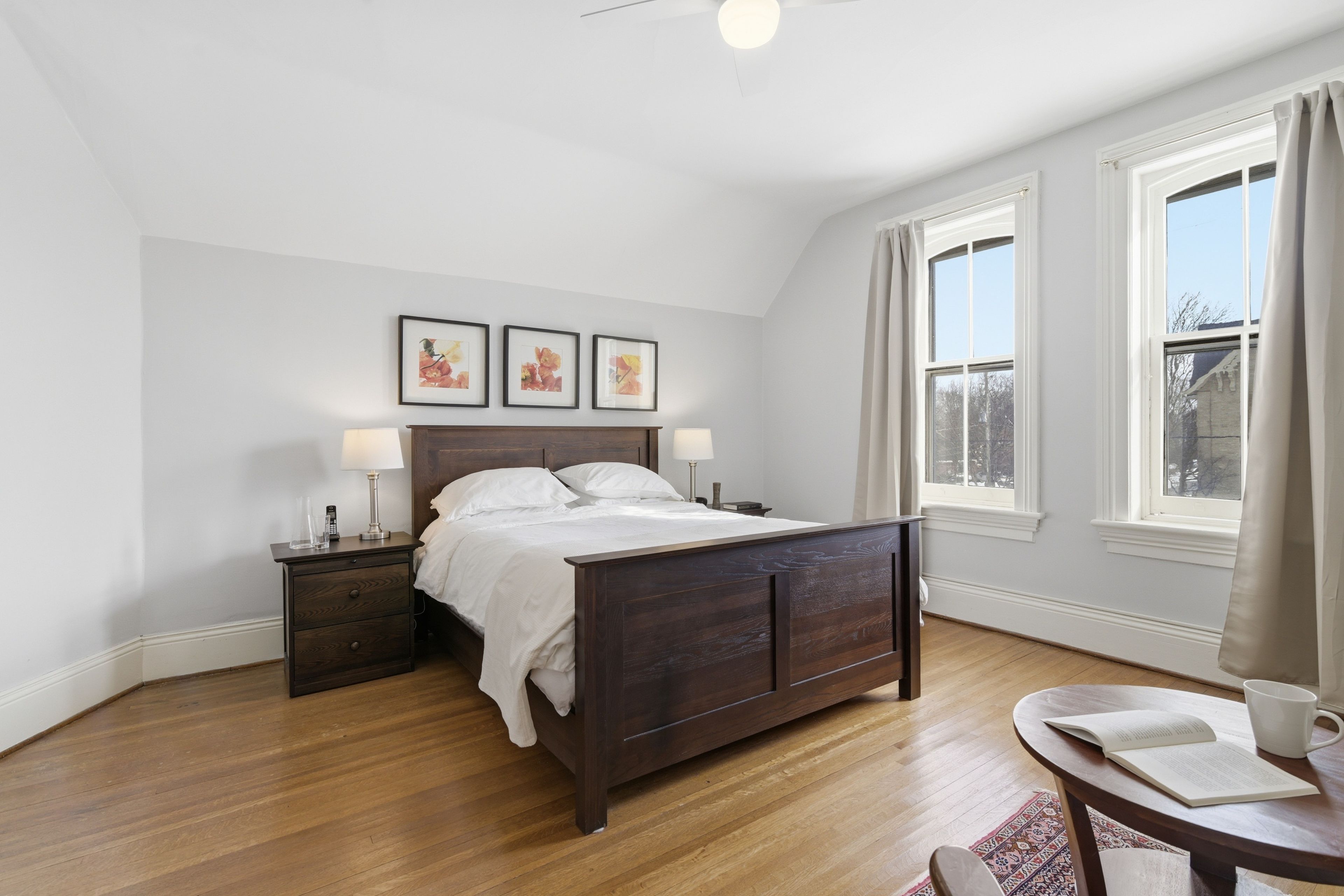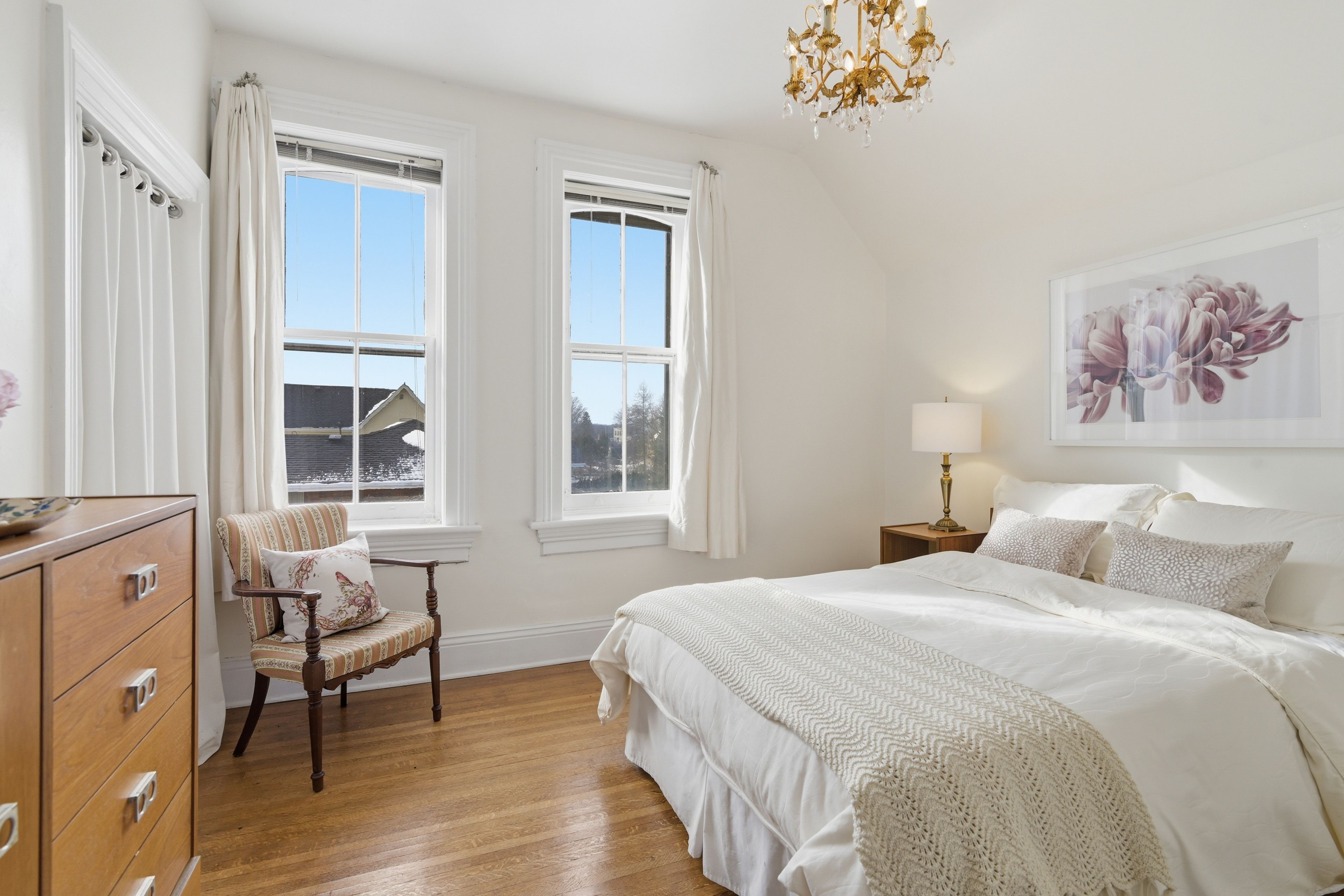 • Generous principal bedroom with fireplace, walk-in closet, and natural light.
