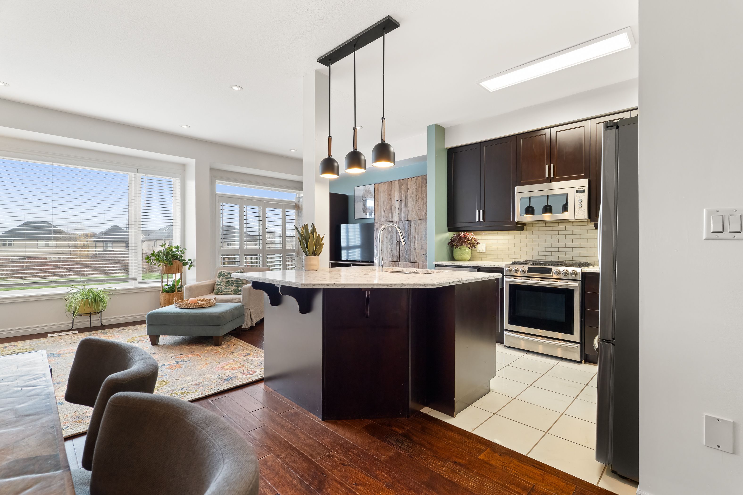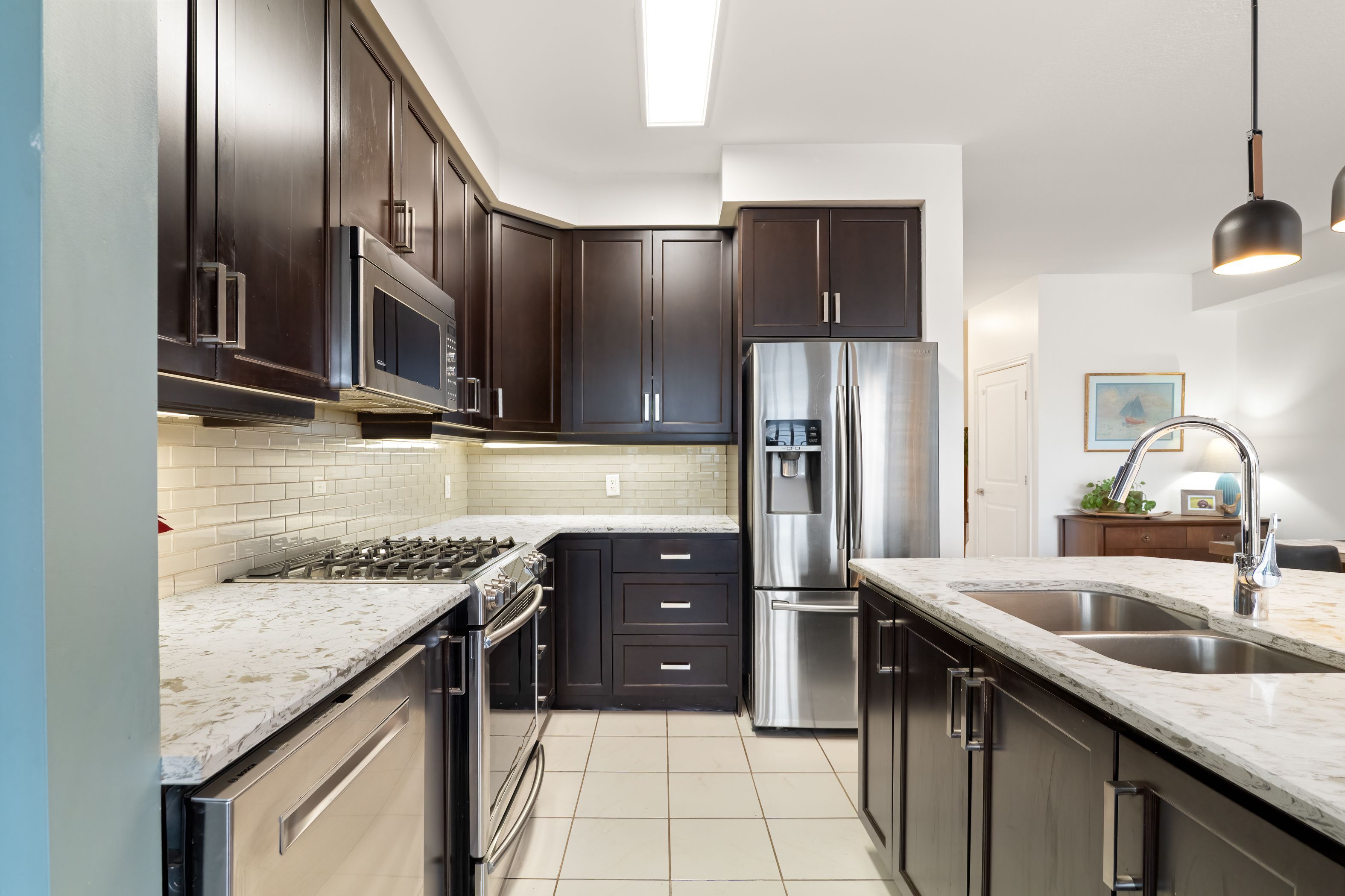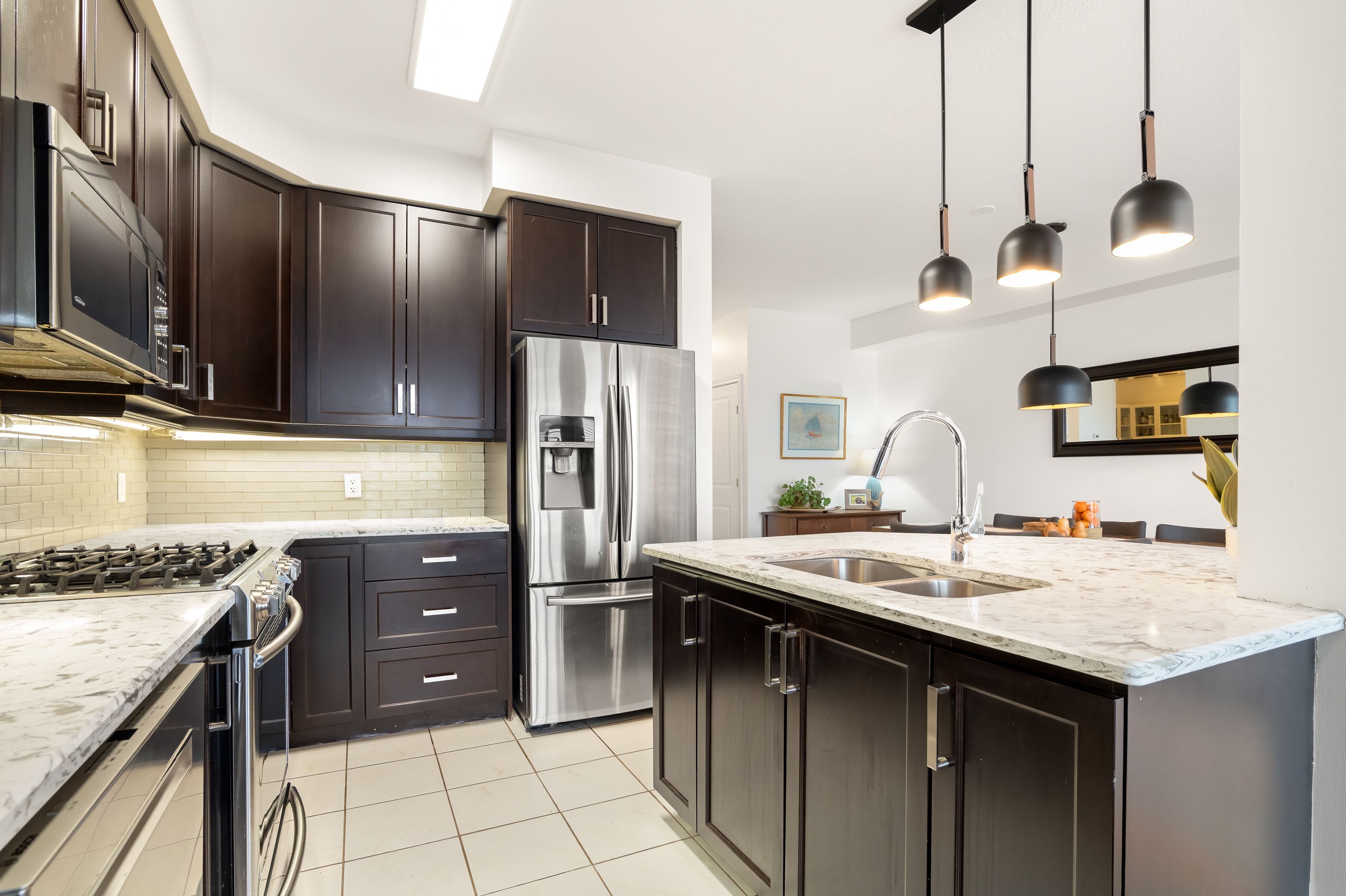 • Modern eat-in kitchen with stainless steel appliances and quartz countertops.