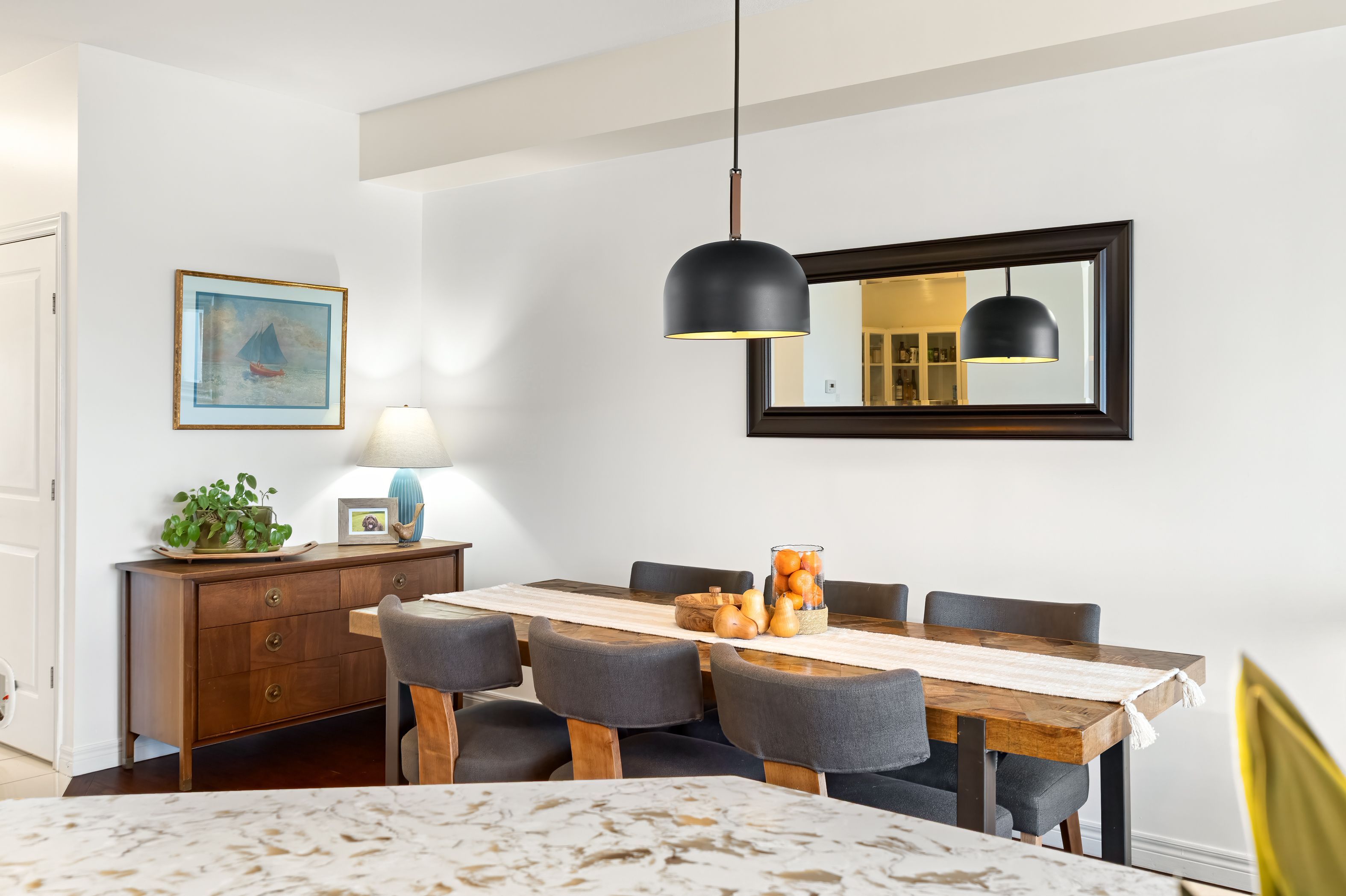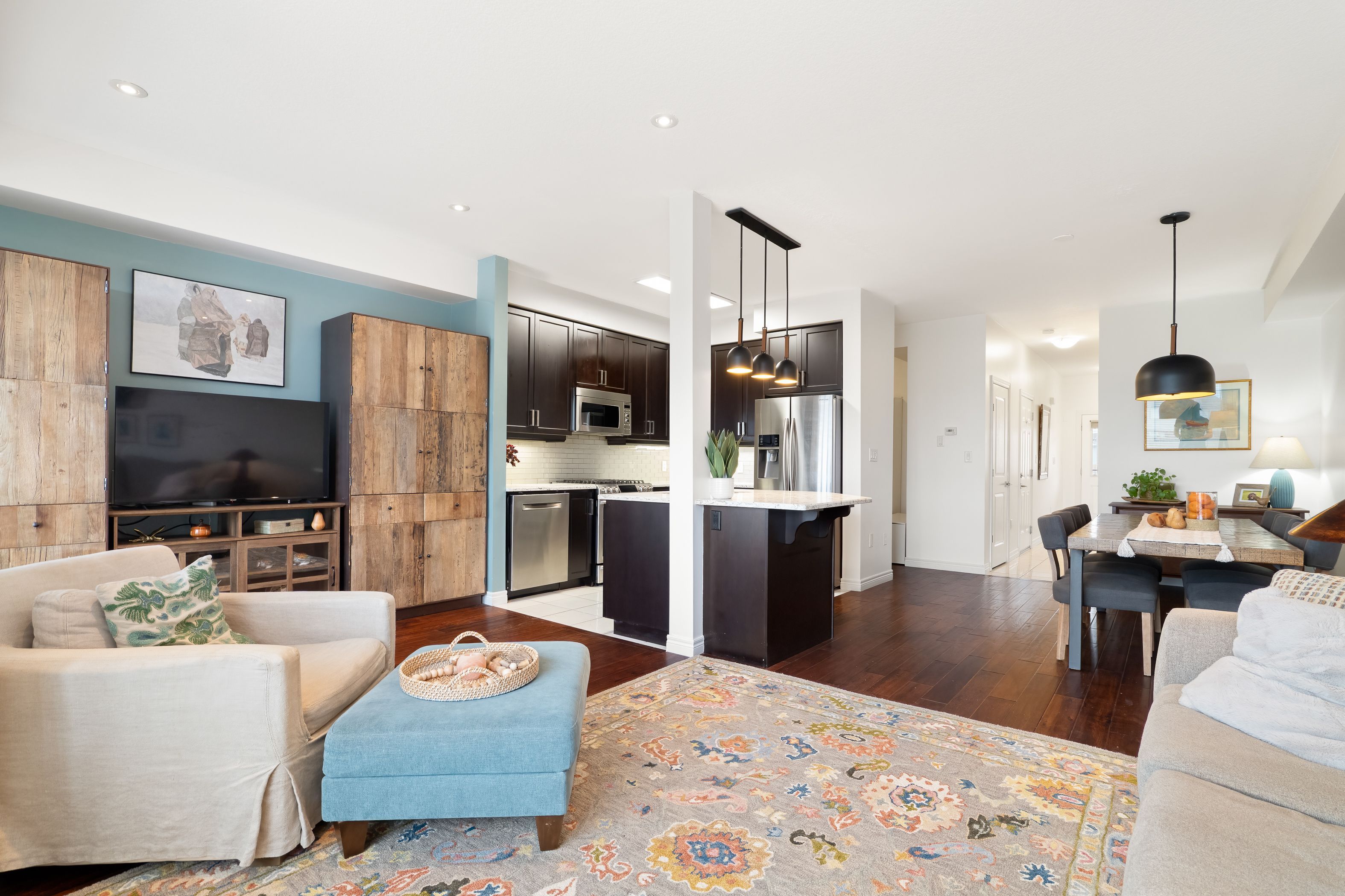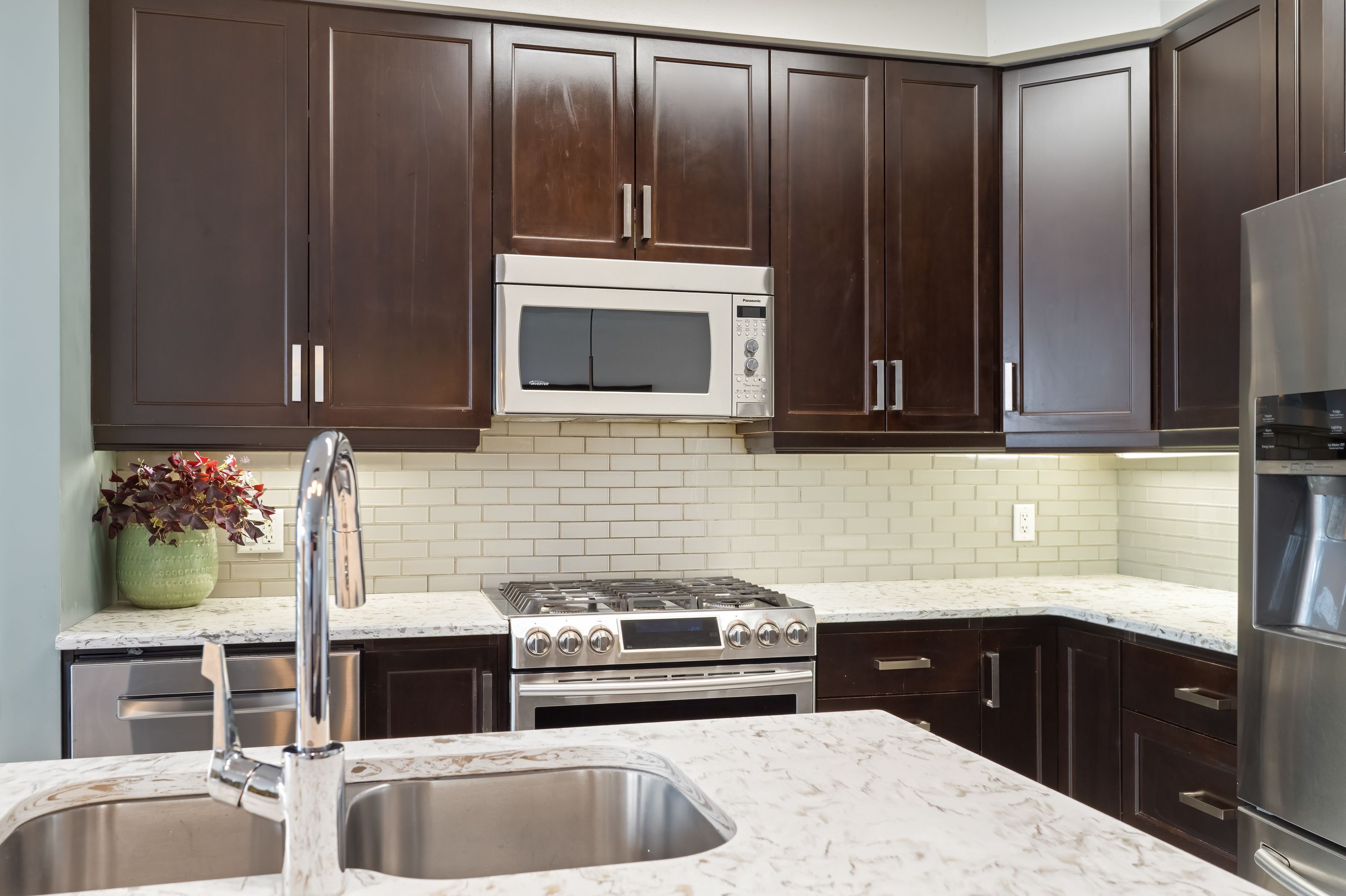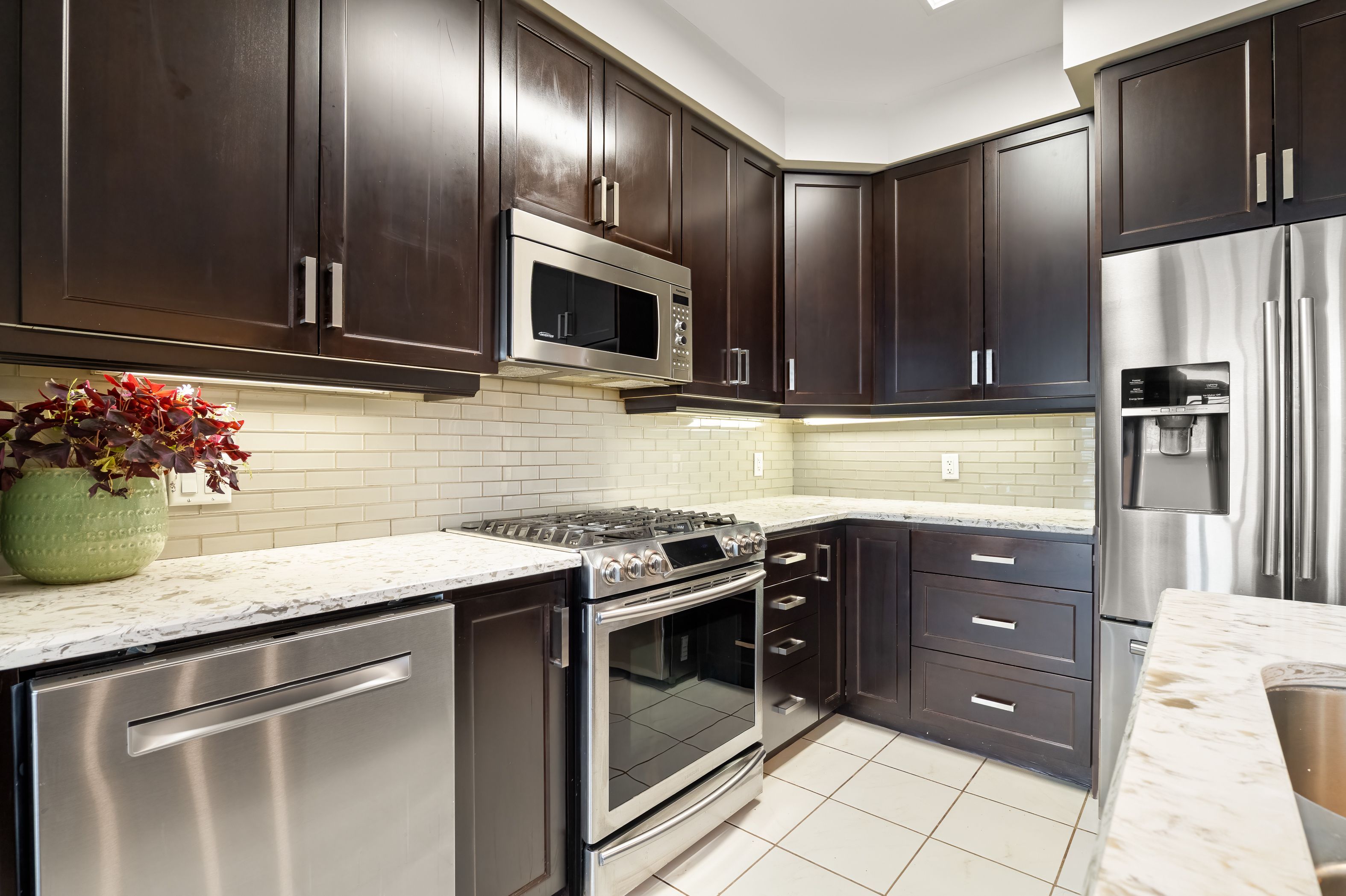 • Modern eat-in kitchen with stainless steel appliances and quartz countertops.