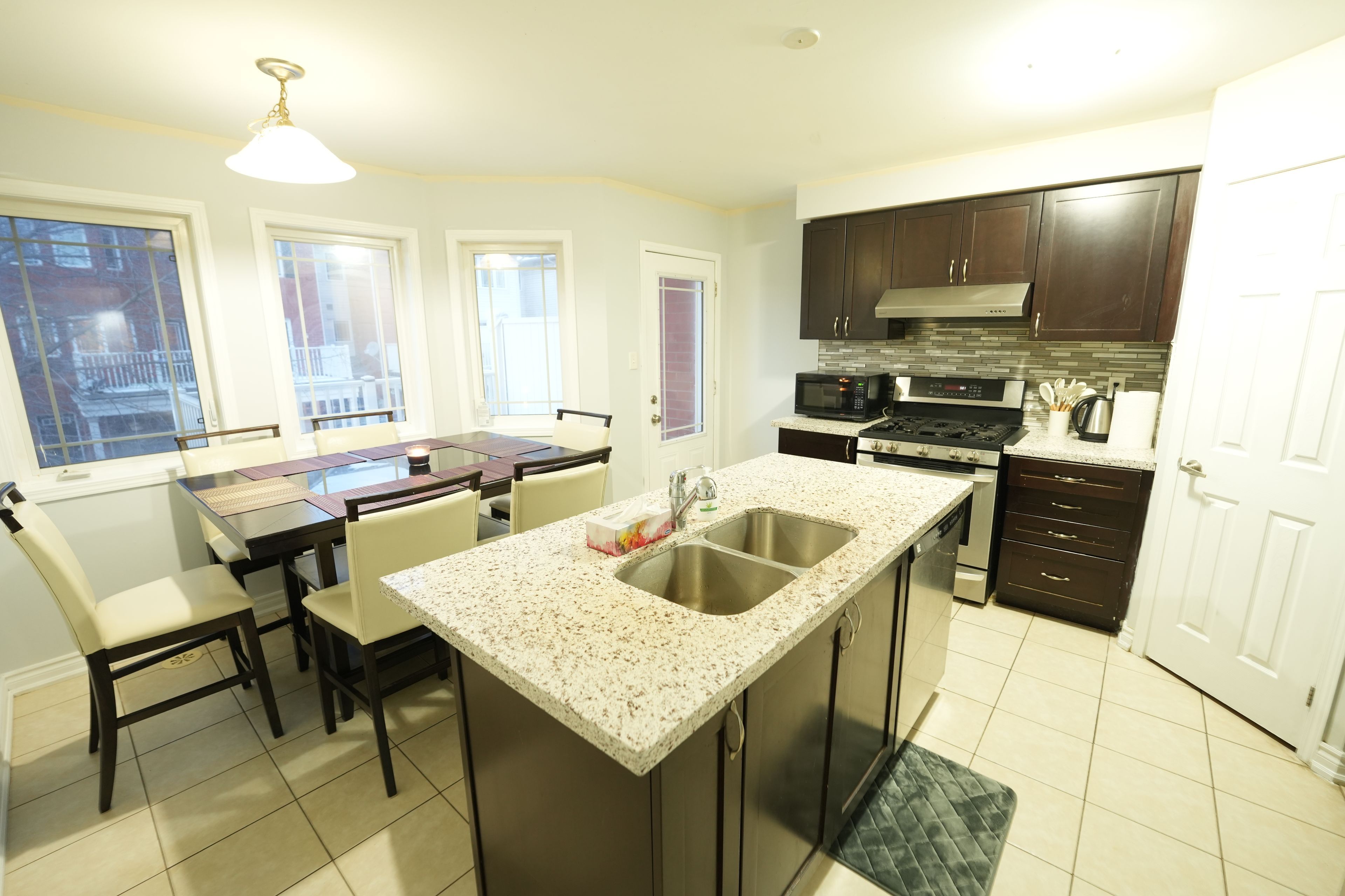 • Open-concept kitchen with granite counters and stainless steel appliances.