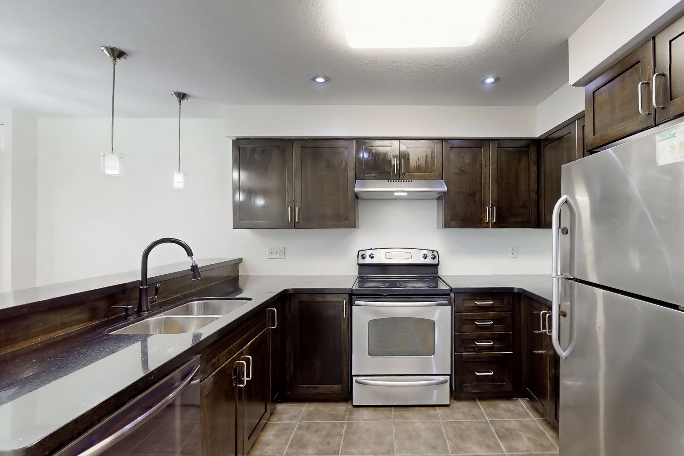 • Modern kitchen featuring granite countertops and stainless steel appliances.