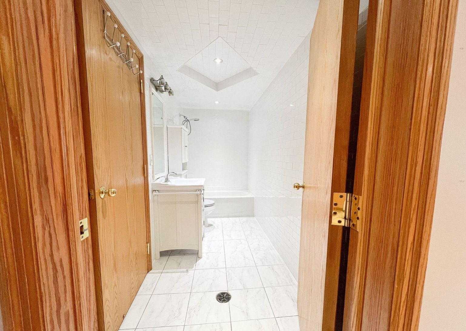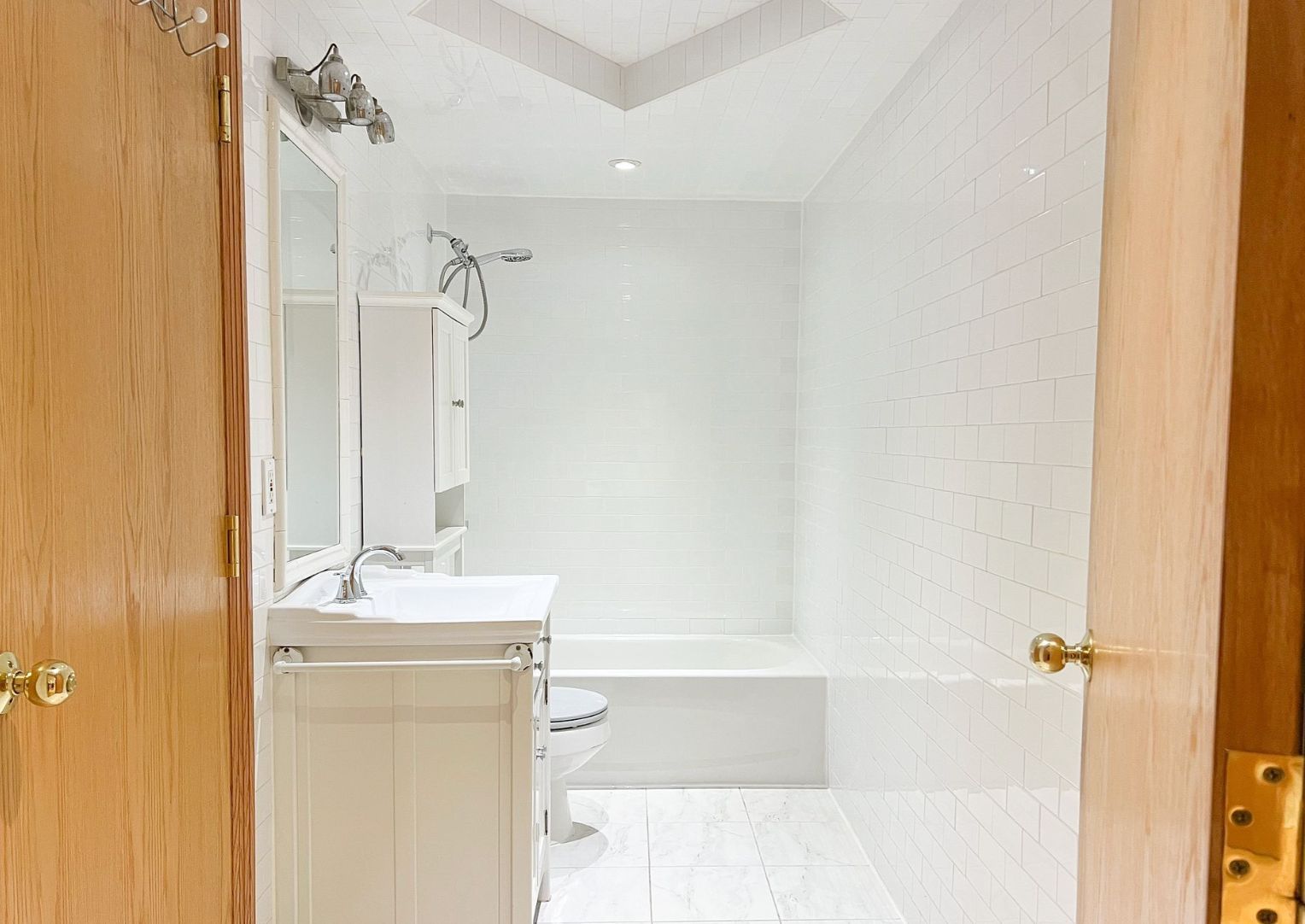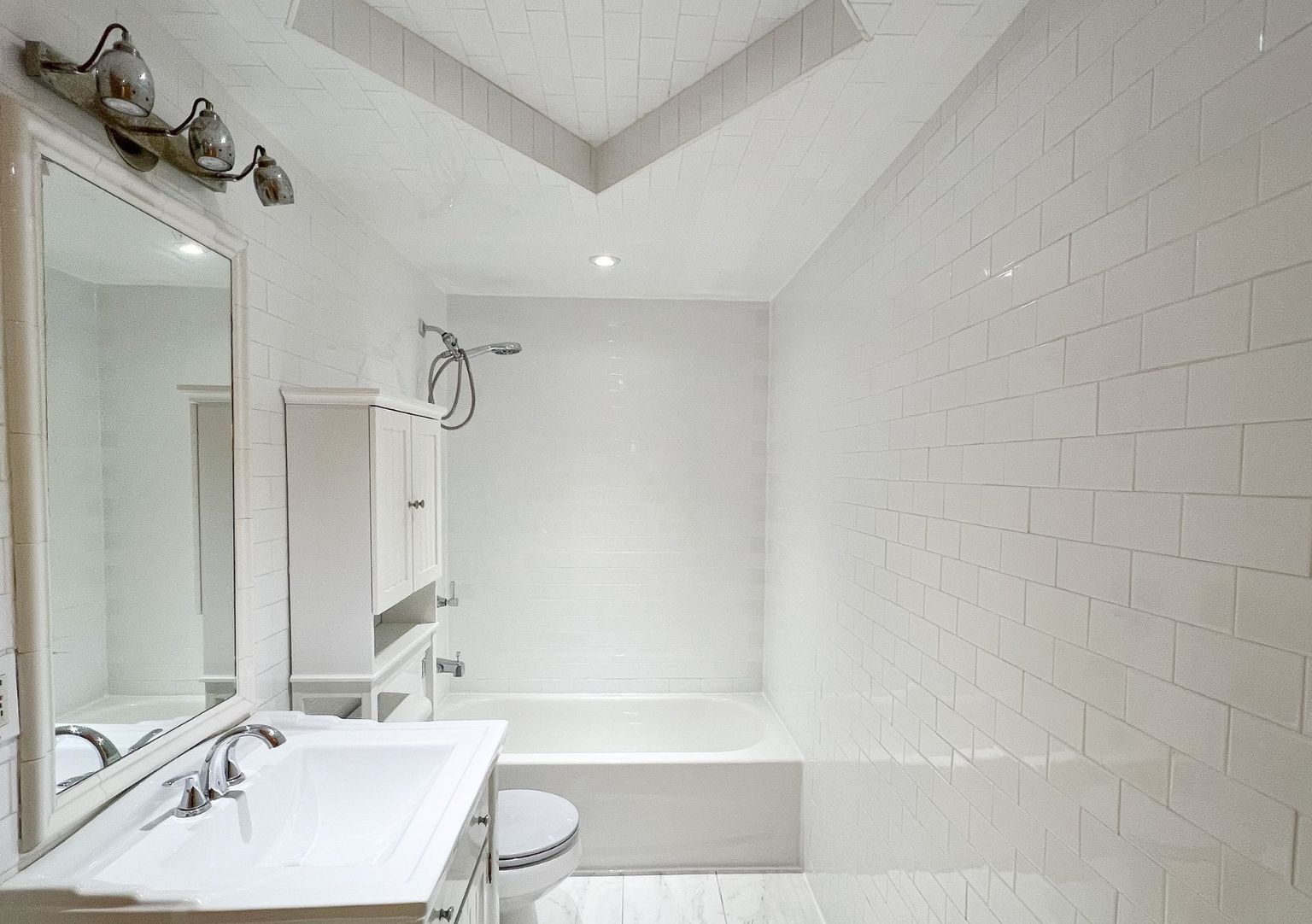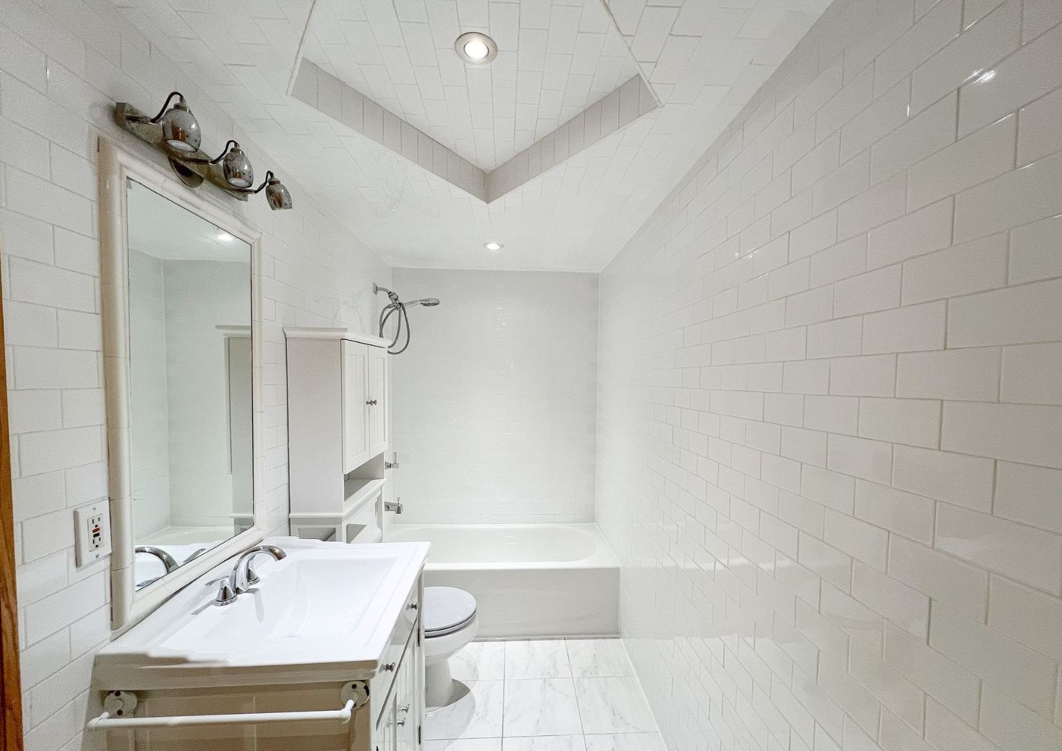 • Renovated bathroom with stylish white tiling for a modern feel.
