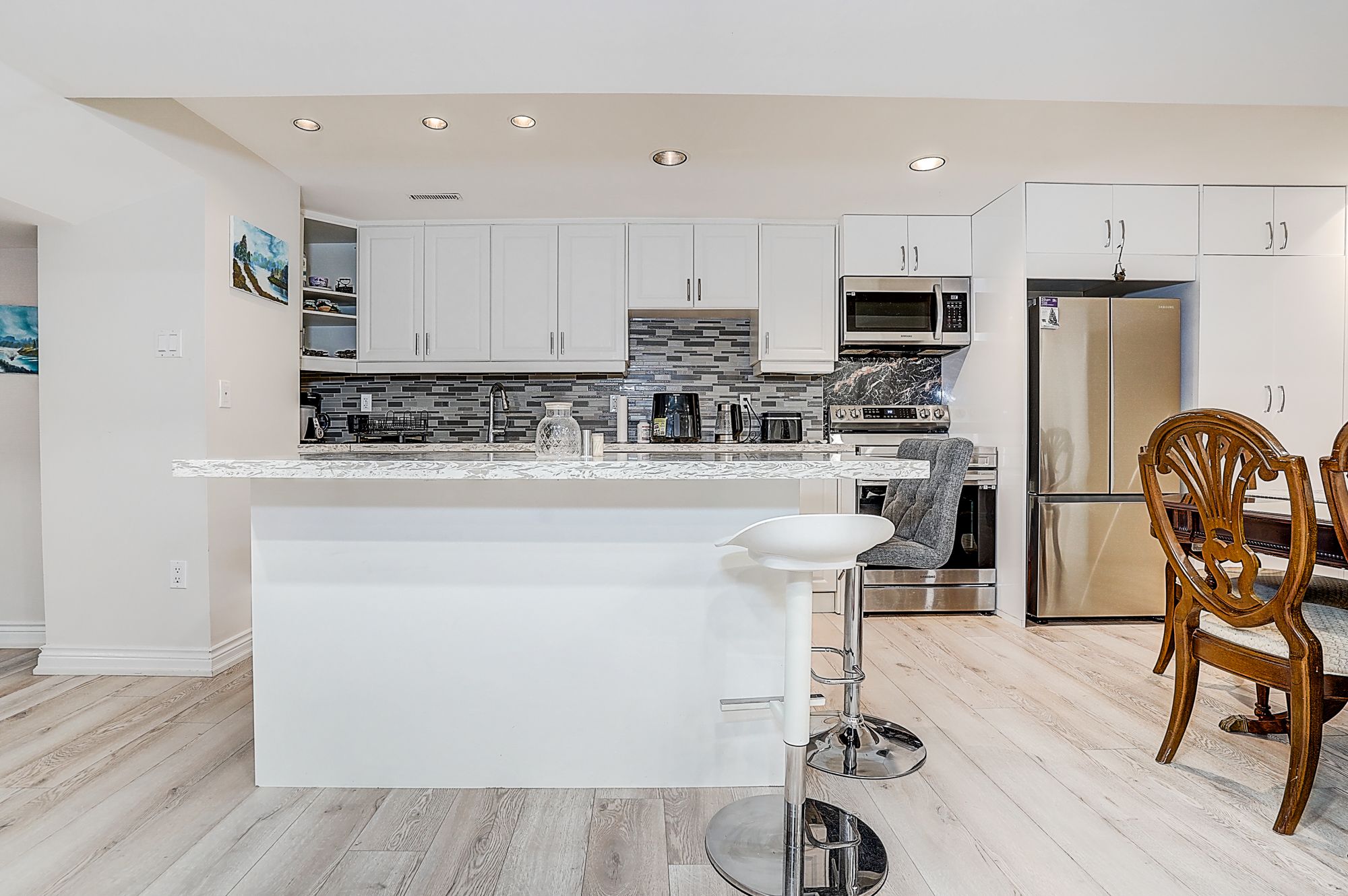 • Chef's kitchen features new appliances and a breakfast bar.
