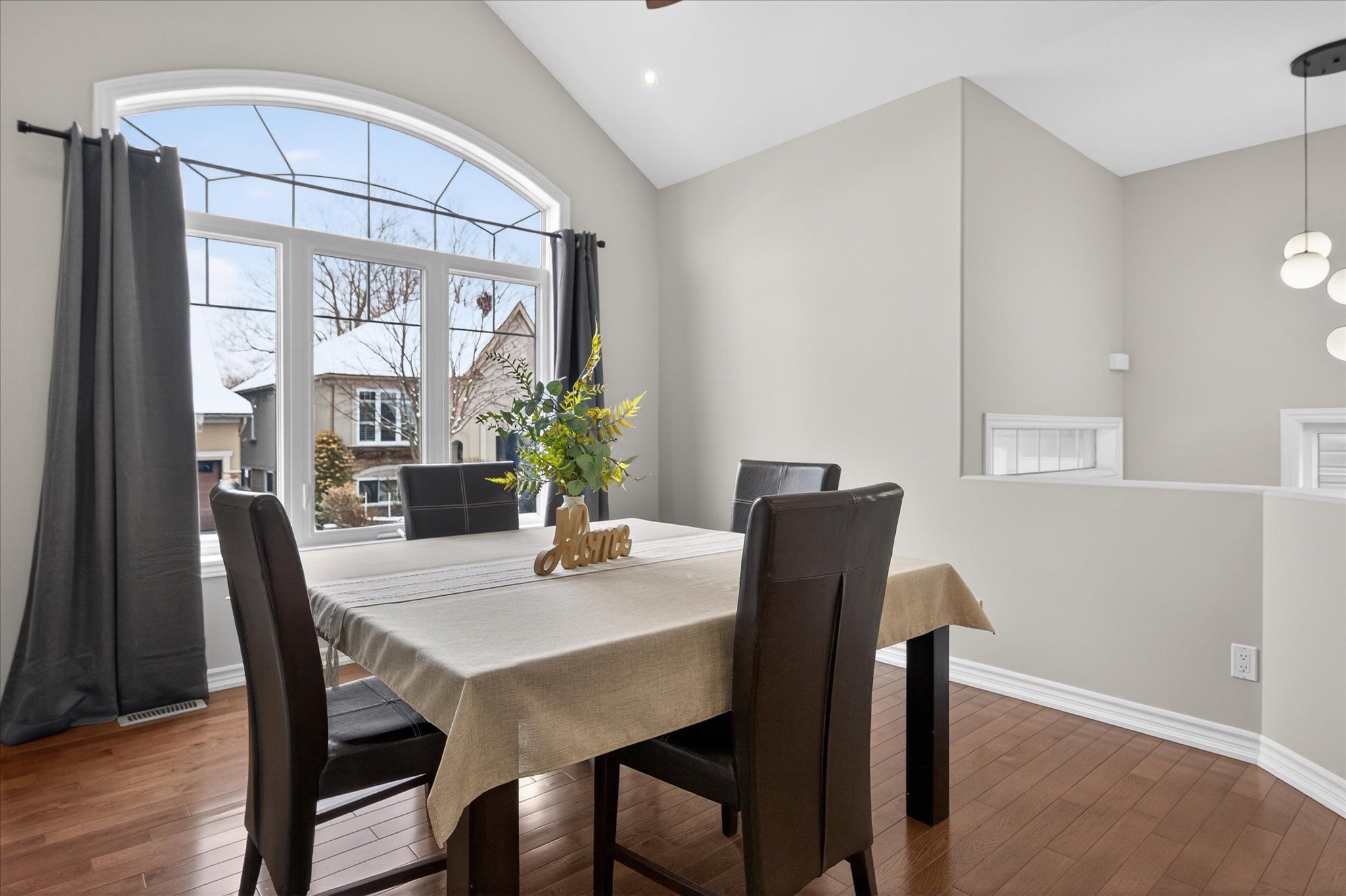 • Bright open-concept kitchen, dining area with vaulted ceiling, and spacious living room.