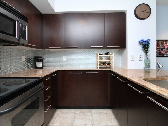 • Modern kitchen with granite countertops and stainless steel appliances.
